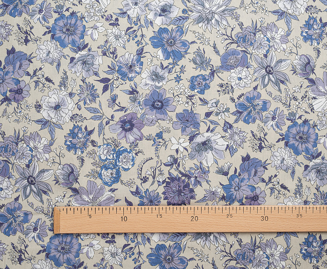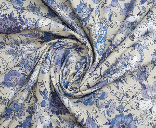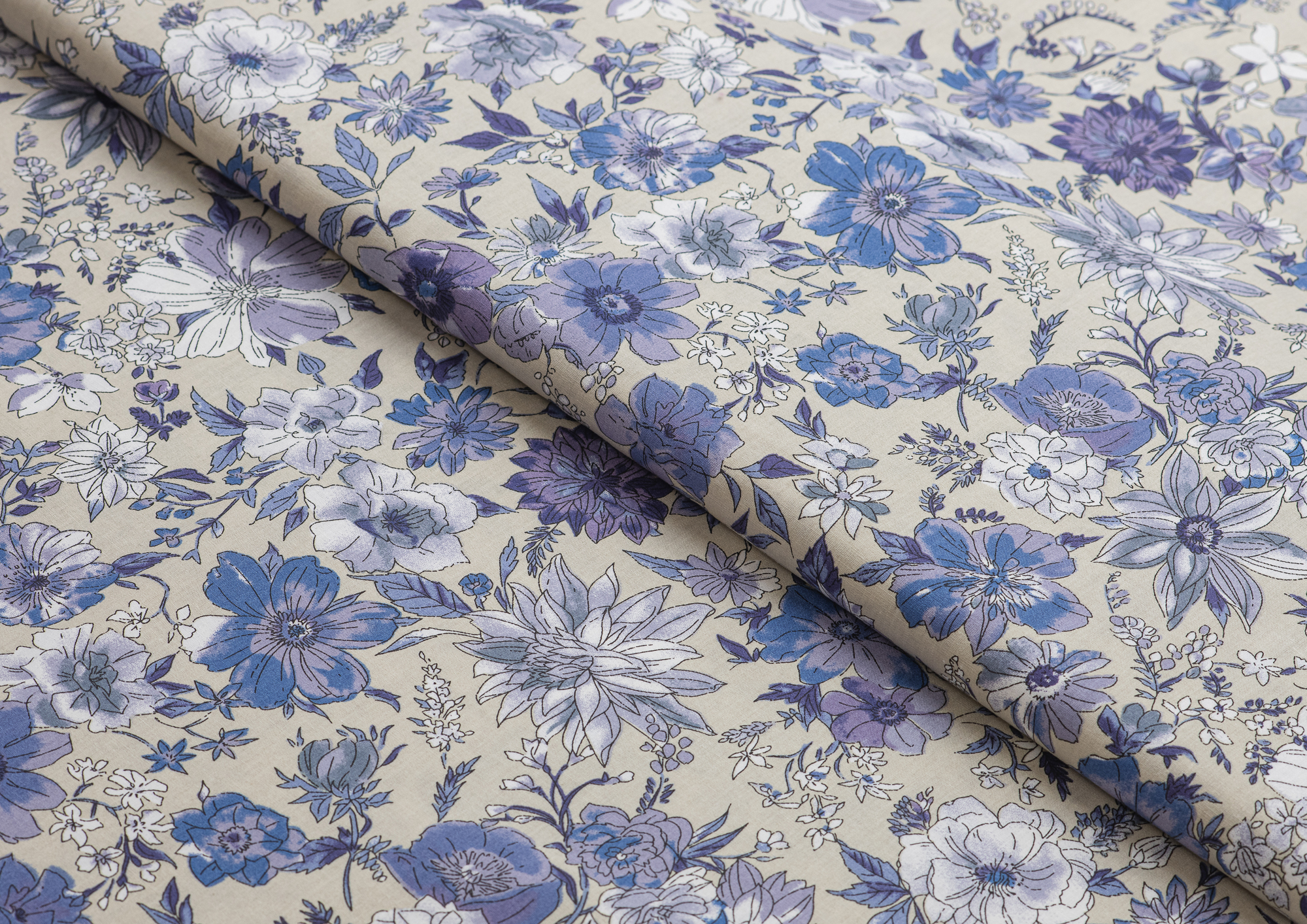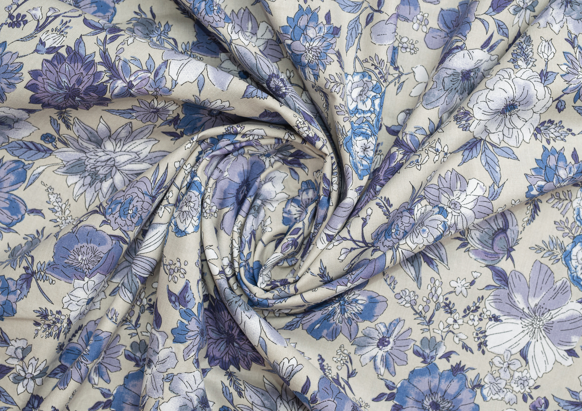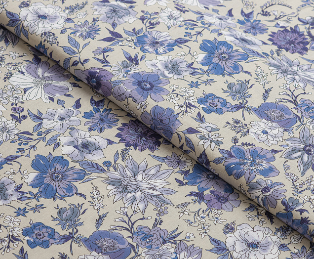 Ткань Поплин стрейч принт Синие цветы на бежевом фоне
