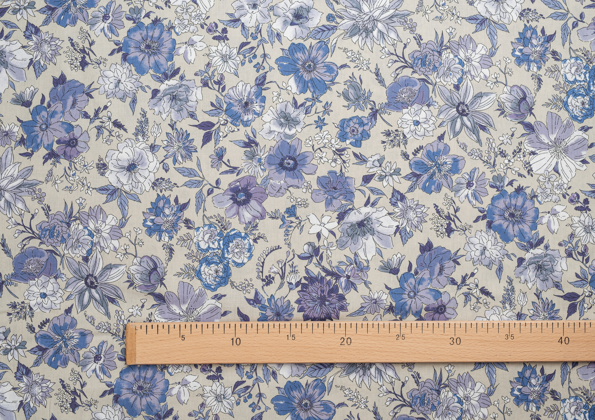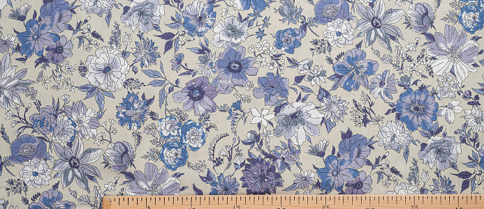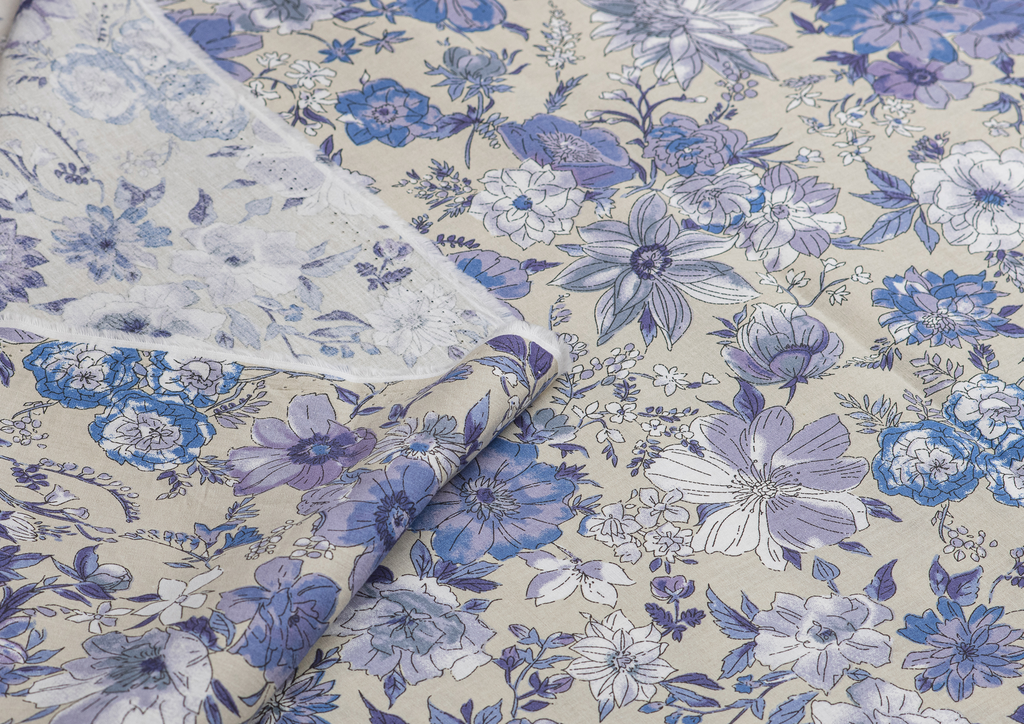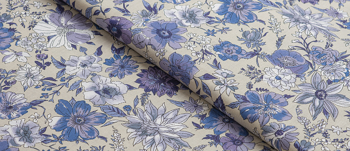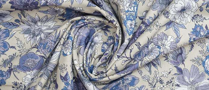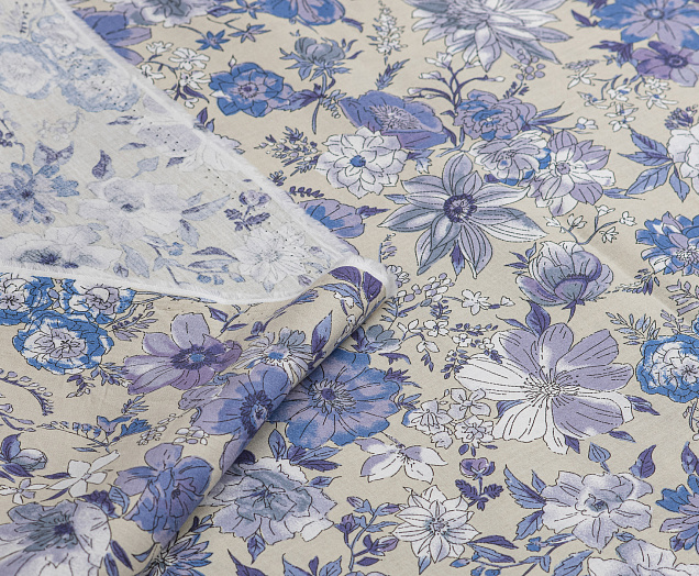 Ткань Поплин стрейч принт Синие цветы на бежевом фоне