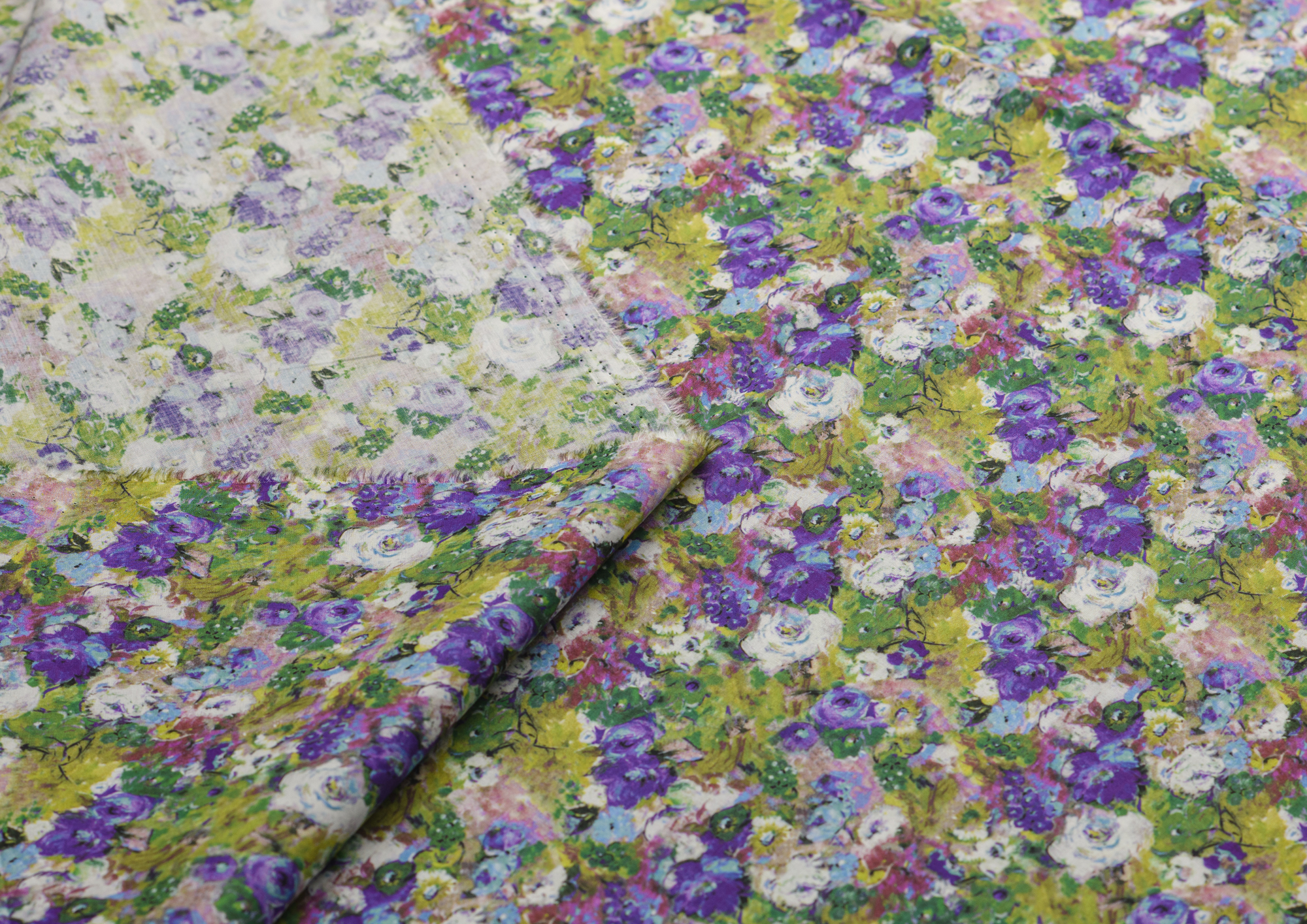 Ткань Поплин стрейч принт Цветы белые/фиолетовые