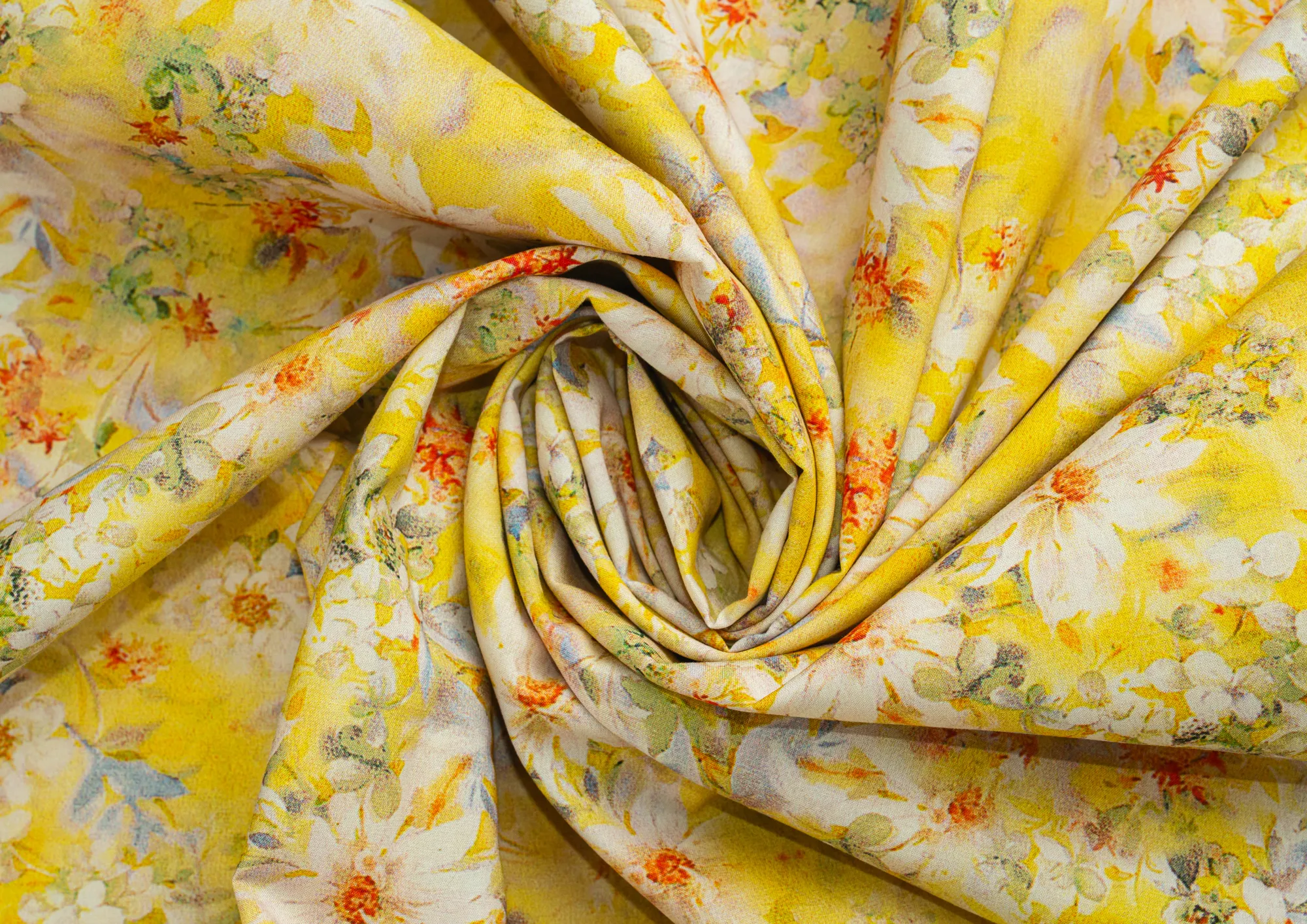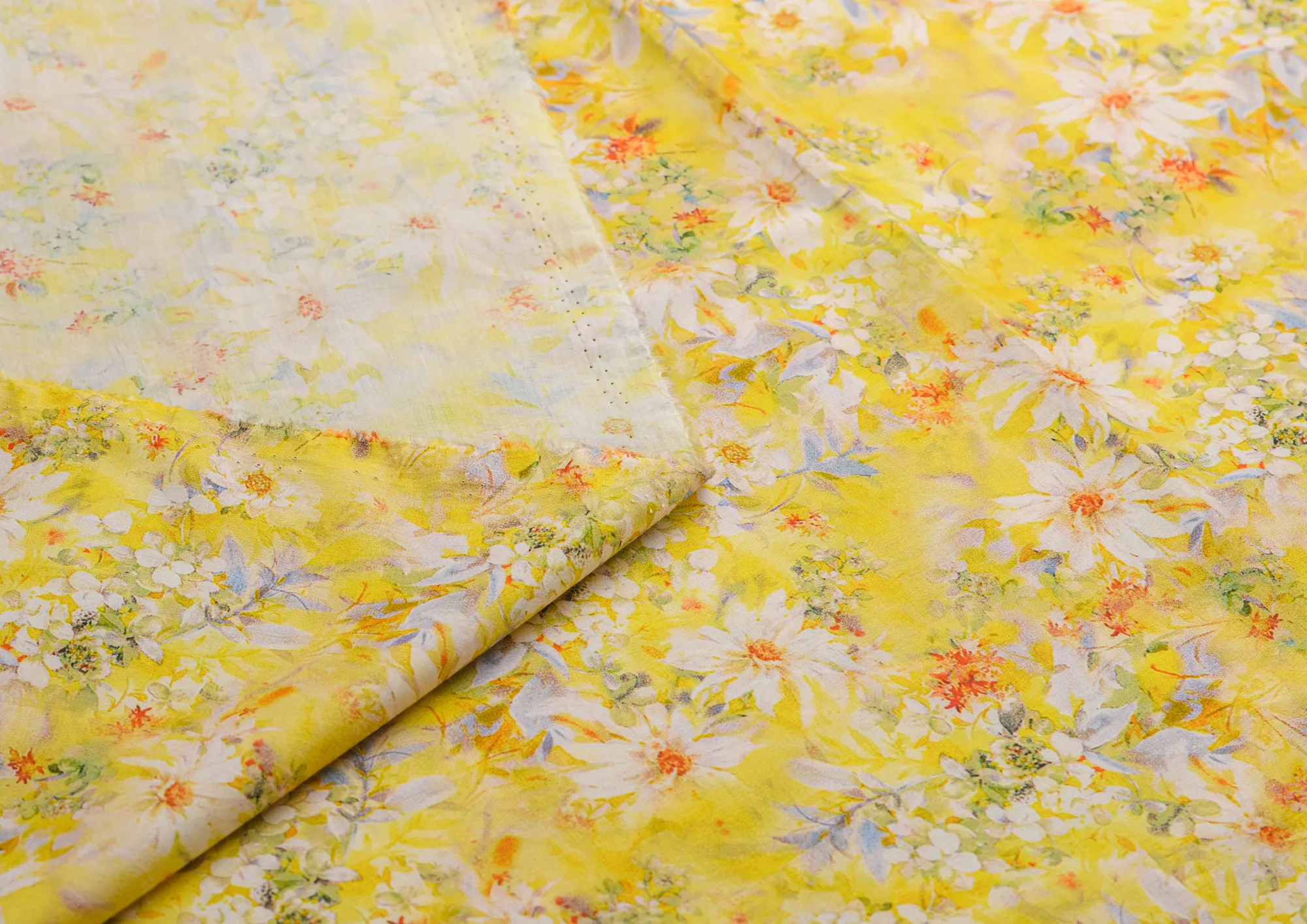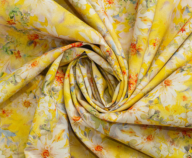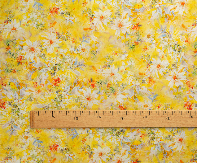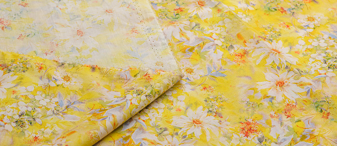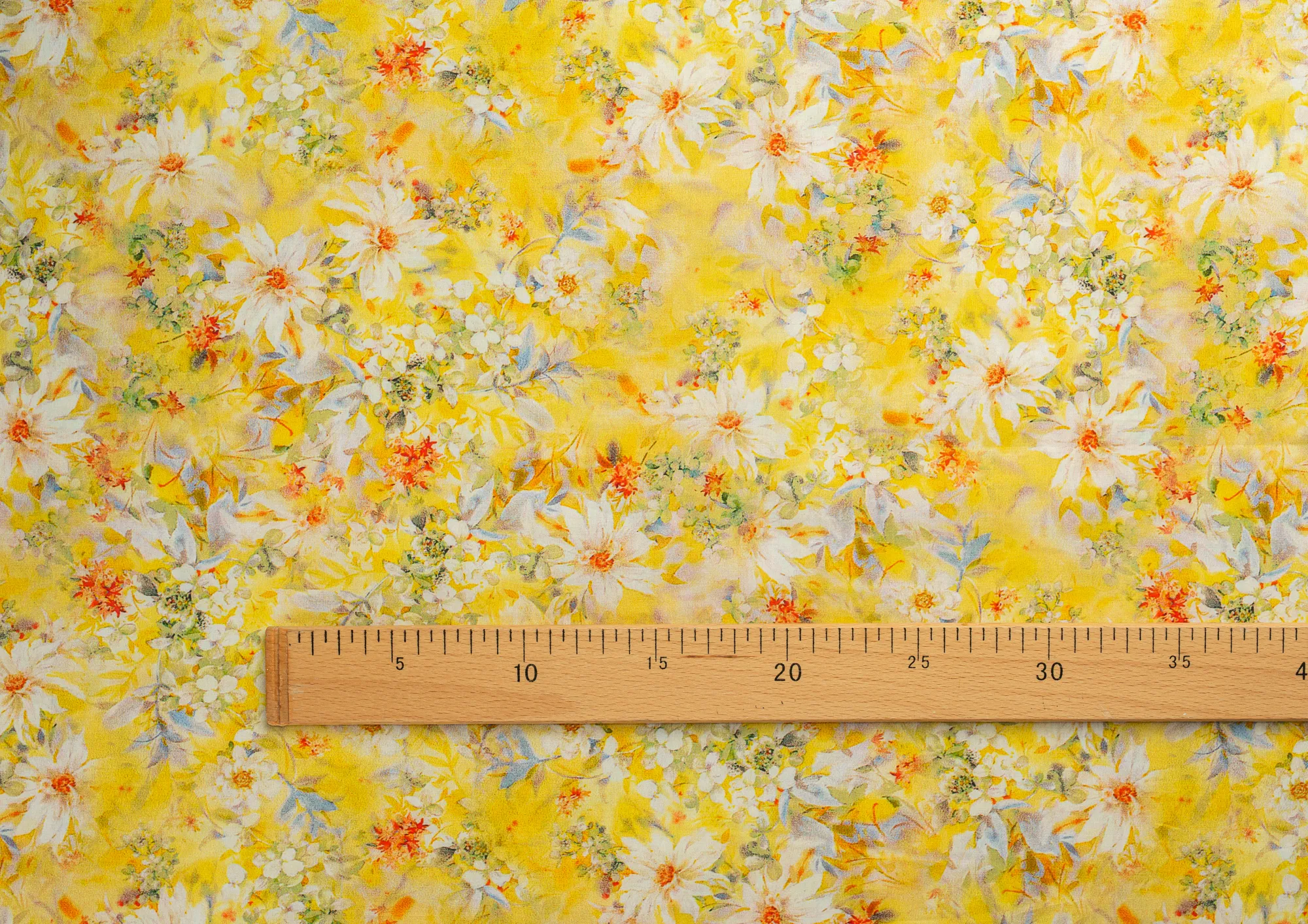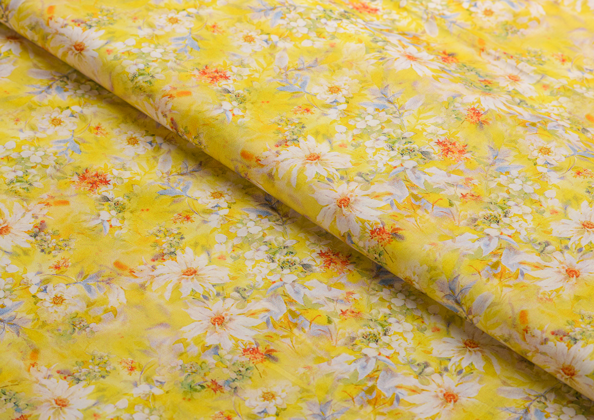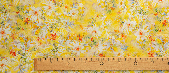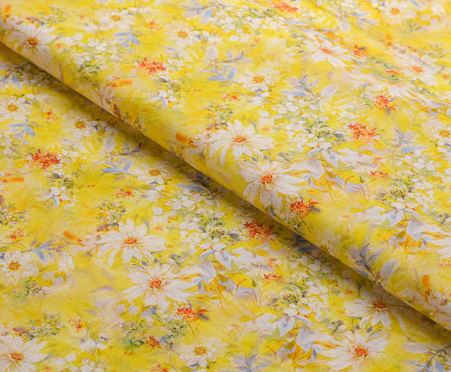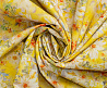 Ткань Поплин стрейч принт Цветы белые на желтом