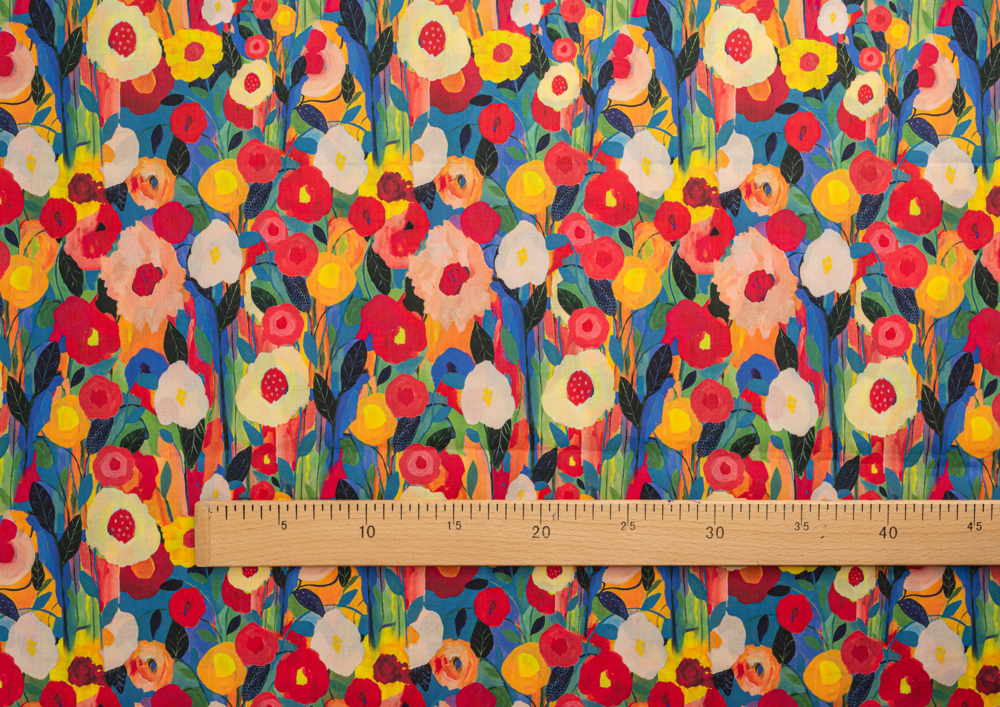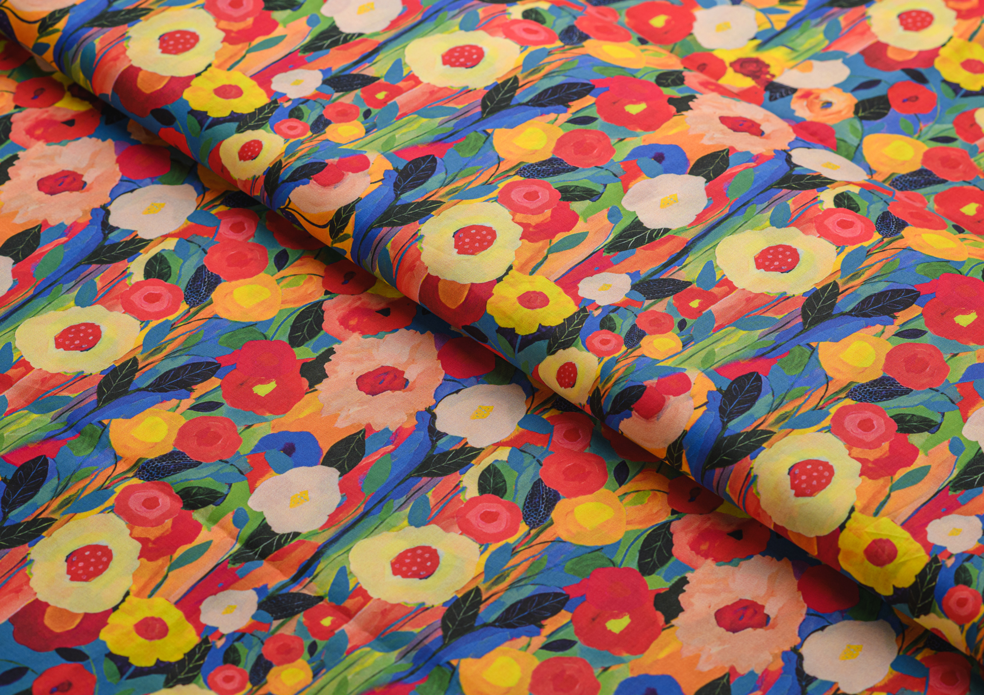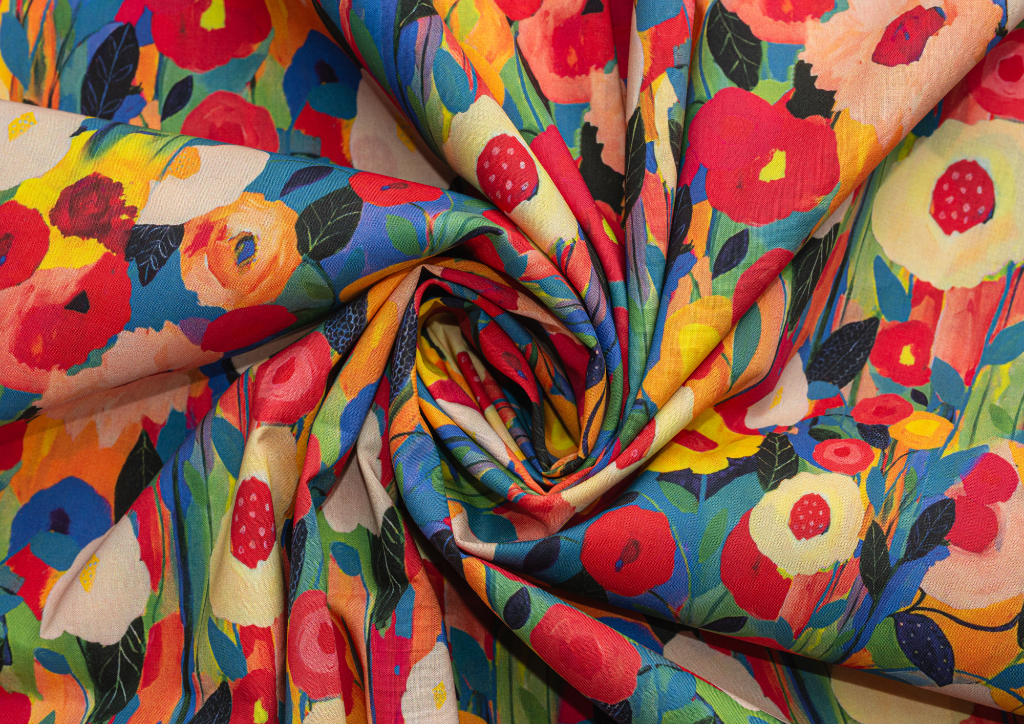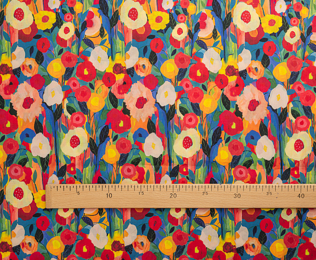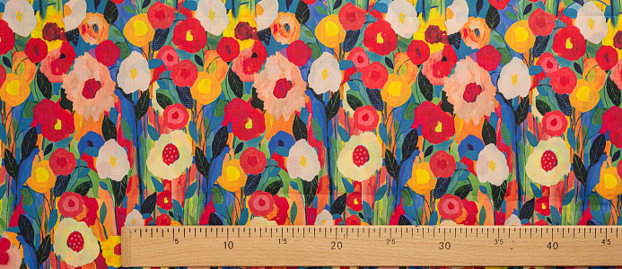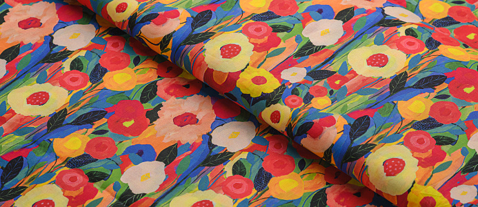 Ткань Поплин стрейч принт Цветы красные/желтые