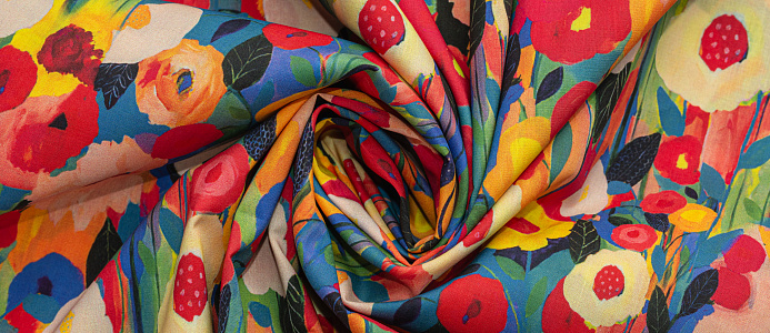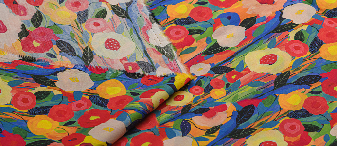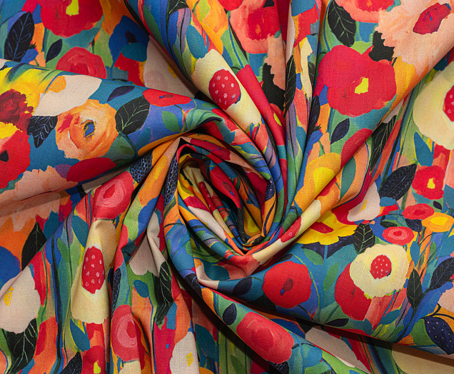 Хлопковая, средней плотности ткань с эластаном. По всей поверхности полотна расположен принт. Ткань тонкая, при этом прочная, хорошо держит форму. Отлично подходит для пошива платьев, сарафанов, мужских и женских рубашек .