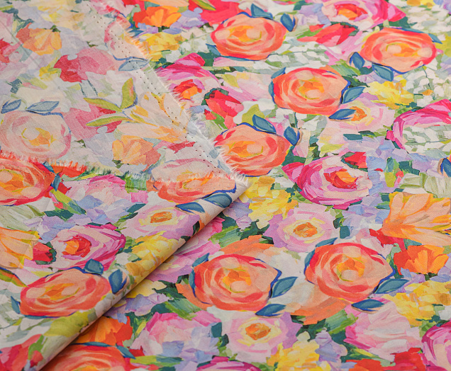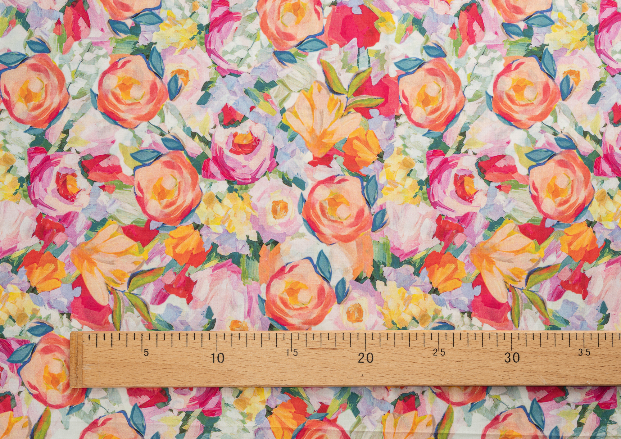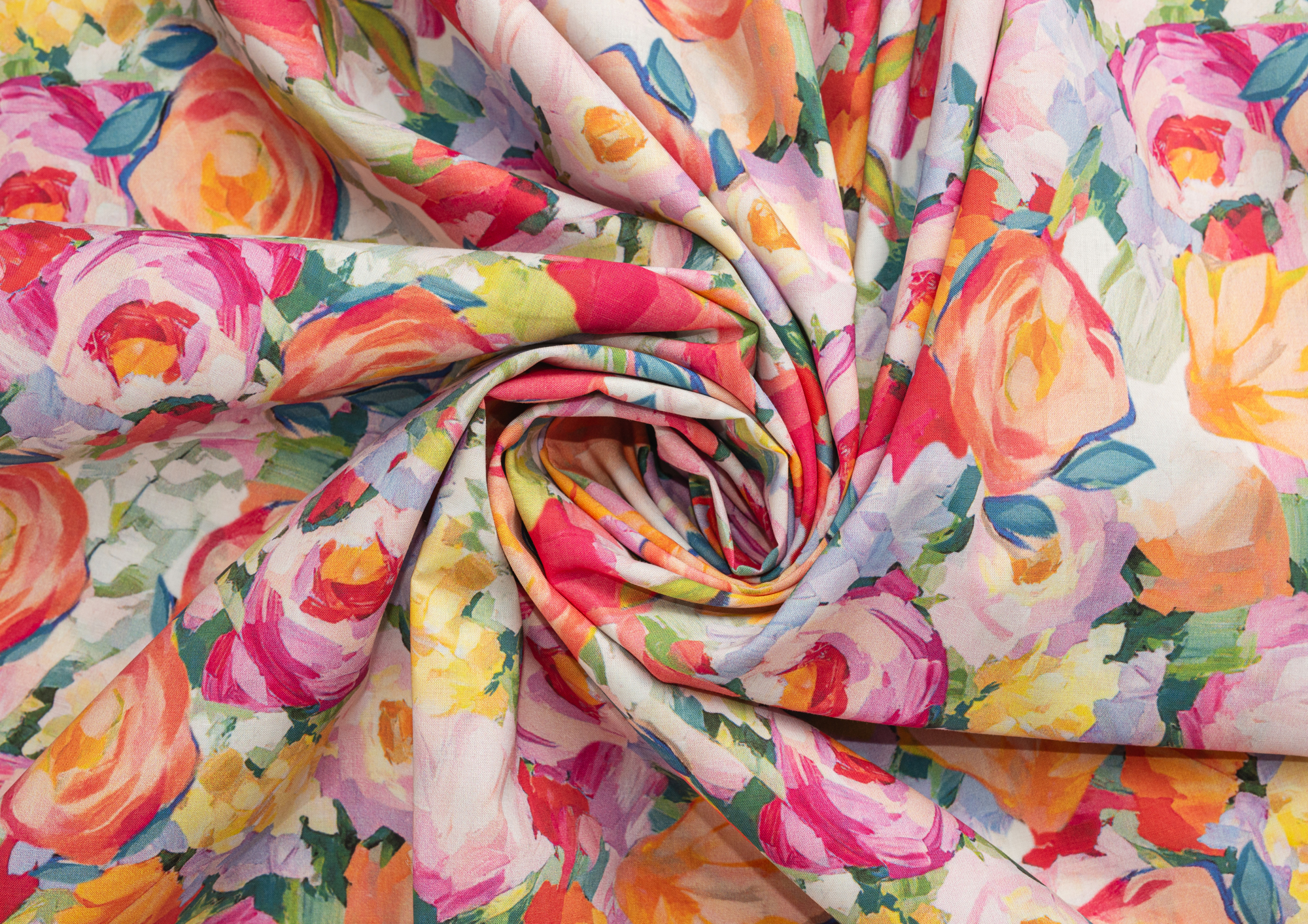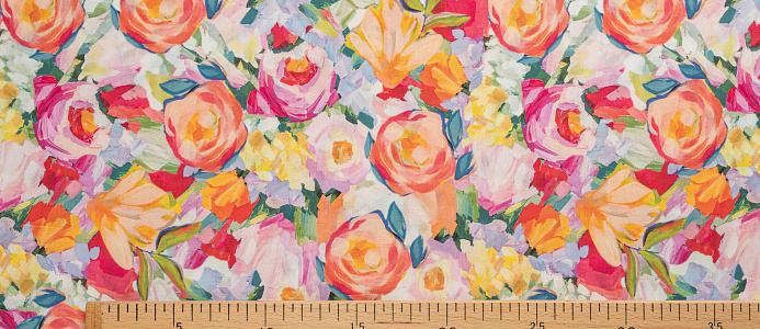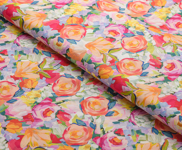 Ткань Поплин стрейч принт Цветы розовые/оранжевые