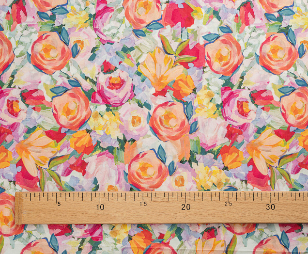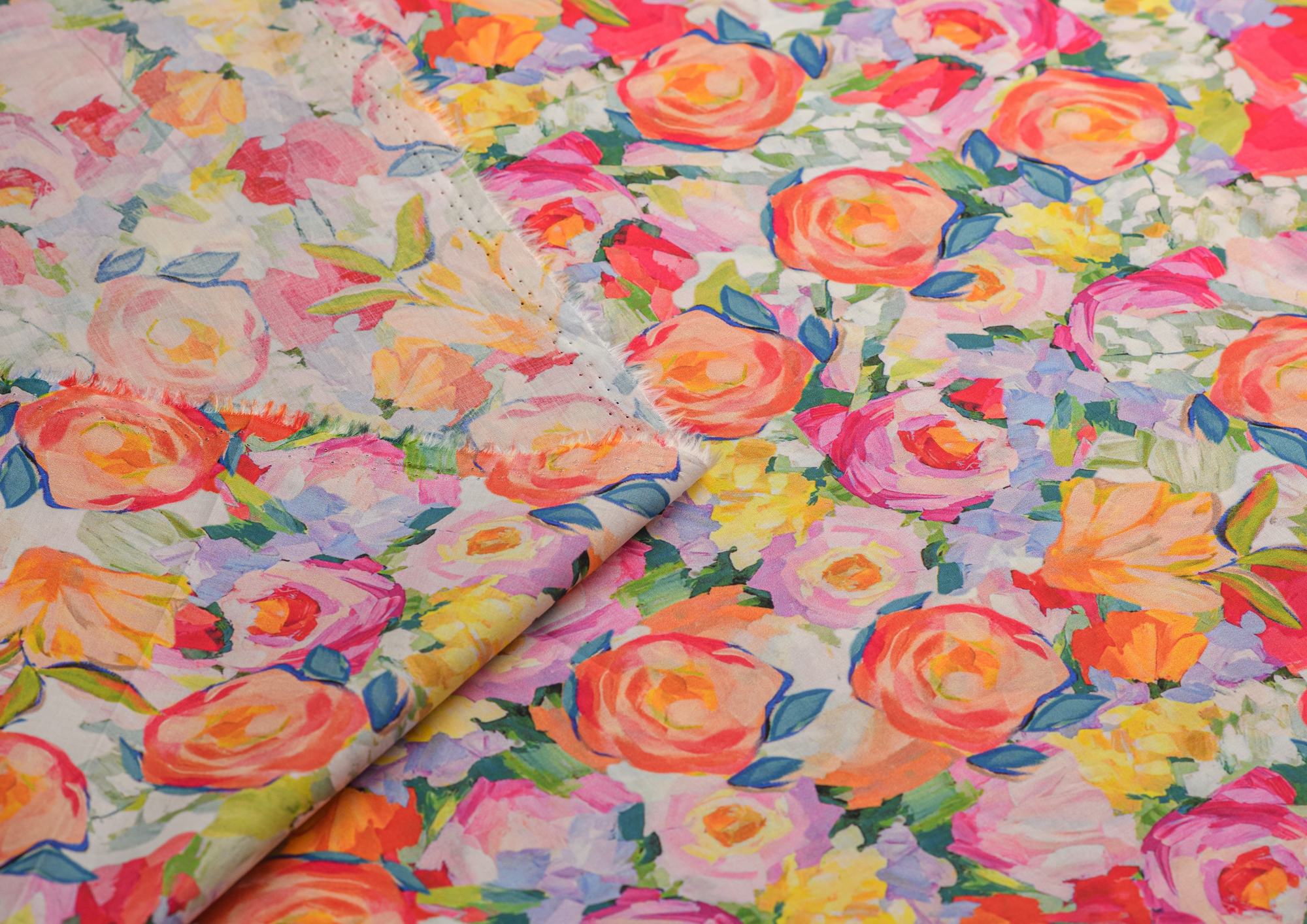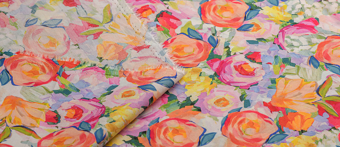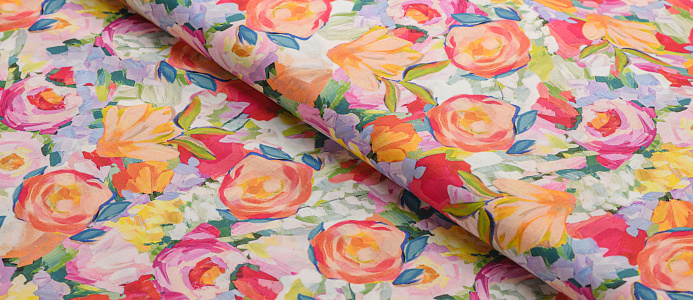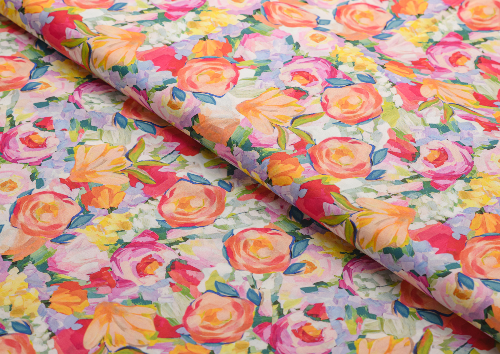 Ткань Поплин стрейч принт Цветы розовые/оранжевые