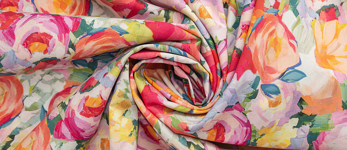 Хлопковая, средней плотности ткань с эластаном. По всей поверхности полотна расположен принт. Ткань тонкая, при этом прочная, хорошо держит форму. Отлично подходит для пошива платьев, сарафанов, мужских и женских рубашек .