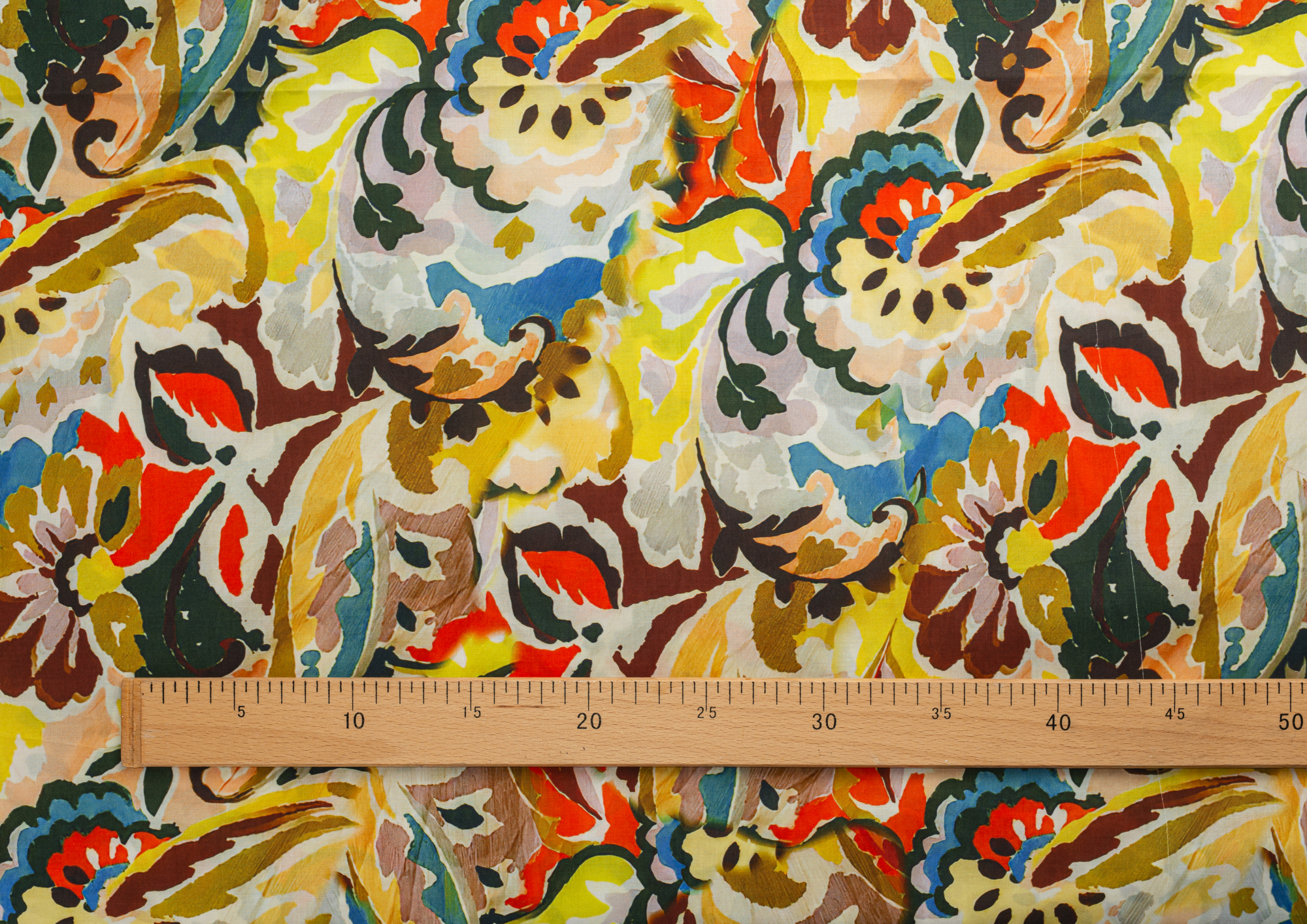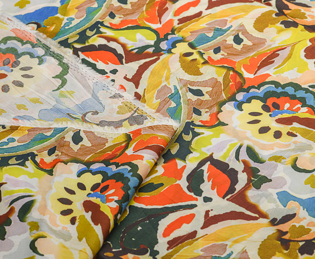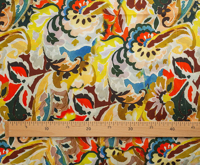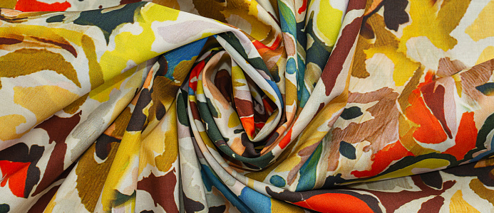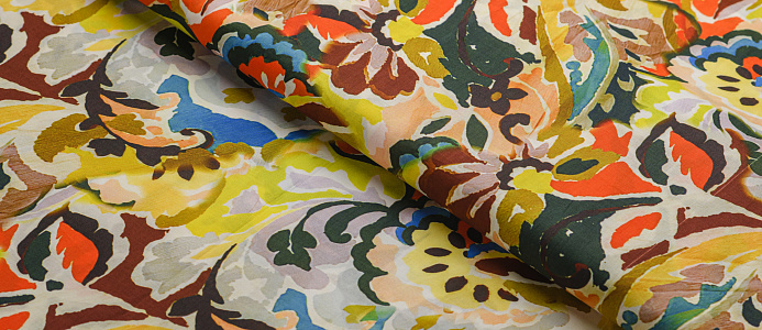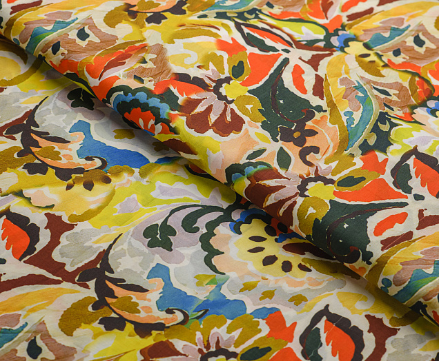 Хлопковая, средней плотности ткань с эластаном. По всей поверхности полотна расположен принт. Ткань тонкая, при этом прочная, хорошо держит форму. Отлично подходит для пошива платьев, сарафанов, мужских и женских рубашек .