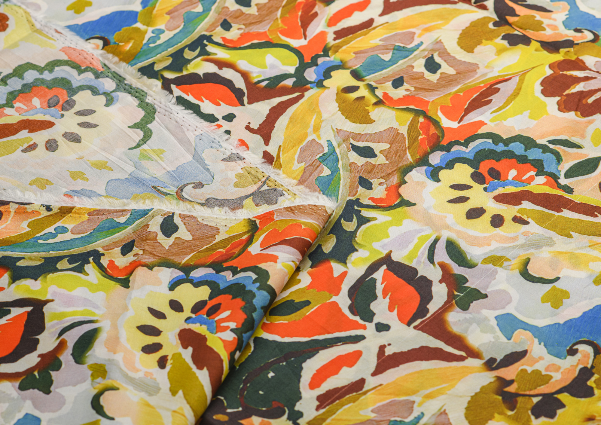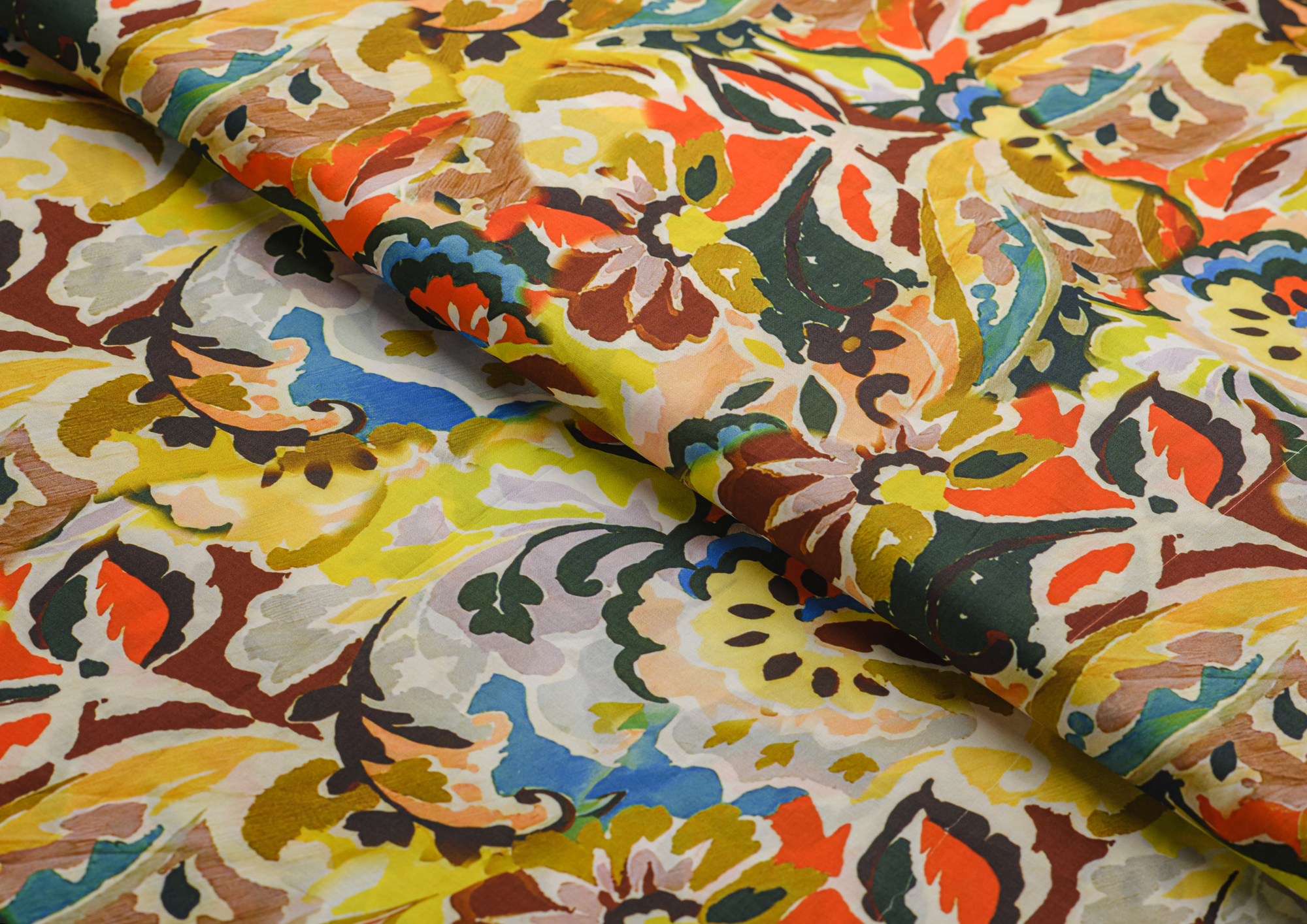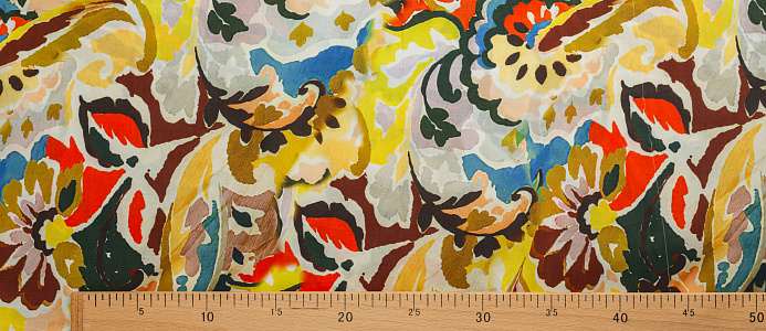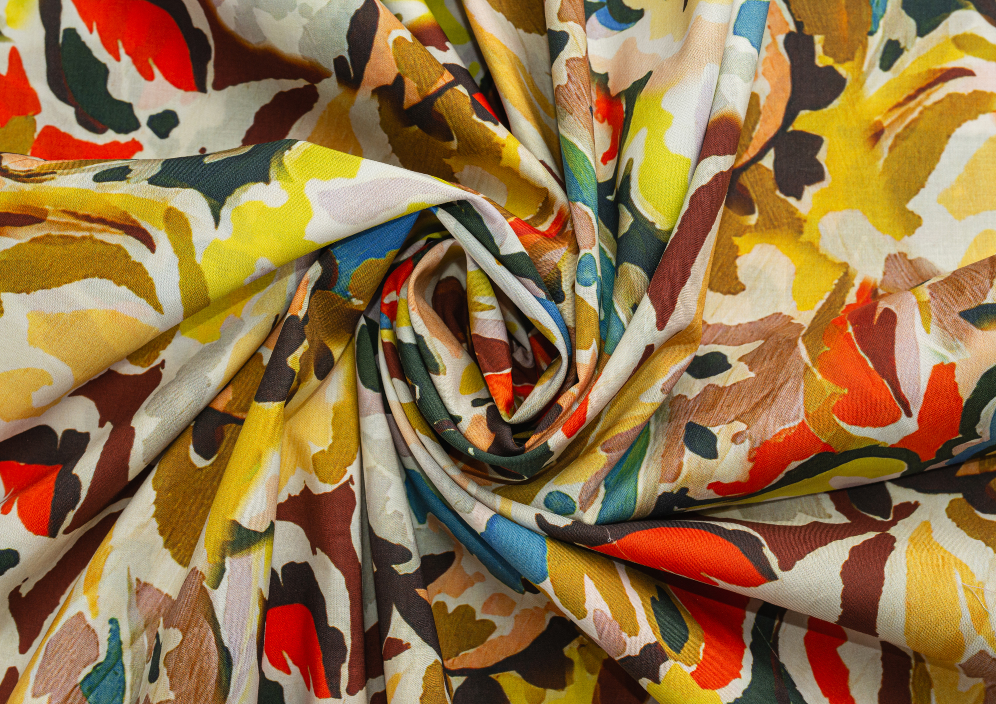 Хлопковая, средней плотности ткань с эластаном. По всей поверхности полотна расположен принт. Ткань тонкая, при этом прочная, хорошо держит форму. Отлично подходит для пошива платьев, сарафанов, мужских и женских рубашек .