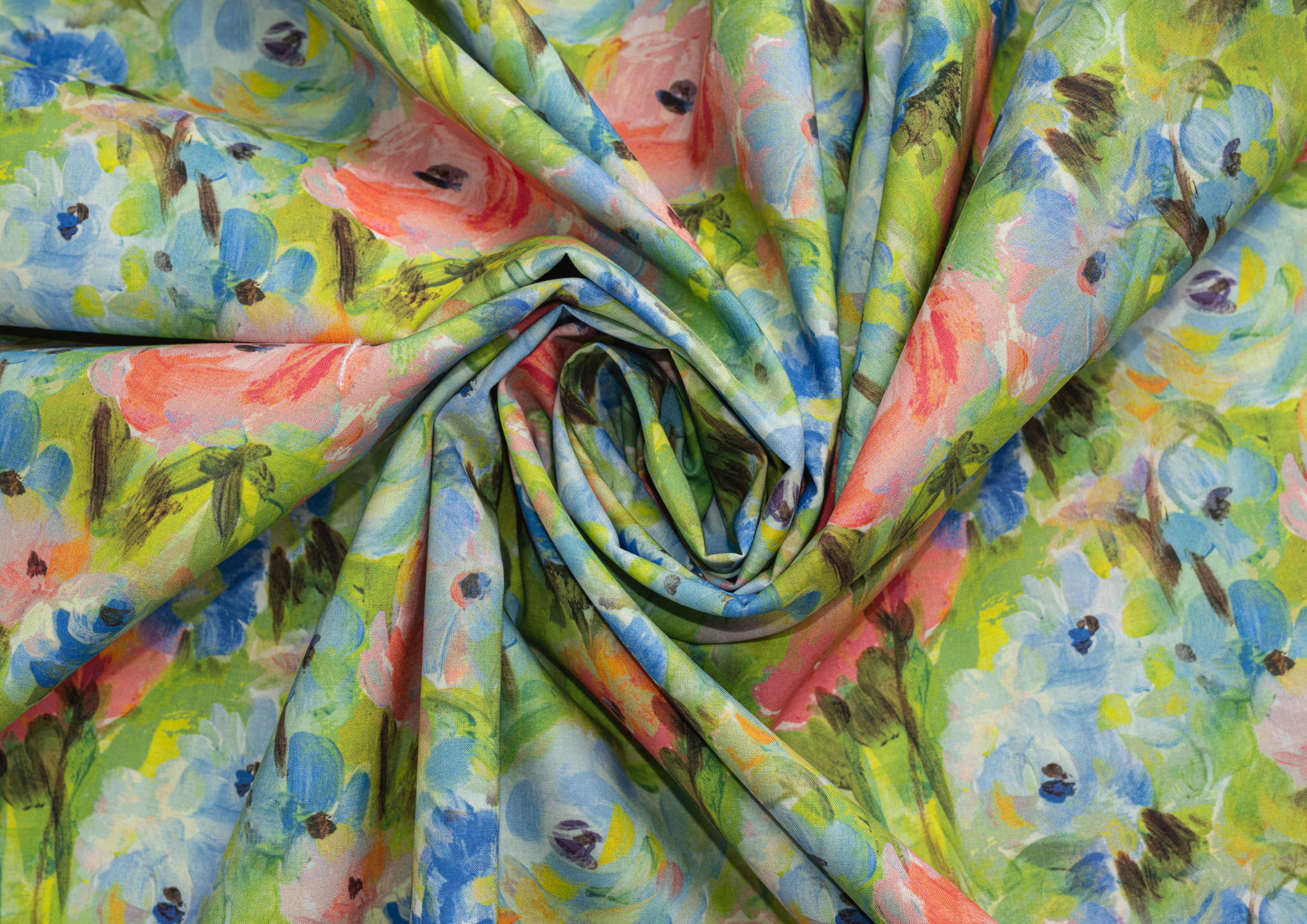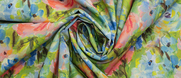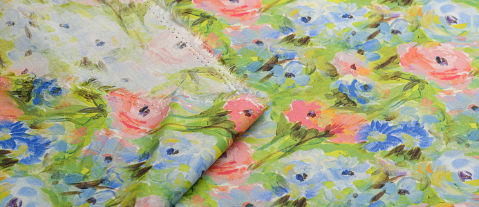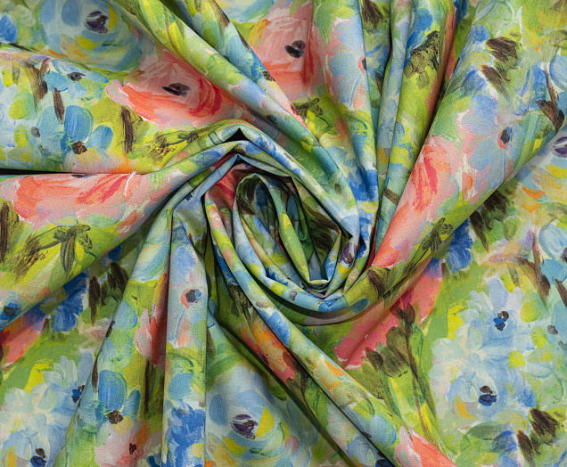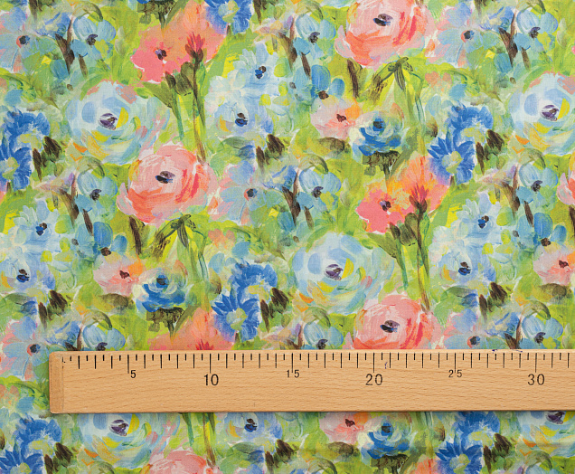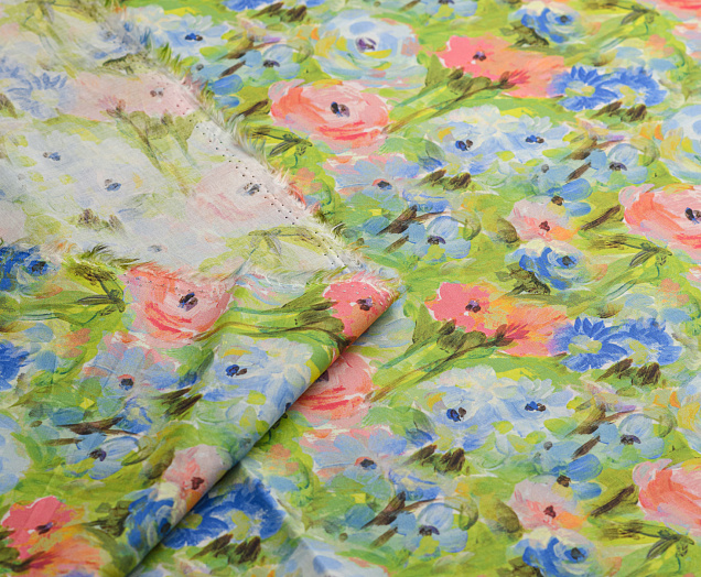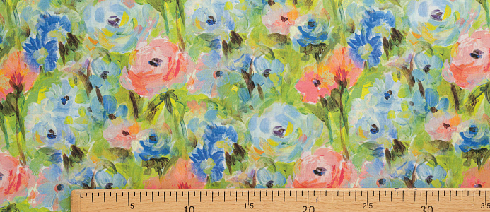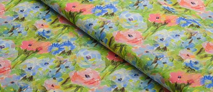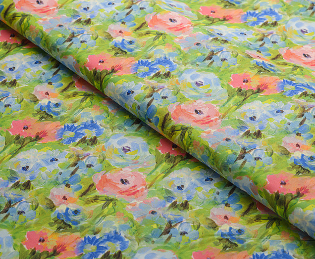 Ткань Поплин стрейч принт Зеленое поле/цветы