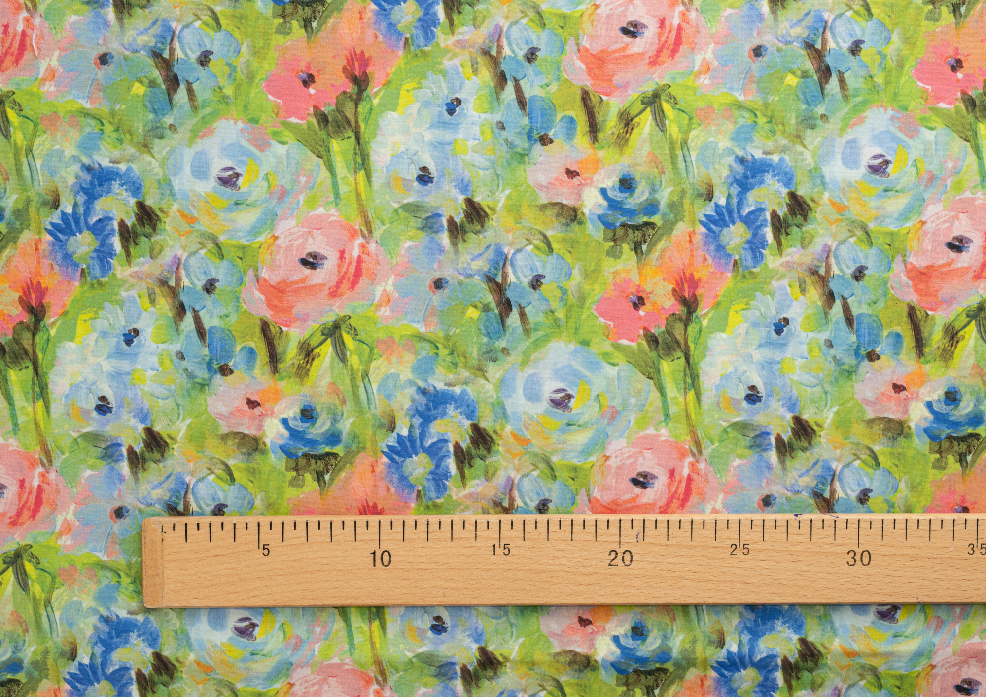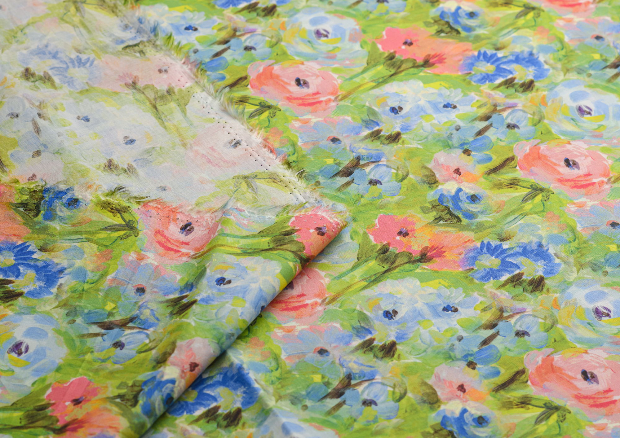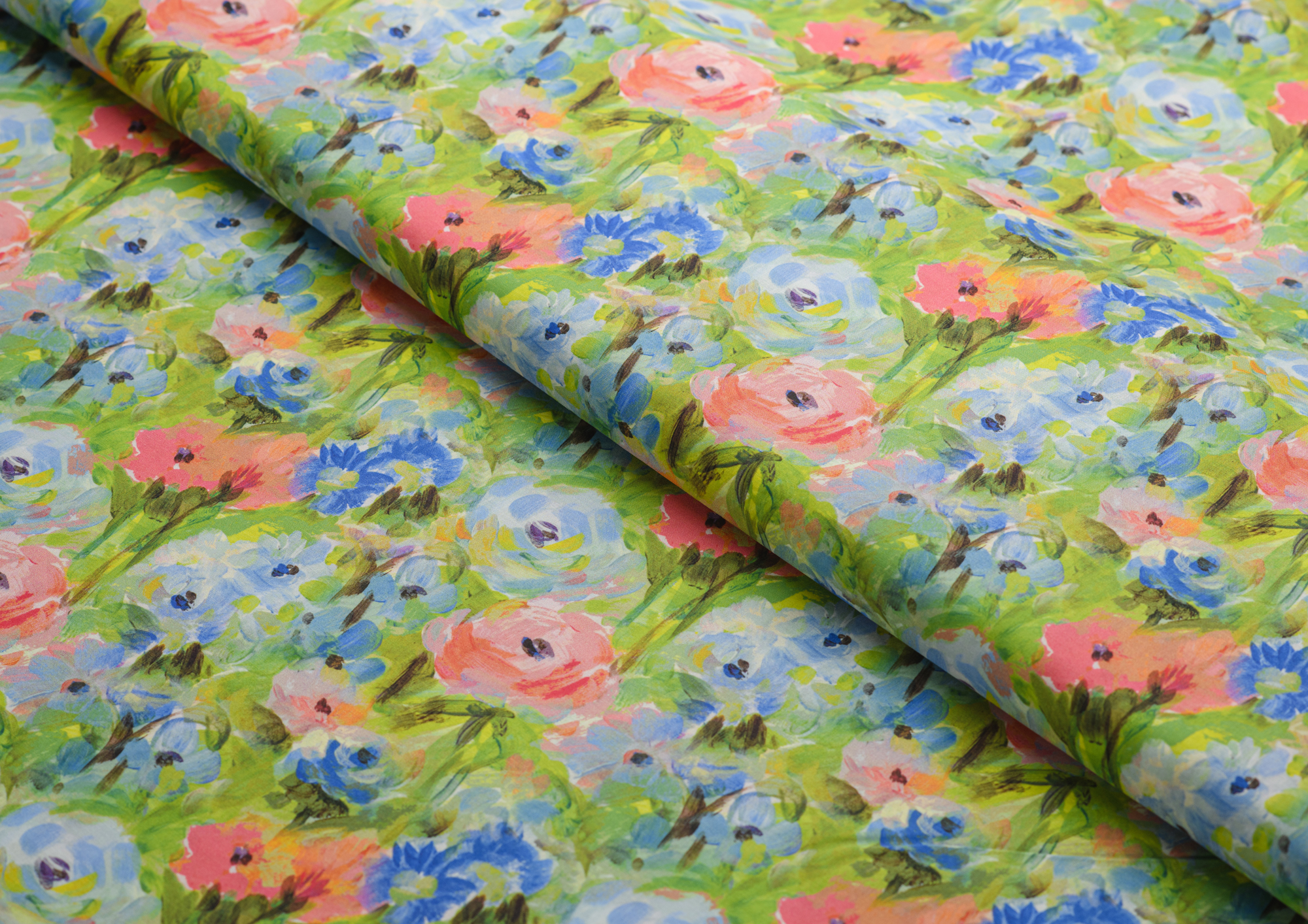 Ткань Поплин стрейч принт Зеленое поле/цветы