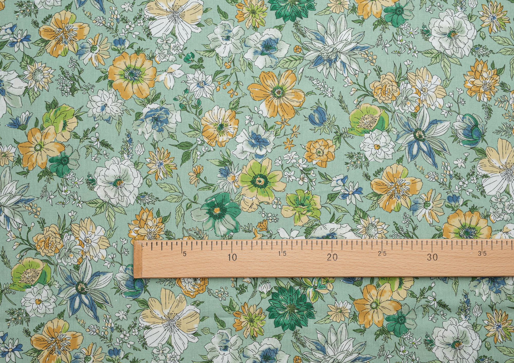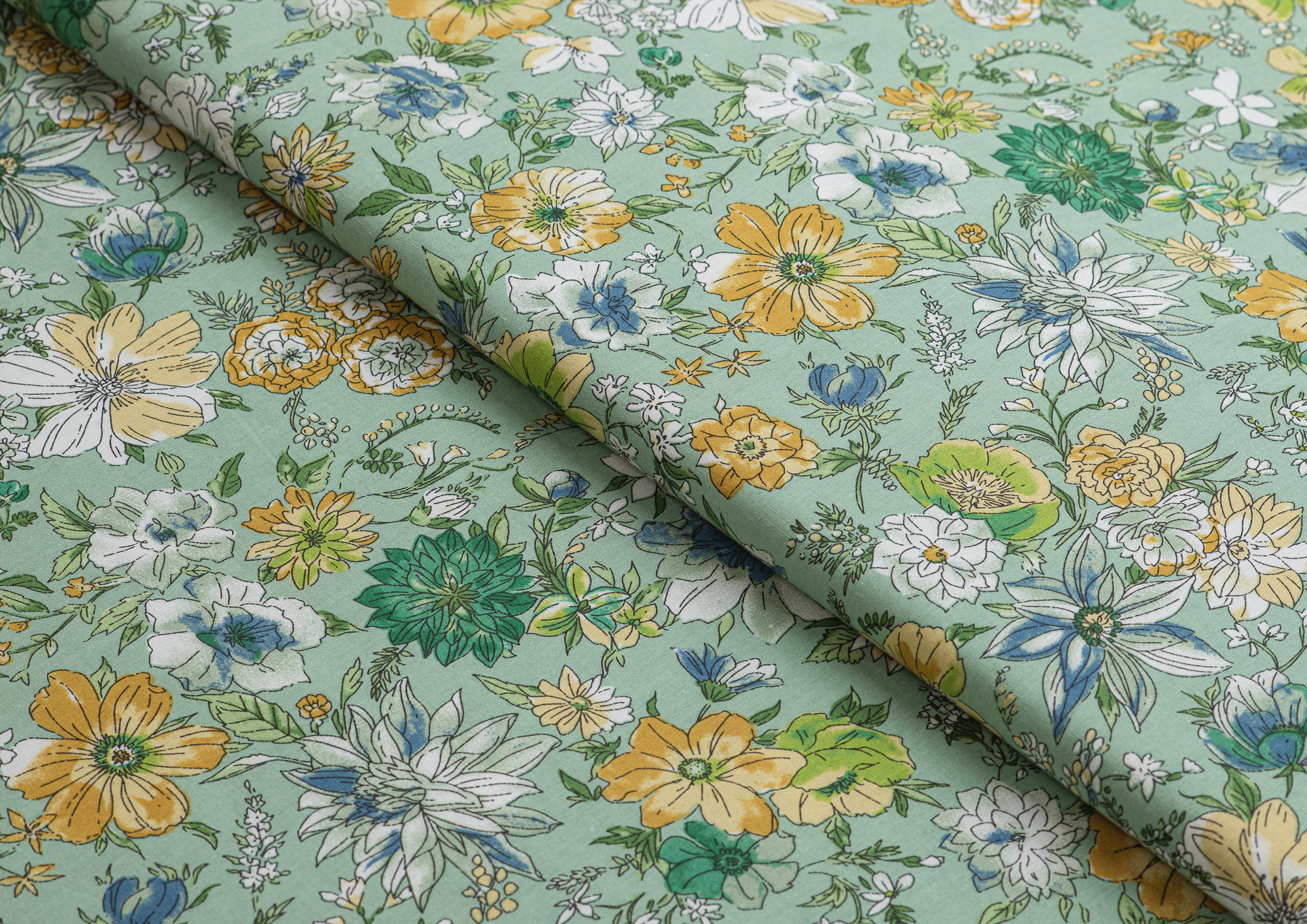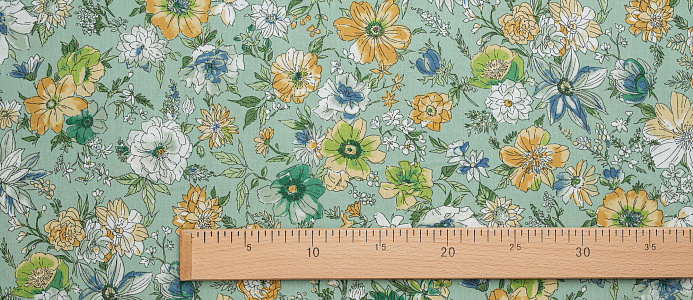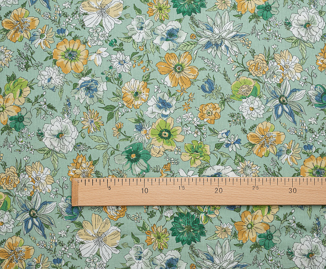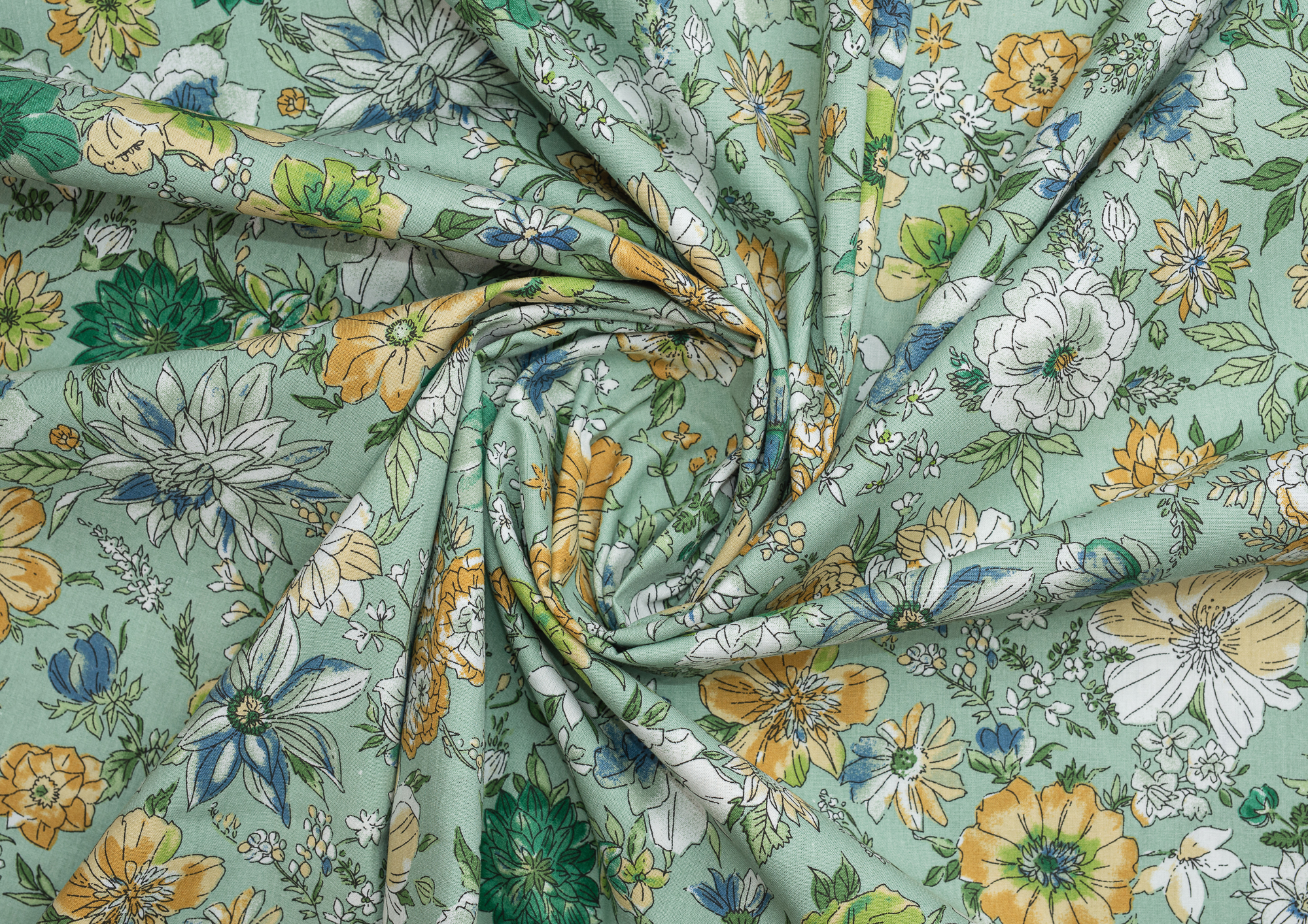 Ткань Поплин стрейч принт Желтые цветы на зеленом