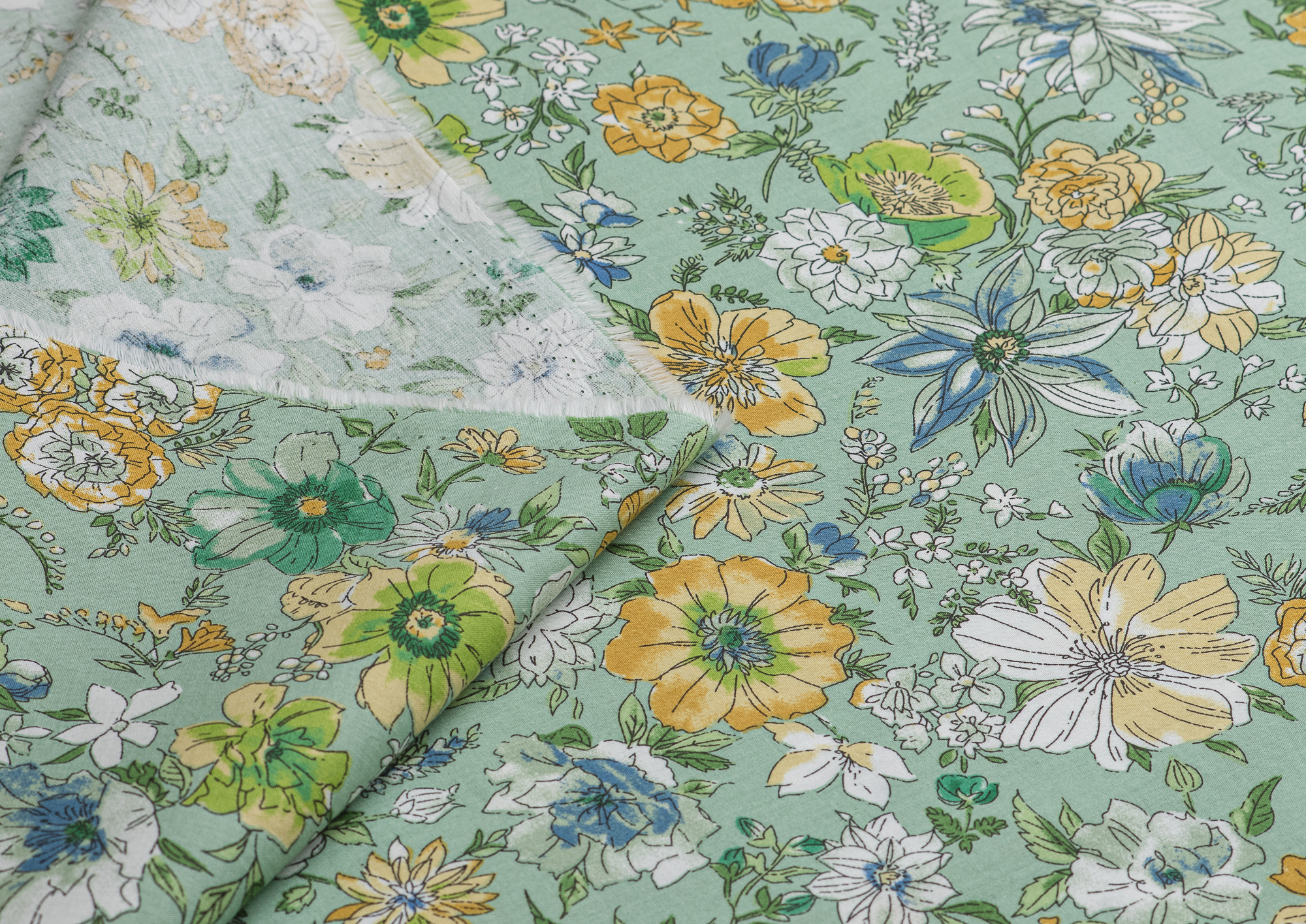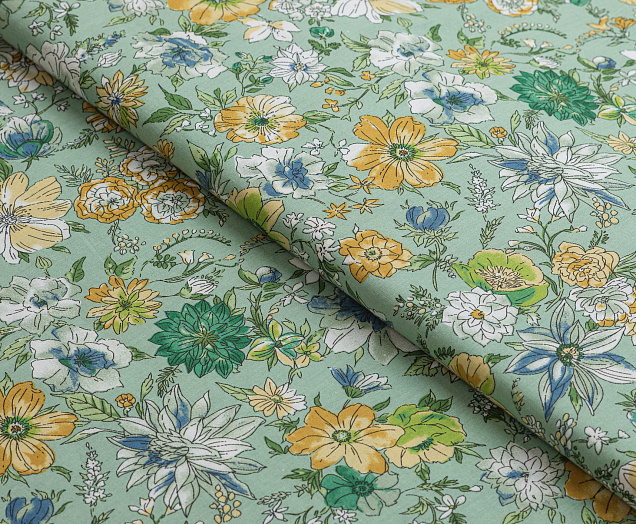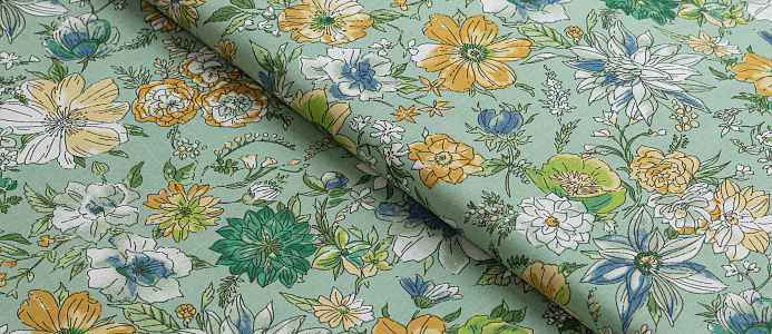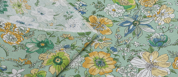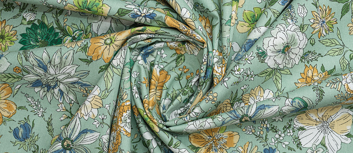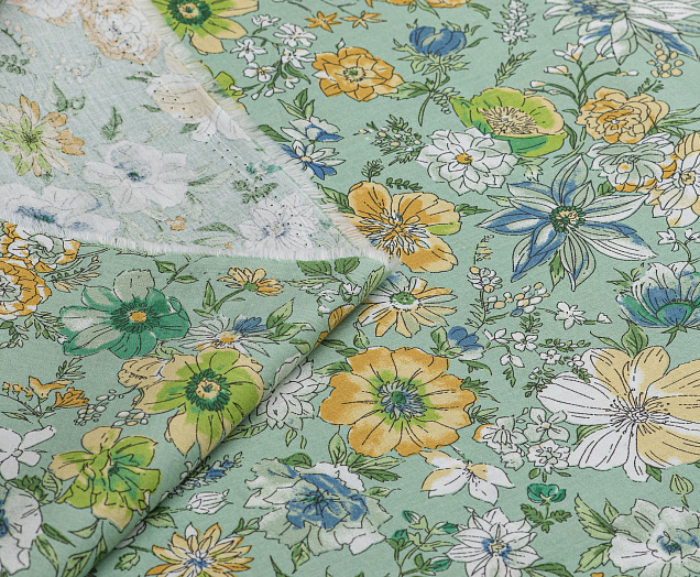 Хлопковая плотная ткань по всей поверхности которой расположен мелкий цветочный принт. Материал тонкий, эластичный, но при этом прочный и формоустойчивый. Подходит для пошива легких блуз и рубашек, платьев и сарафанов.