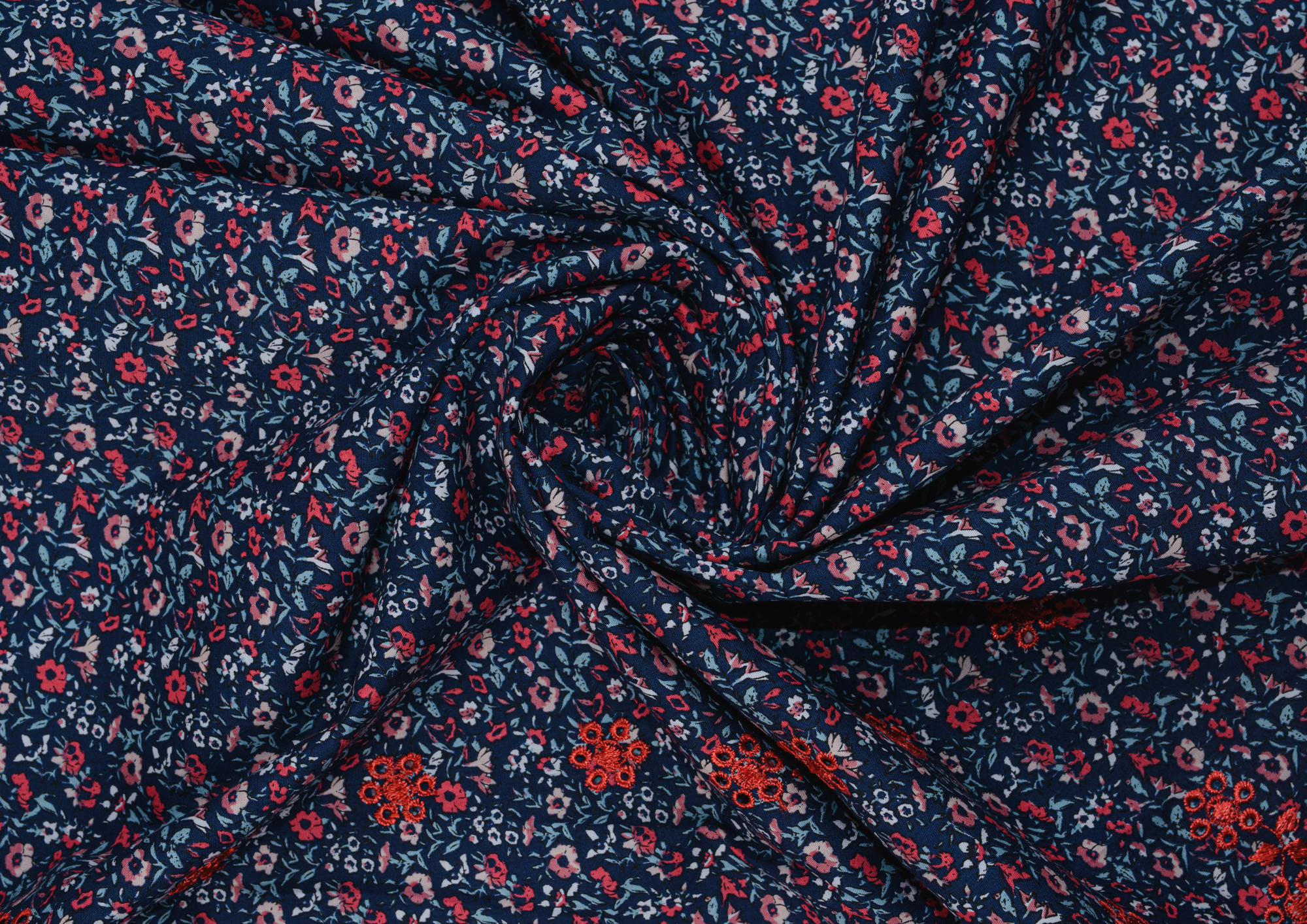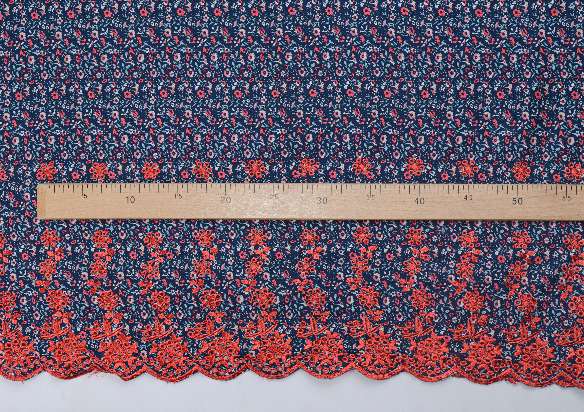 Плотная, хорошо держит форму. Ажурная вышивка вдоль обоих кромок. Подходит для пошива сарафанов, платьев, юбок, рубашек.