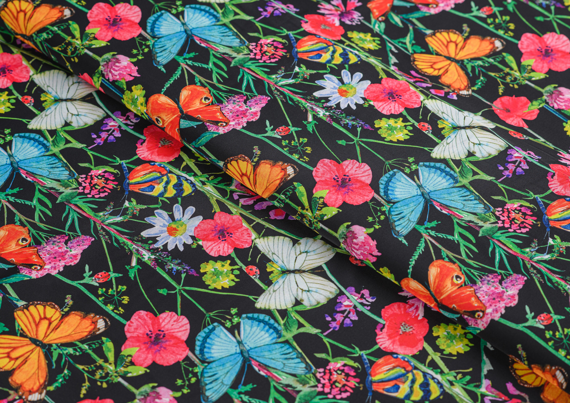 Тонкая, плотная, гладкая ткань. По всей поверхности расположен принт цветы, бабочки. Материал хорошо драпируется, образовывая мягкие складки. Ткань подходит для пошива платье, блузок, рубашек,  а так же постельного и нижнего белья.