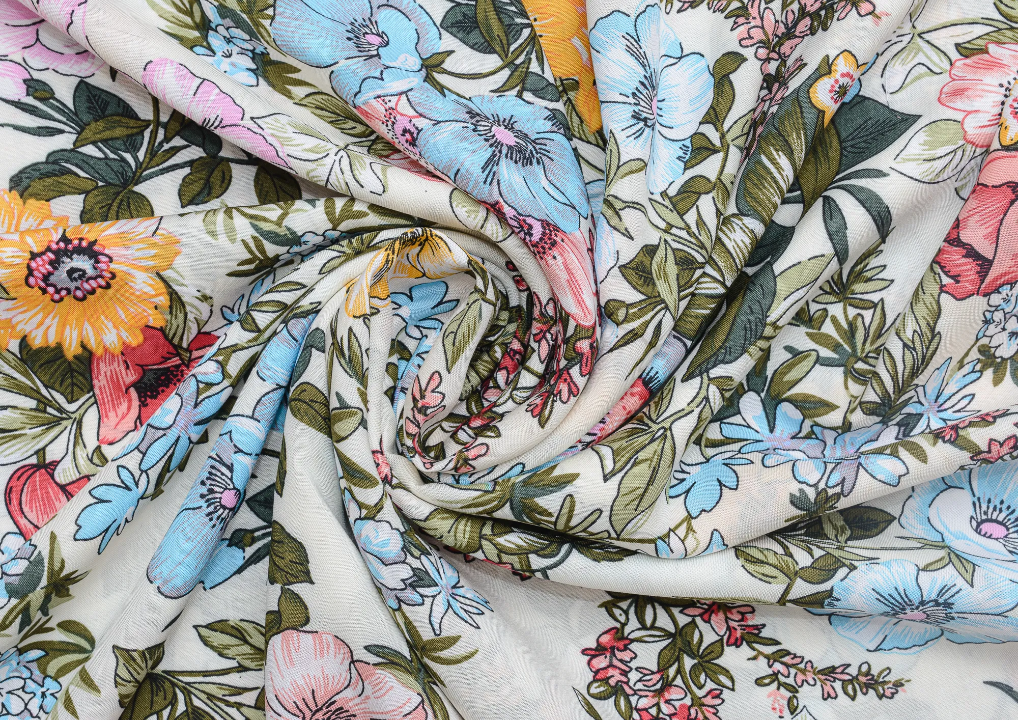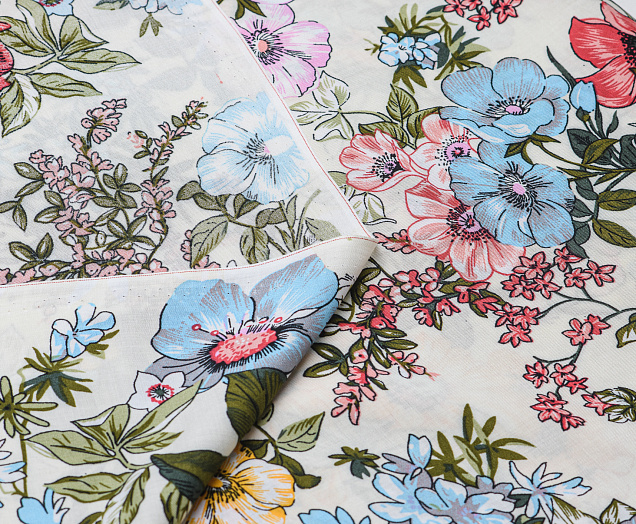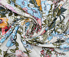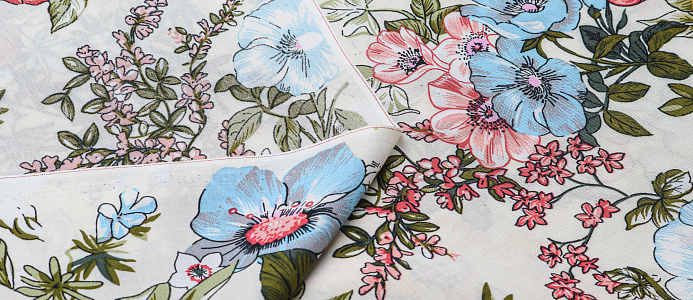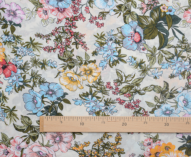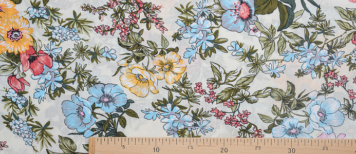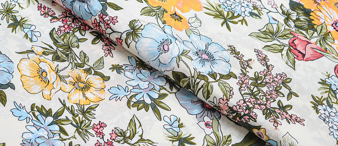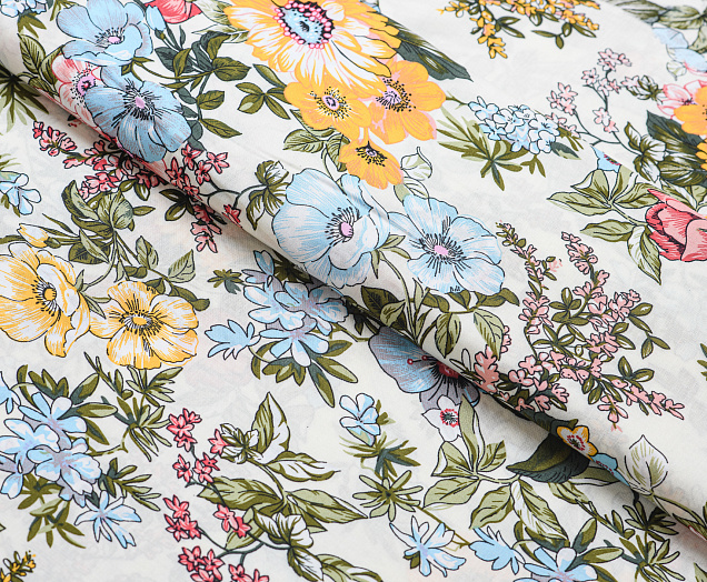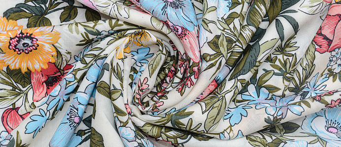 Легкая , мягкая , приятная на ощупь ткань . Поверхность шелковистая . По всей поверхности ткани расположен разноцветный цветочный принт. Ткань воздухопроницаемая, хорошо подходит для жаркой погоды. Отлично драпируется , образовывая мягкие складки. Подходит для пошива платьев, сарафанов, халатов, юбок. Фон молочный.