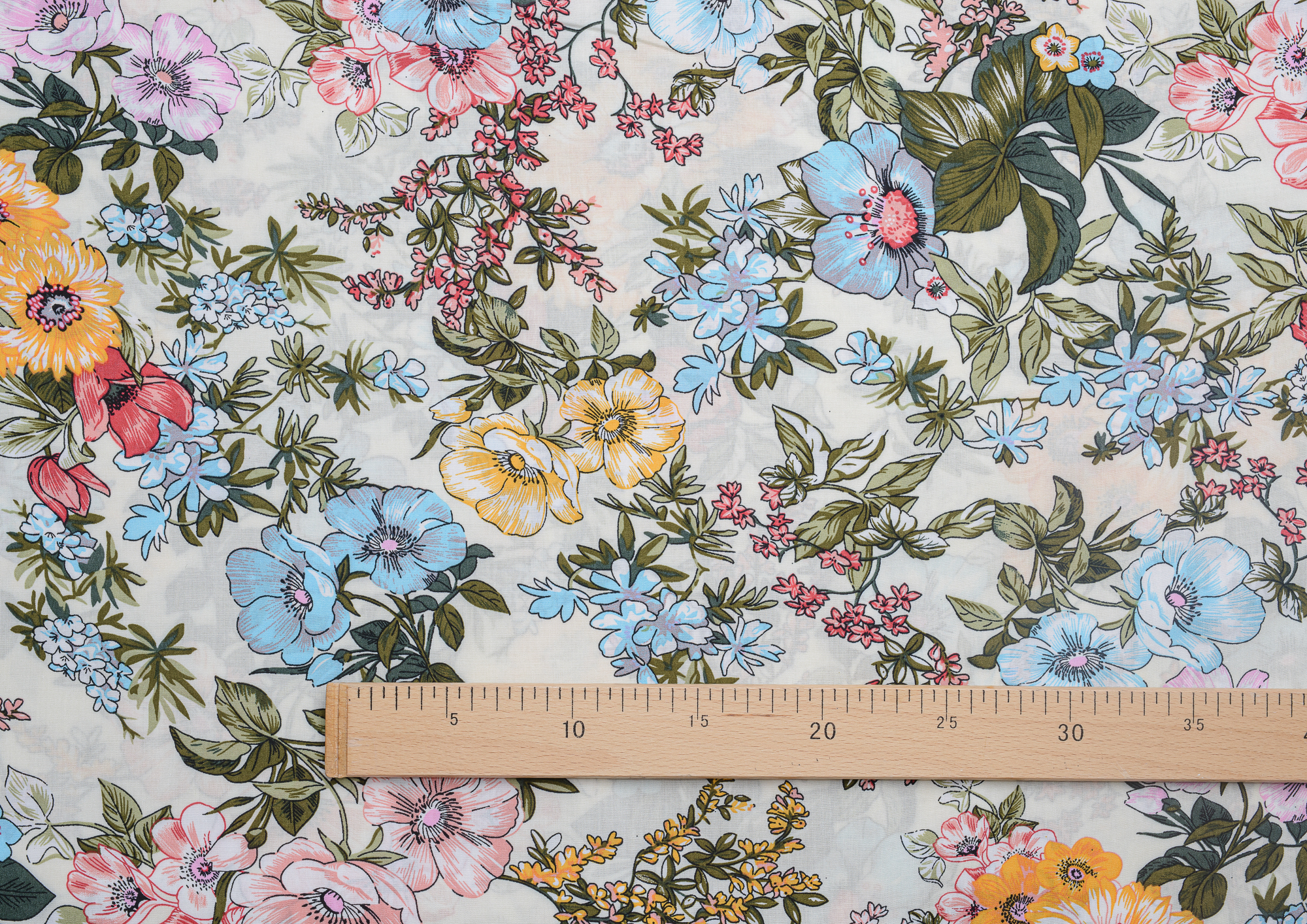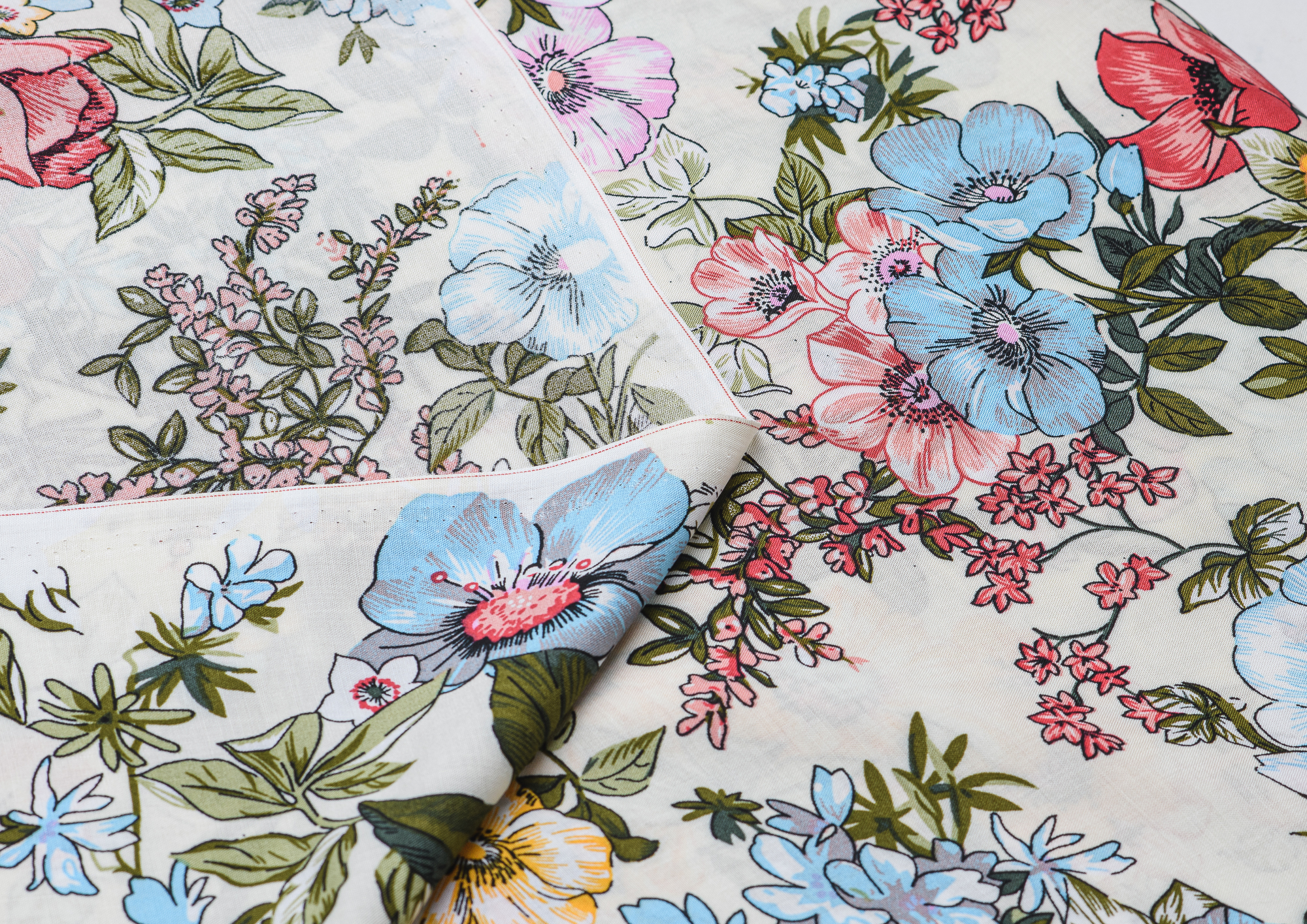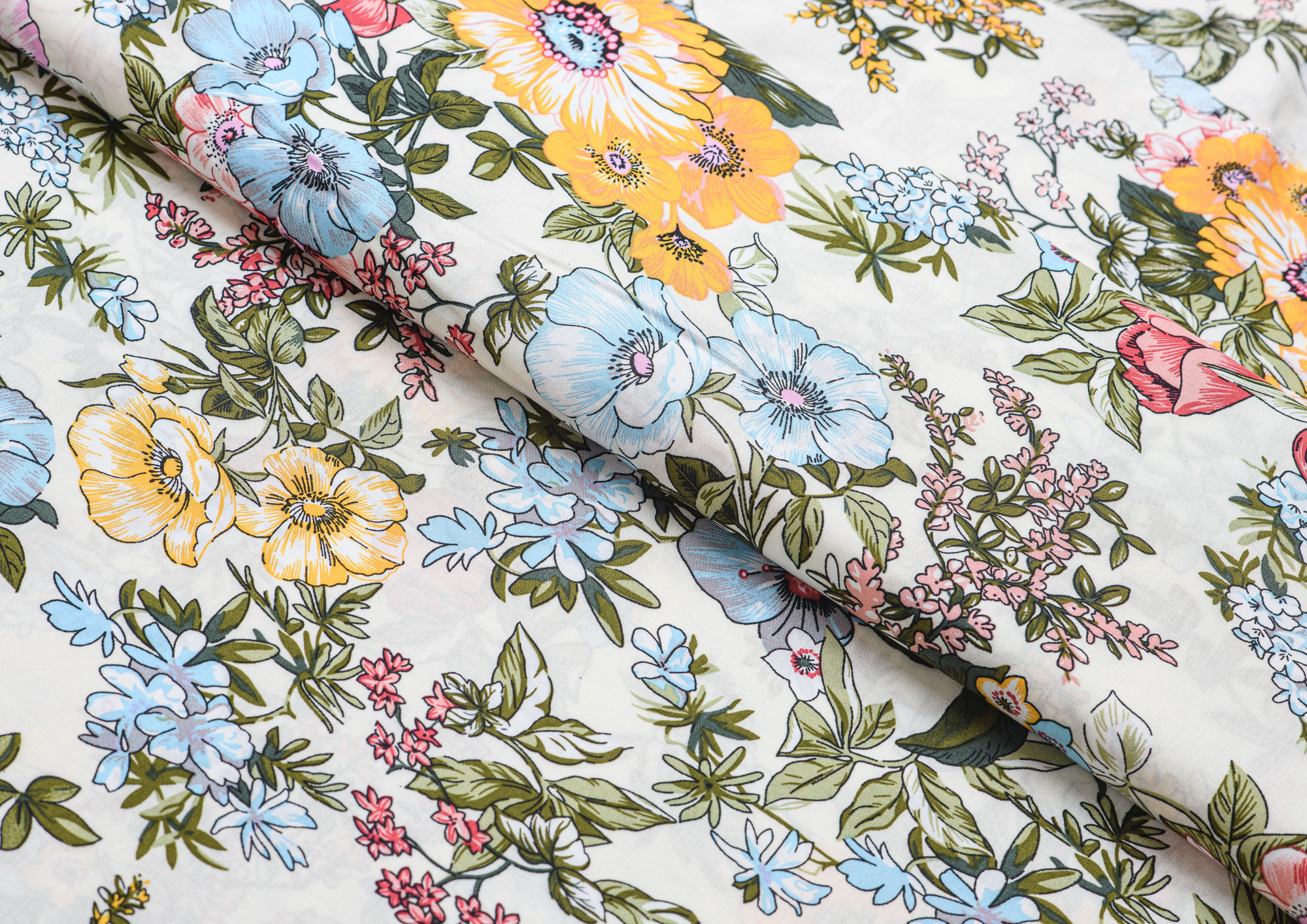 Легкая , мягкая , приятная на ощупь ткань . Поверхность шелковистая . По всей поверхности ткани расположен разноцветный цветочный принт. Ткань воздухопроницаемая, хорошо подходит для жаркой погоды. Отлично драпируется , образовывая мягкие складки. Подходит для пошива платьев, сарафанов, халатов, юбок. Фон молочный.