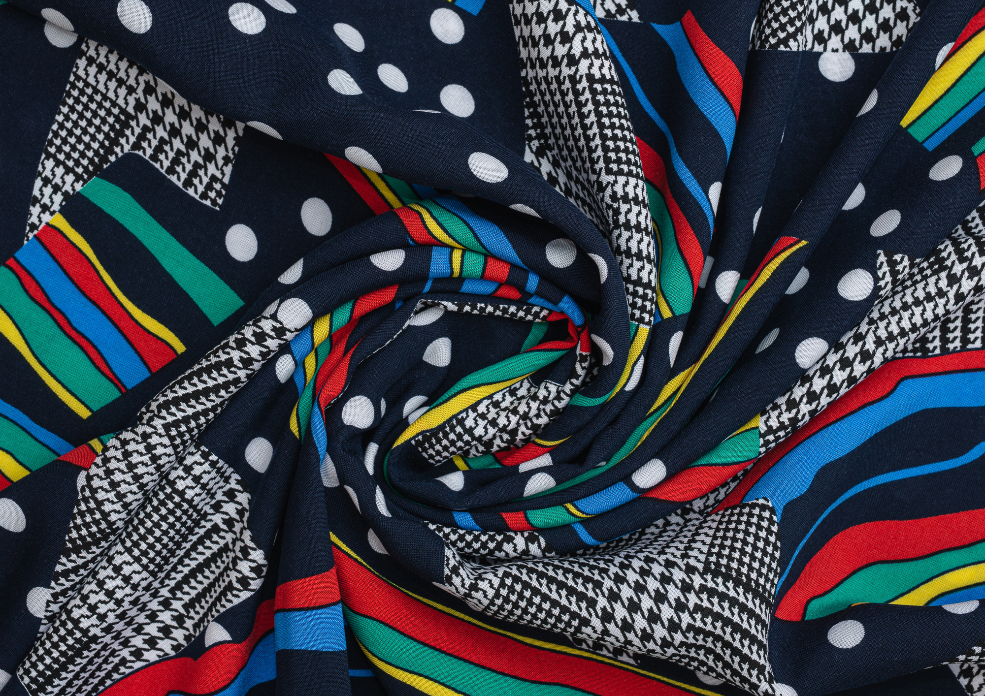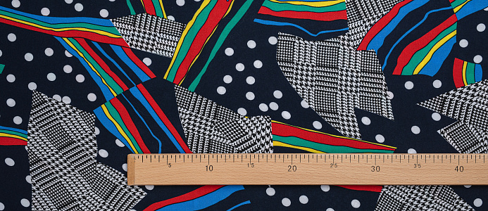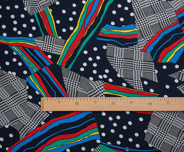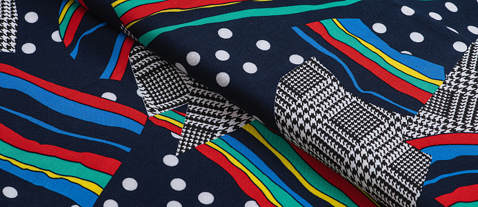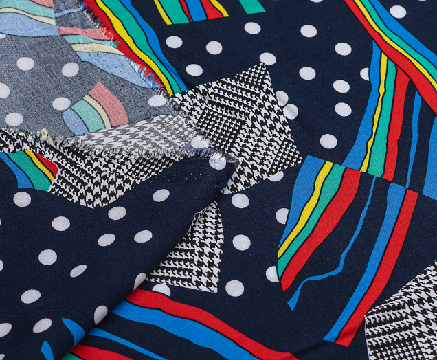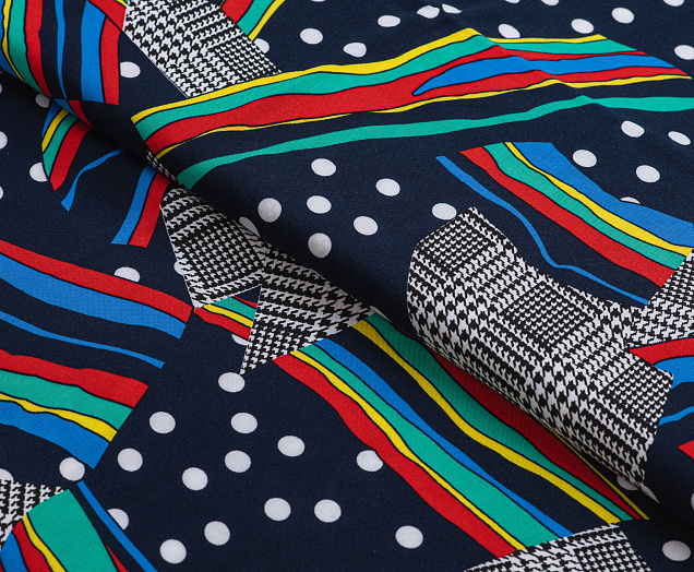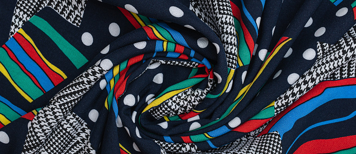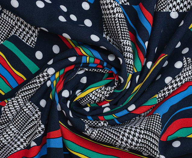 Легкая , мягкая , приятная на ощупь ткань . Поверхность шелковистая . По всему полотну расположен принт горошек, клетка , разноцветные полосы. Цвет основы темно-синий . Ткань воздухопроницаемая, хорошо подходит для жаркой погоды. Отлично драпируется , образовывая мягкие складки. Подходит для пошива платьев, сарафанов, халатов, юбок, мужских и женских рубашек