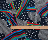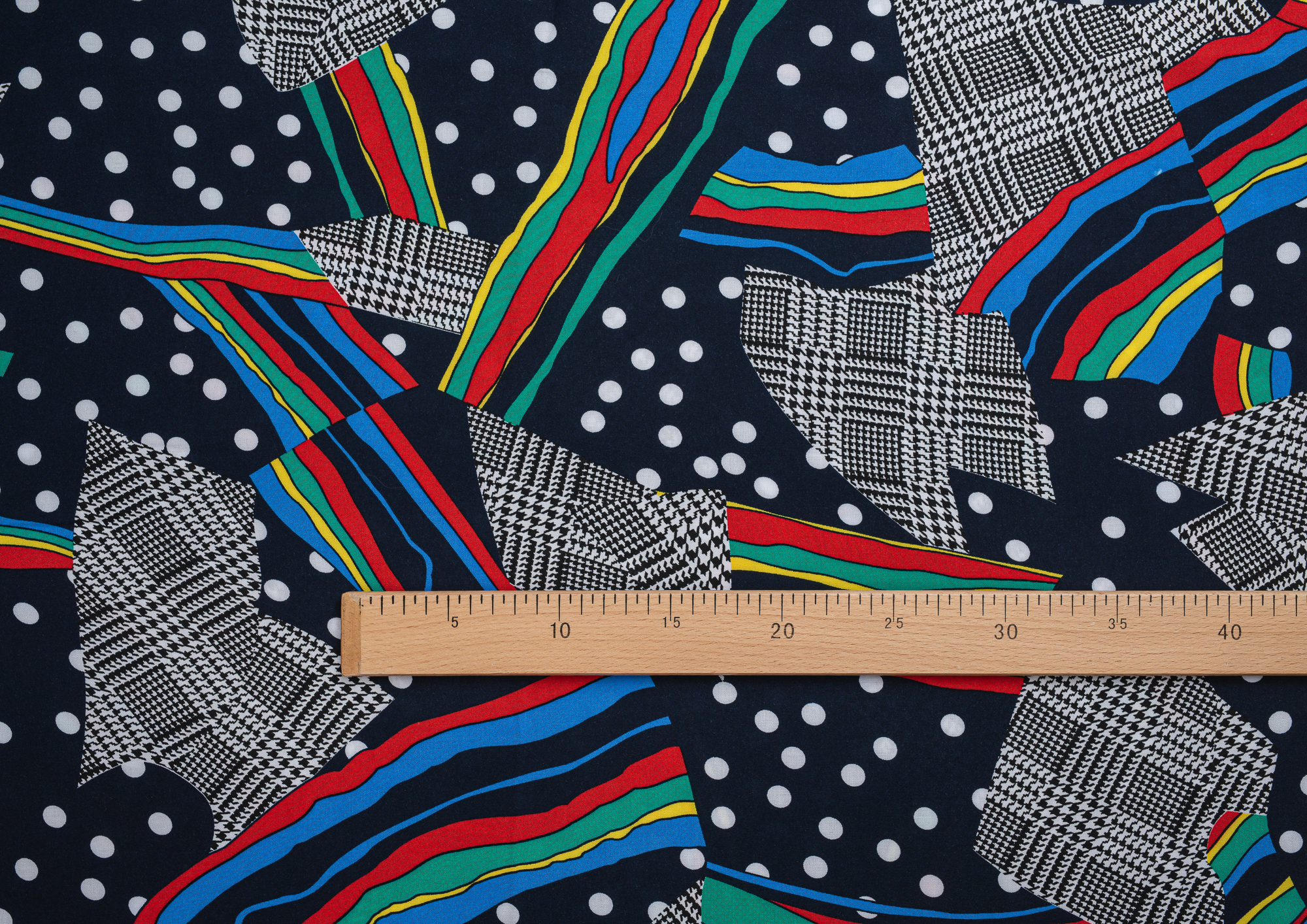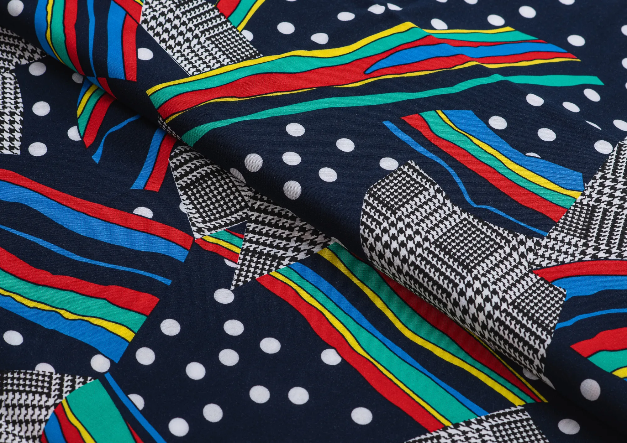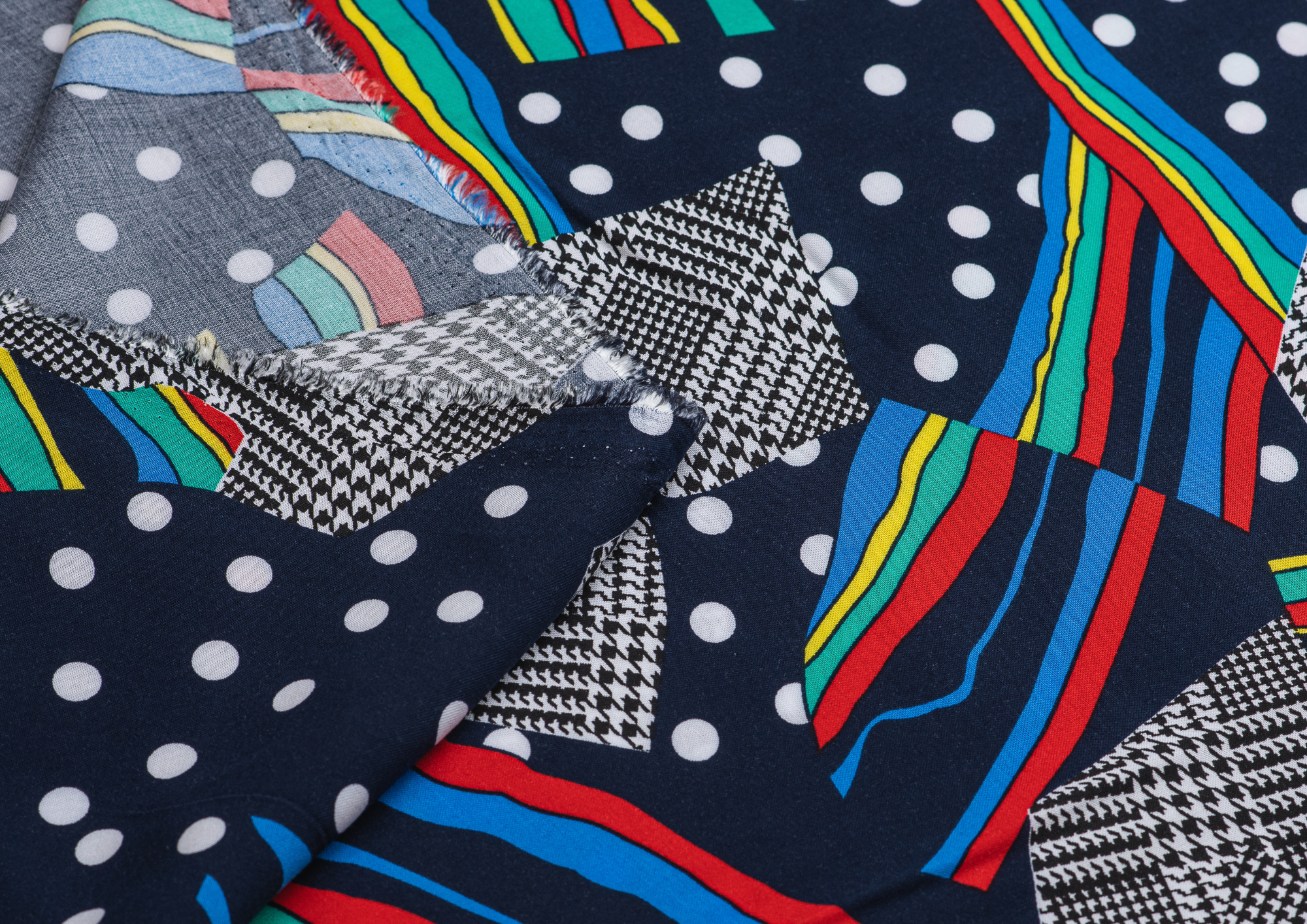 Легкая , мягкая , приятная на ощупь ткань . Поверхность шелковистая . По всему полотну расположен принт горошек, клетка , разноцветные полосы. Цвет основы темно-синий . Ткань воздухопроницаемая, хорошо подходит для жаркой погоды. Отлично драпируется , образовывая мягкие складки. Подходит для пошива платьев, сарафанов, халатов, юбок, мужских и женских рубашек