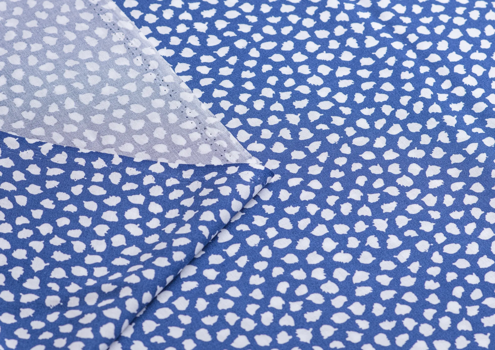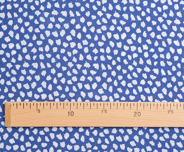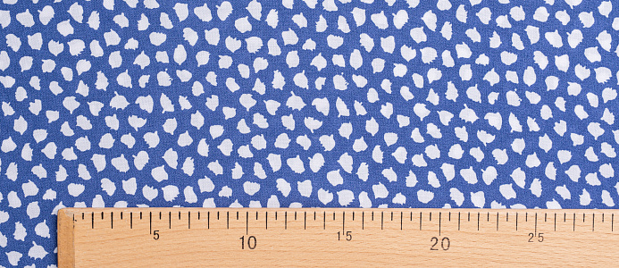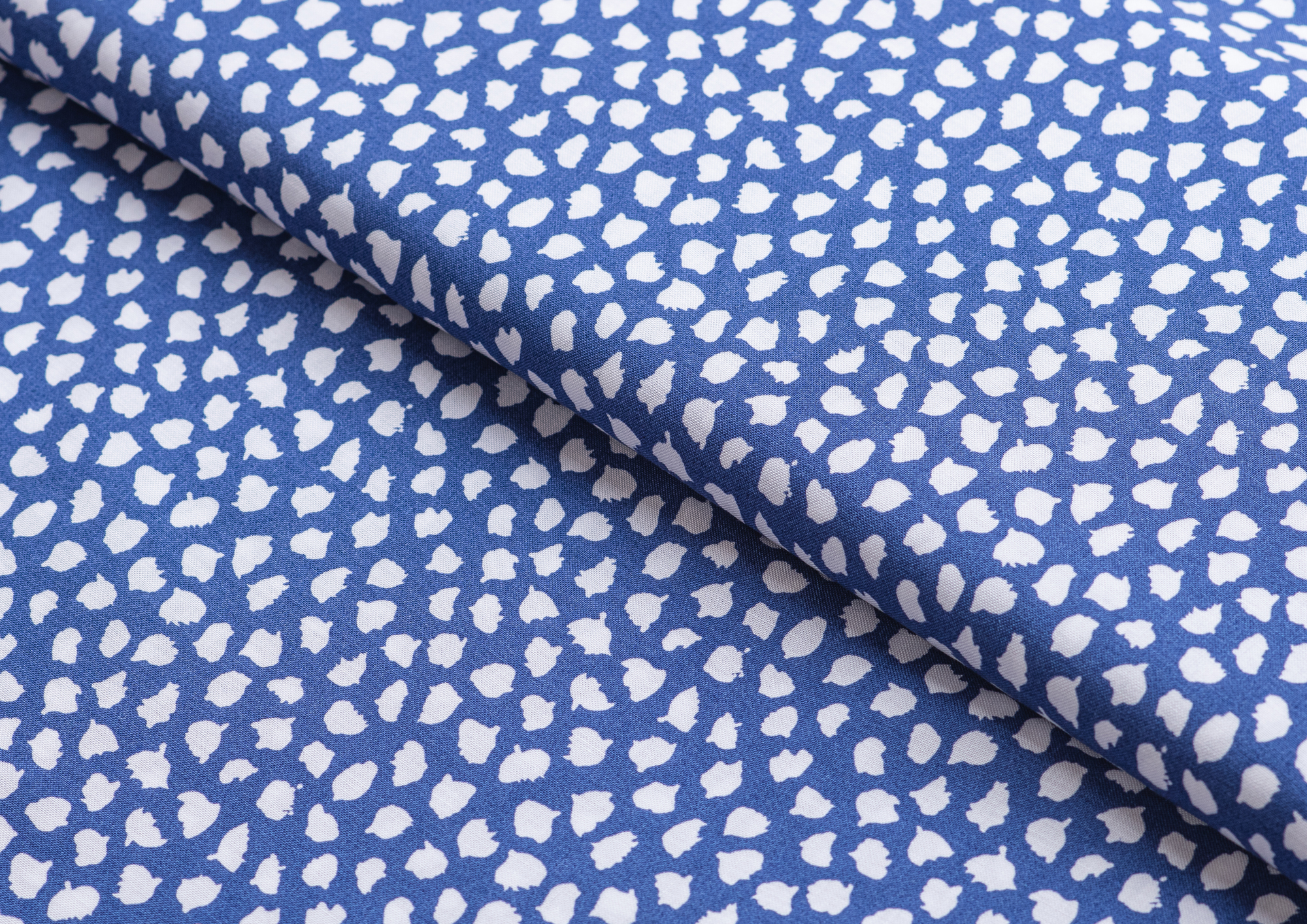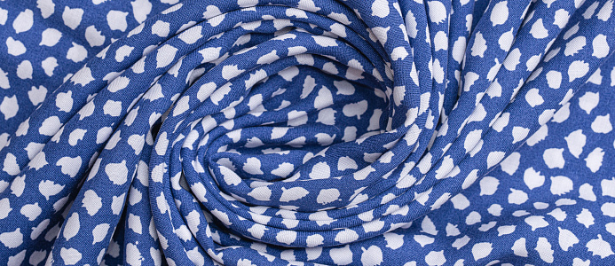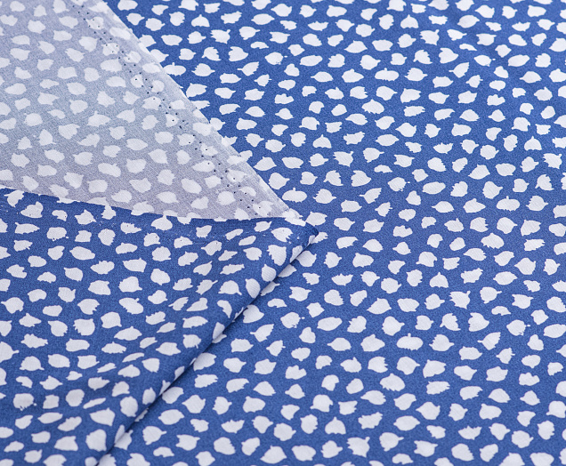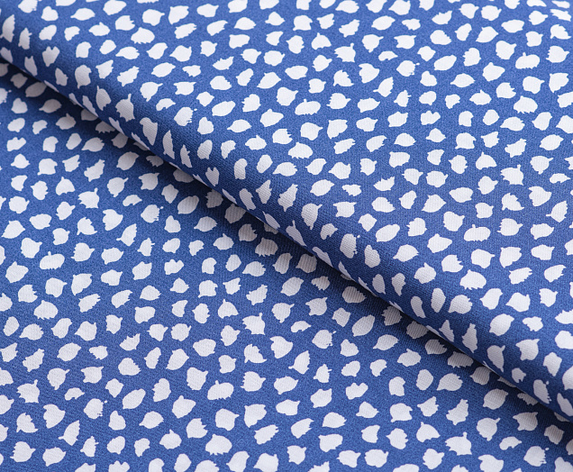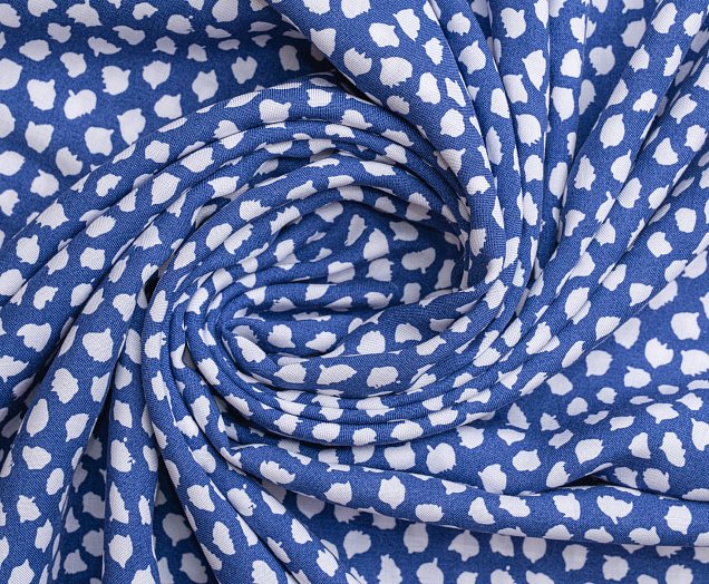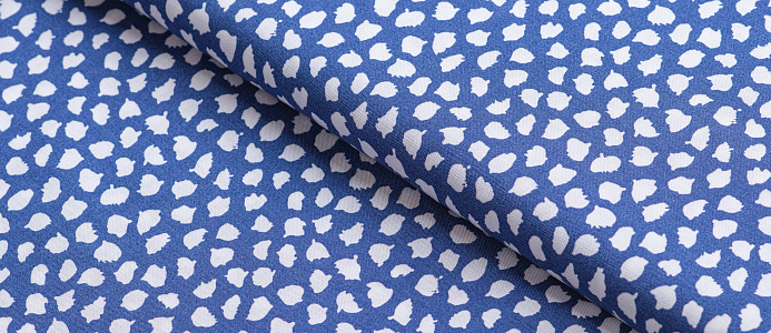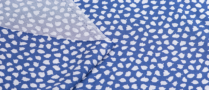 Легкая тонкая ткань с матовой шелковистой поверхностью. По всему полотну расположен принт белые кляксы на темно голубом фоне  . Материал мягкий, приятный на ощупь, воздухопроницаемый, при драпировке образует мягкие складки. Применяется для пошива платьев, блузок, юбок и сарафанов.