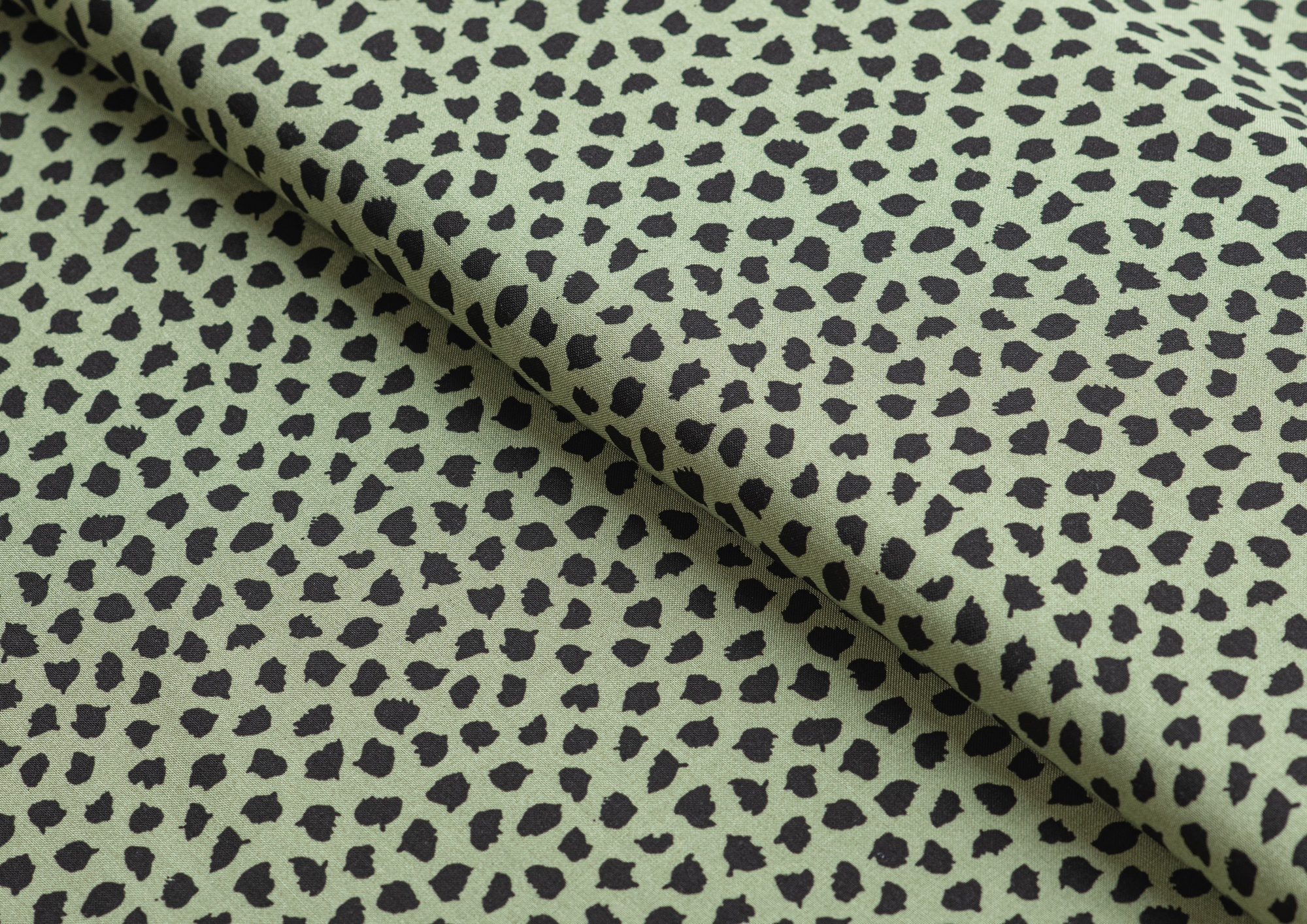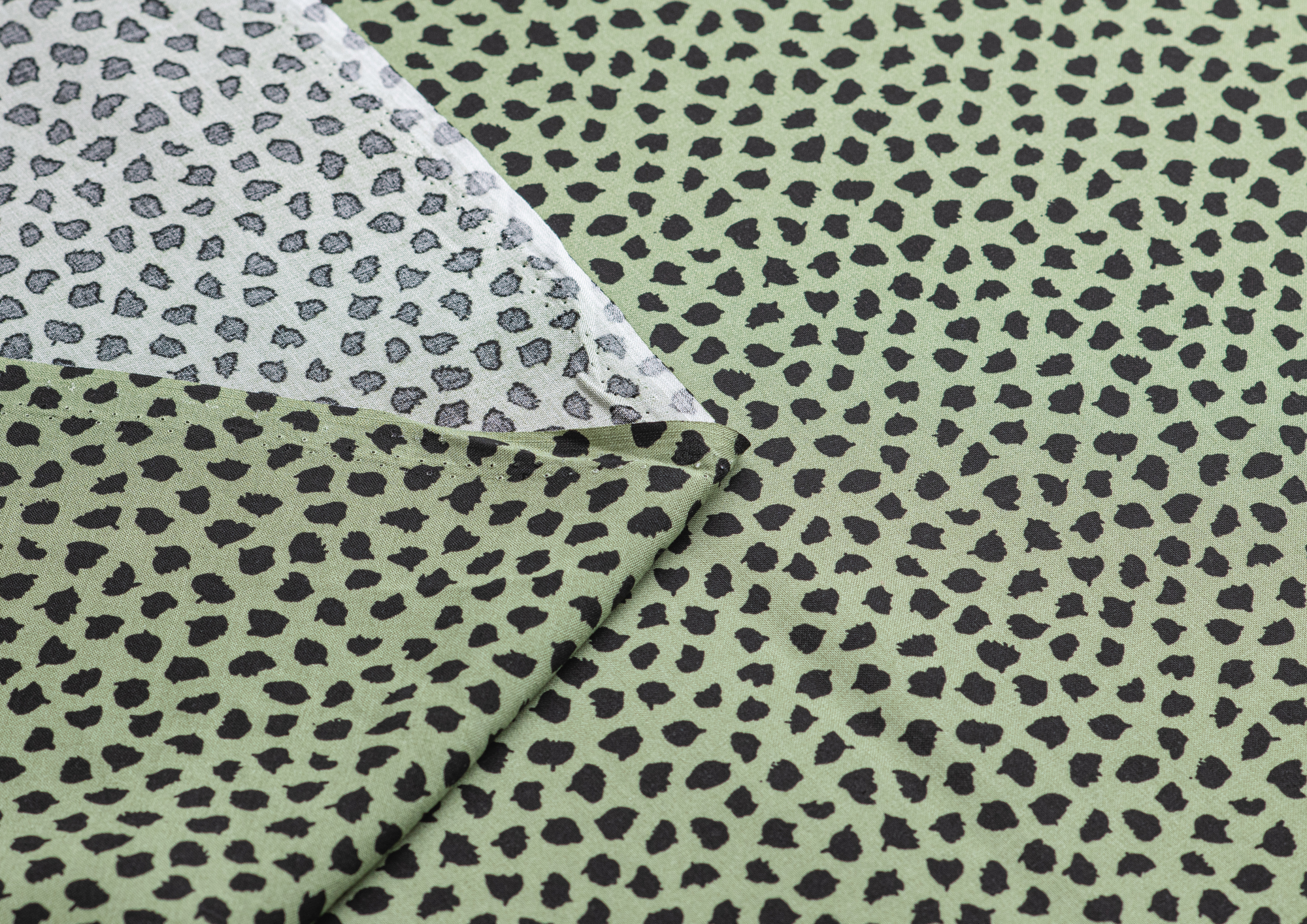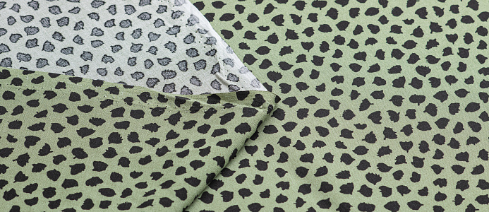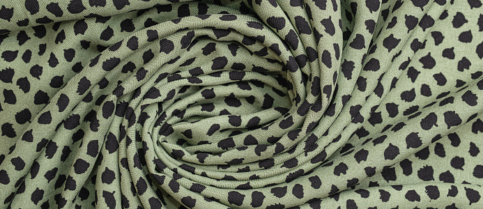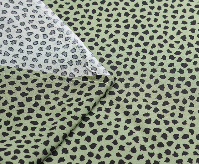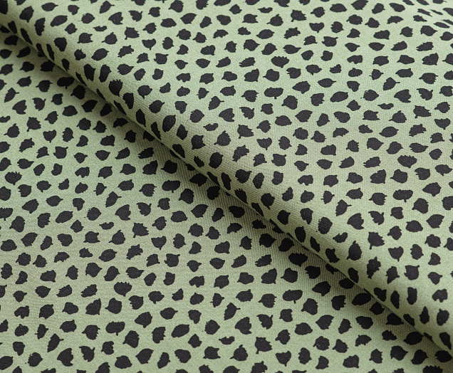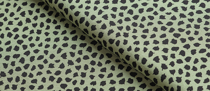 Легкая тонкая ткань с матовой шелковистой поверхностью. По всему полотну расположен принт черные кляксы на зеленом фоне  . Материал мягкий, приятный на ощупь, воздухопроницаемый, при драпировке образует мягкие складки. Применяется для пошива платьев, блузок, юбок и сарафанов.