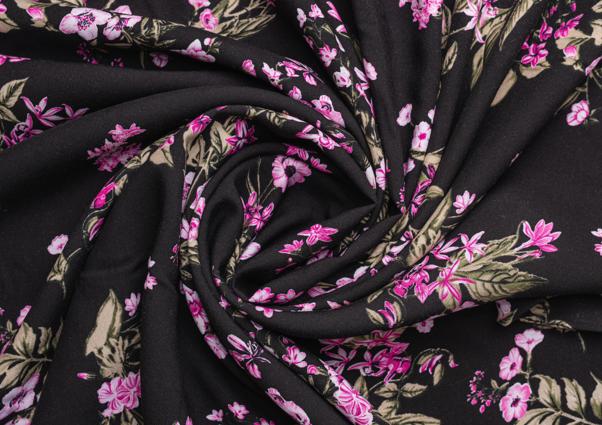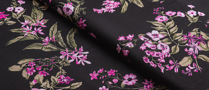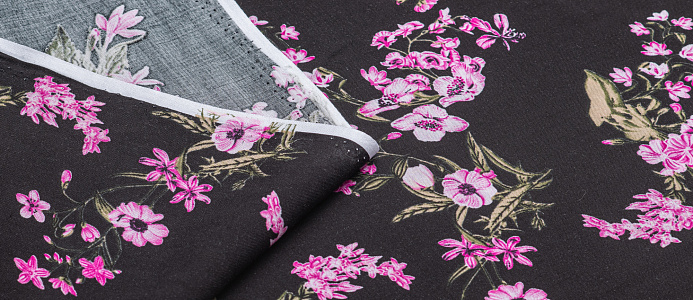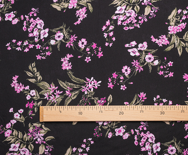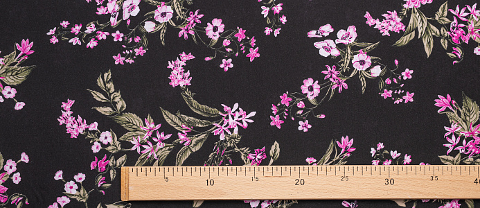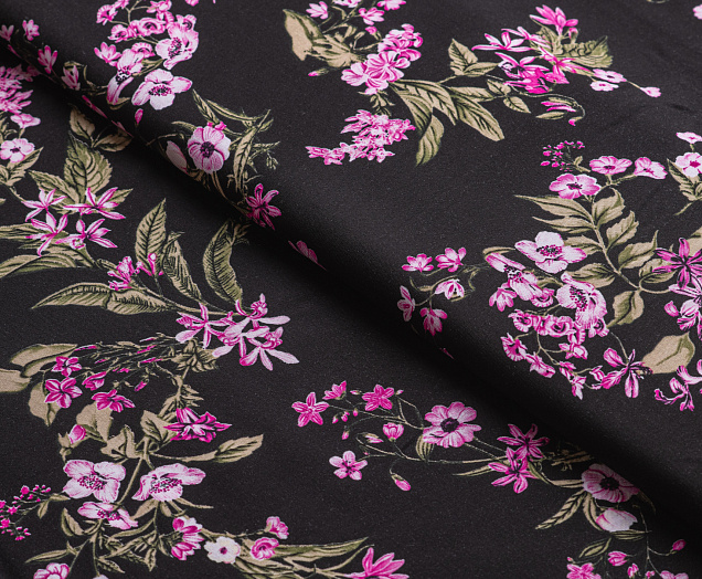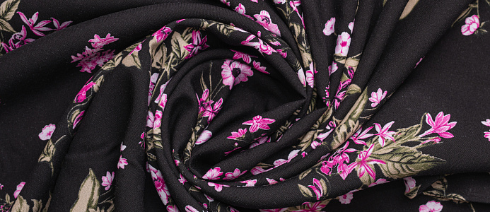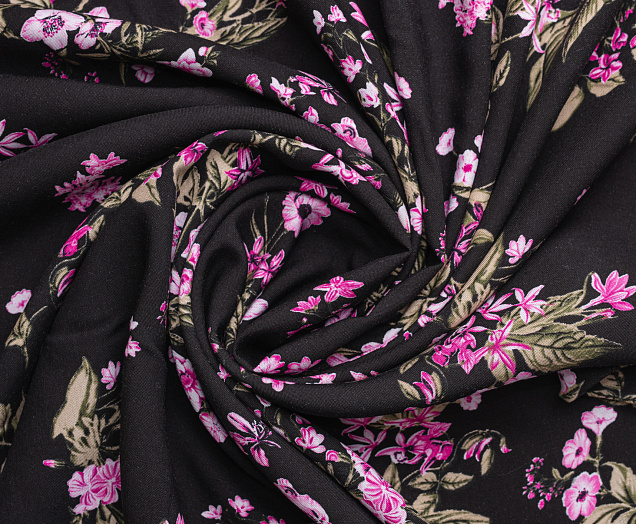 Ткань Штапель 3401 принт 6 Розовые цветы на черном