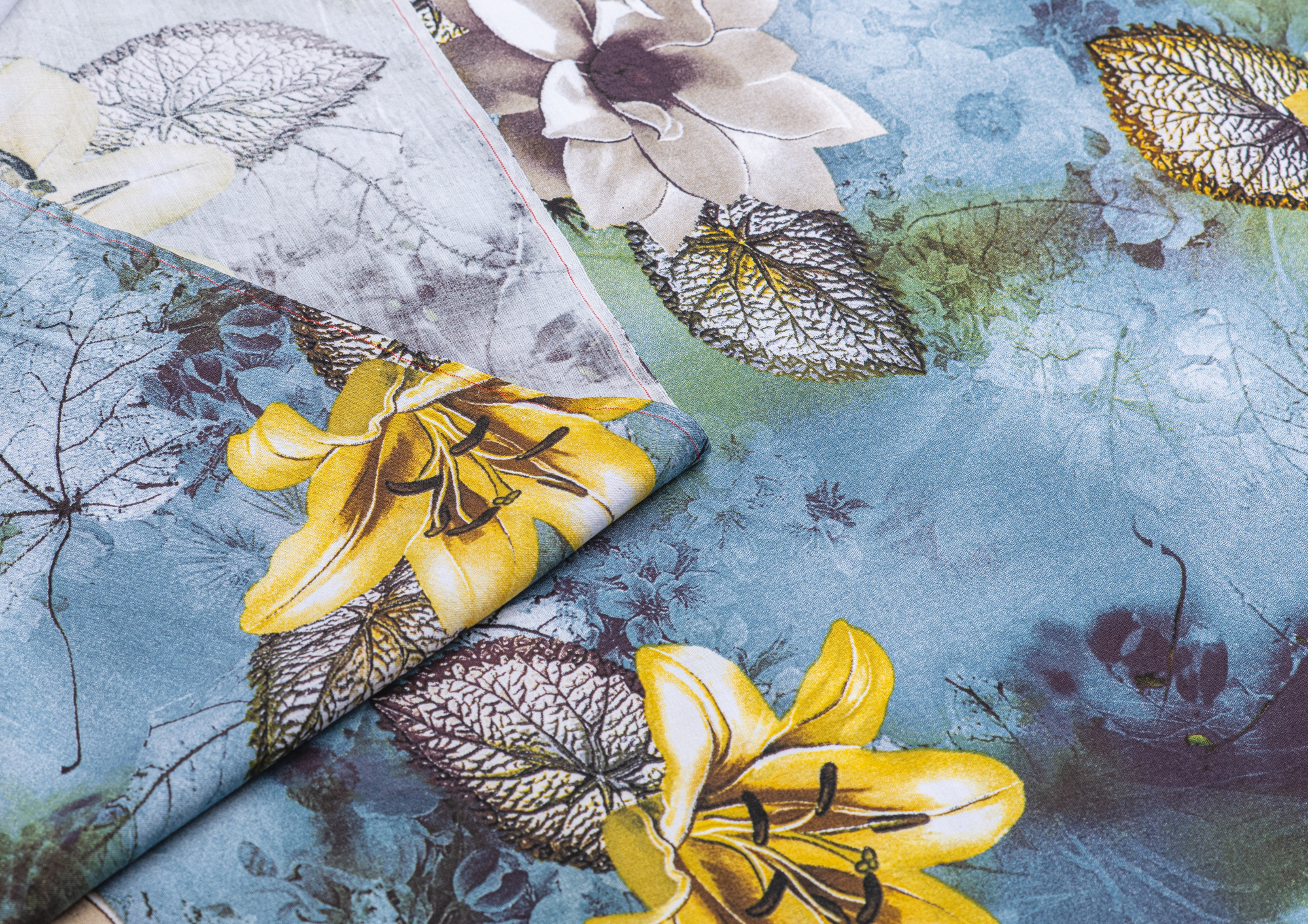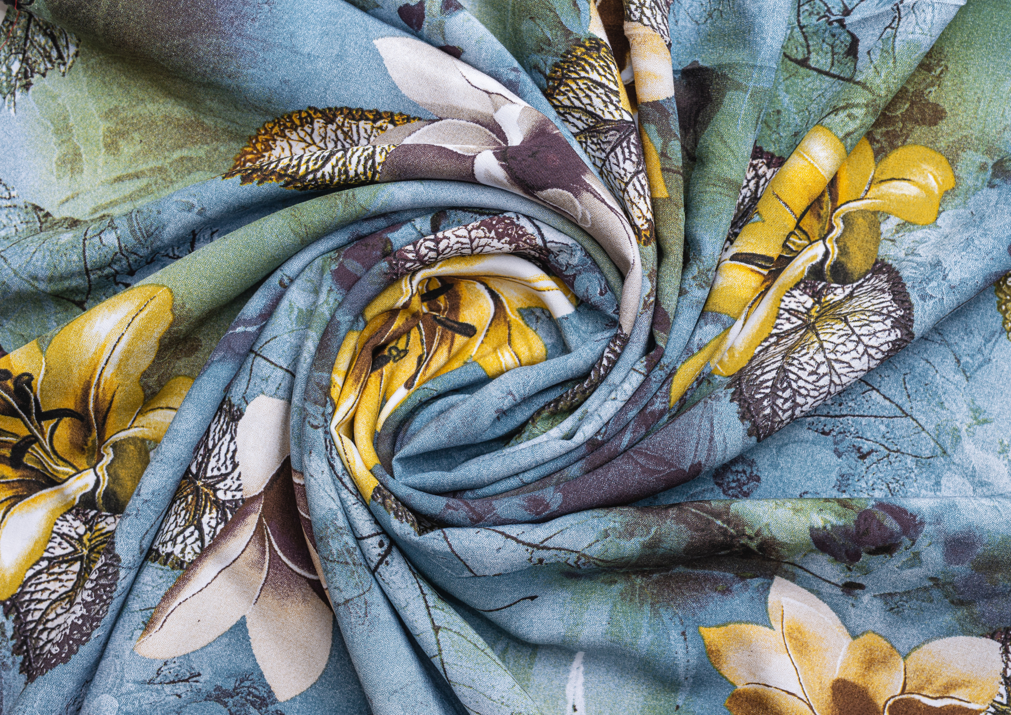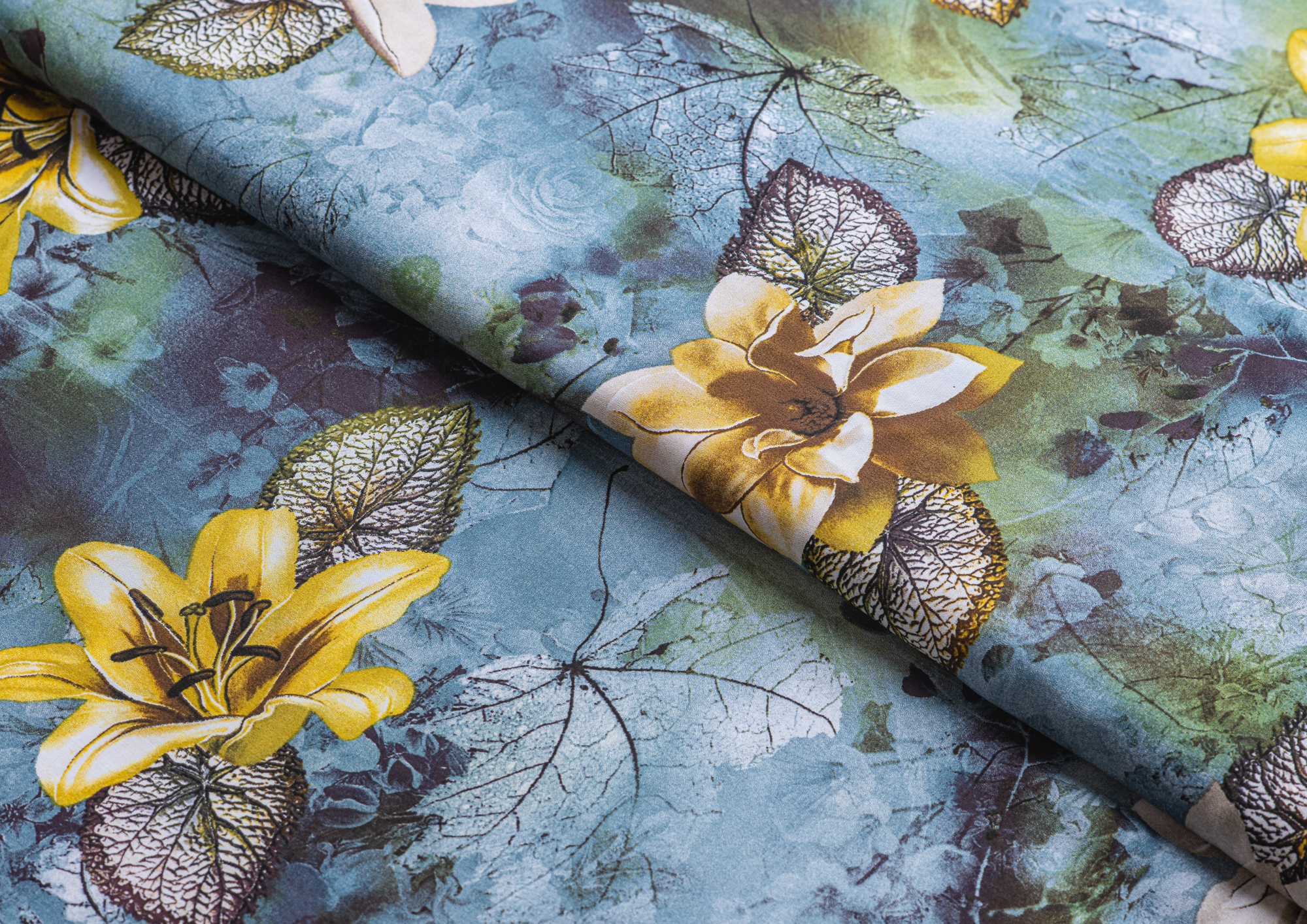 Ткань Штапель принт № 43 Лилии на серо-голубом