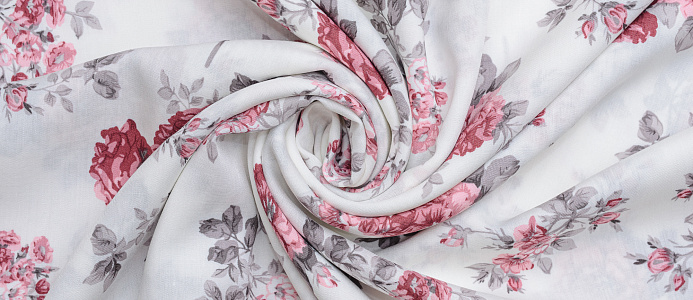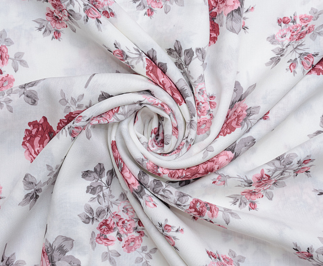Легкая , мягкая , приятная на ощупь ткань . Поверхность шелковистая . По всей поверхности ткани расположен цветочный принт. Ткань воздухопроницаемая, хорошо подходит для жаркой погоды. Отлично драпируется , образовывая мягкие складки. Подходит для пошива платьев, сарафанов, халатов, юбок.