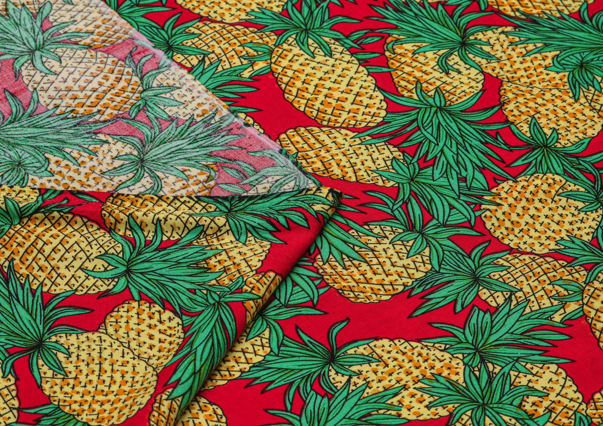 Легкая , мягкая , приятная на ощупь ткань . Поверхность шелковистая . По всей поверхности расположен равномерно принт  - ананасы  Ткань воздухопроницаемая, хорошо подходит для жаркой погоды. Отлично драпируется , образовывая мягкие складки. Подходит для пошива платьев, сарафанов, халатов, юбок,