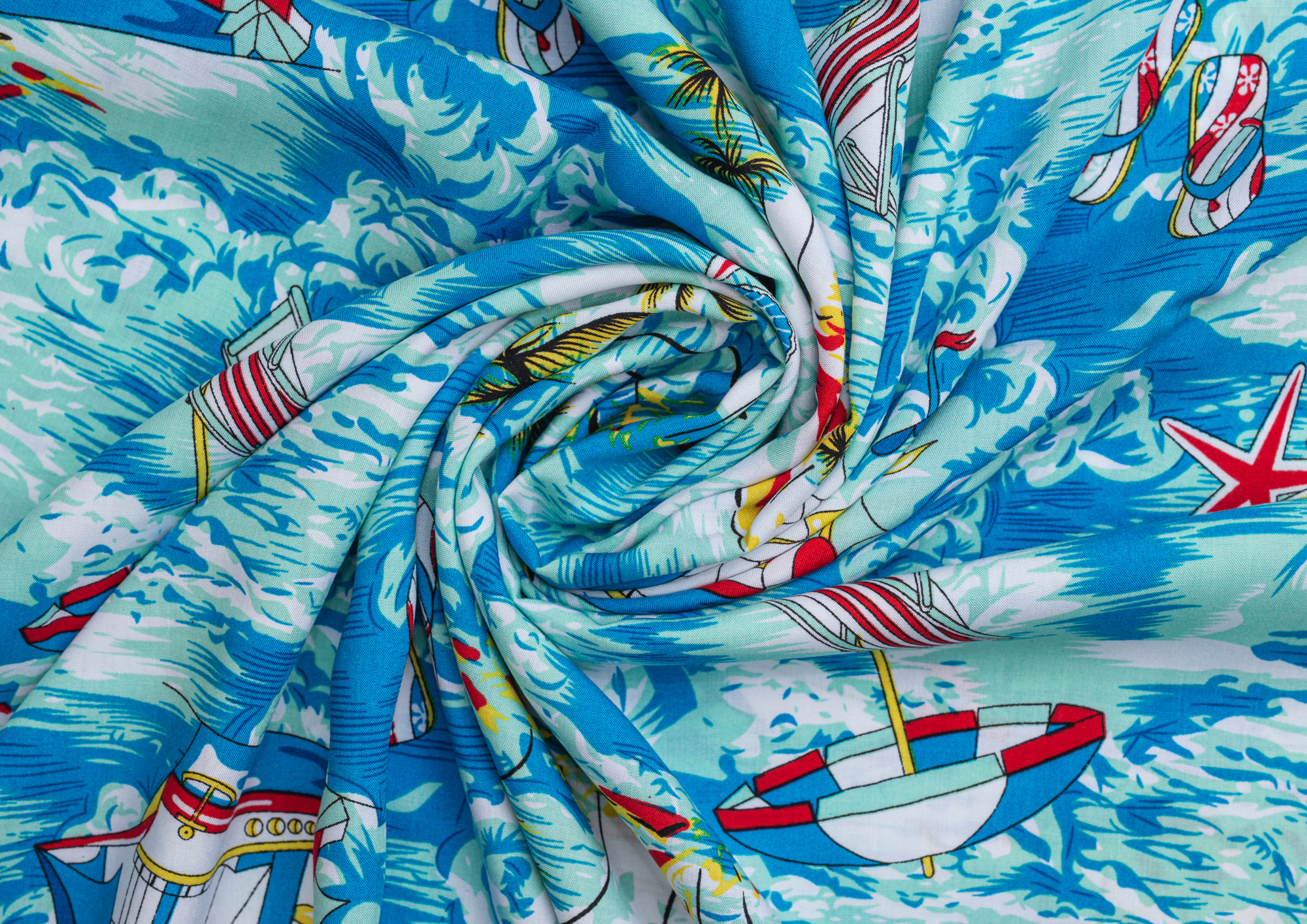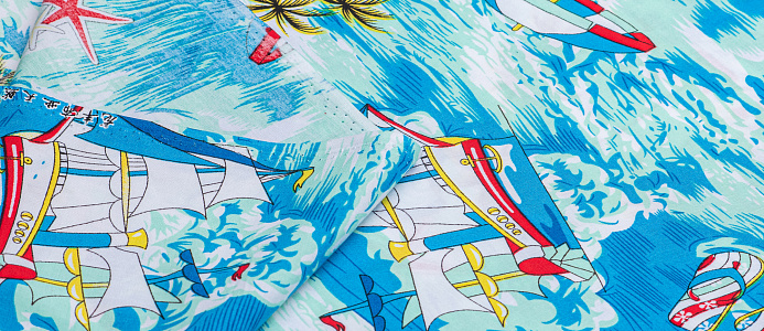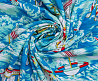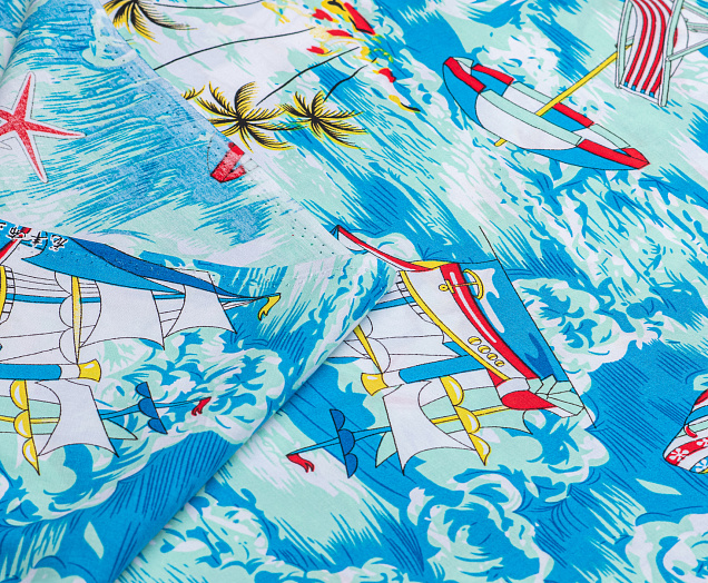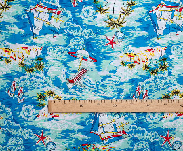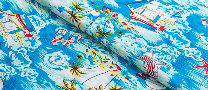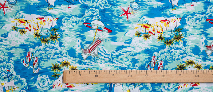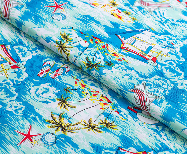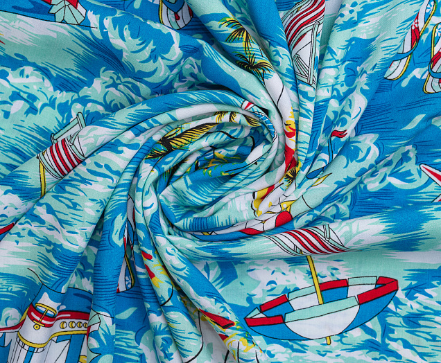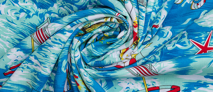 Легкая , мягкая , приятная на ощупь ткань . Поверхность шелковистая . По всему полотну расположен морской мотив . Ткань воздухопроницаемая, хорошо подходит для жаркой погоды. Отлично драпируется , образовывая мягкие складки. Подходит для пошива платьев, сарафанов, халатов, юбок, мужских и женских рубашек