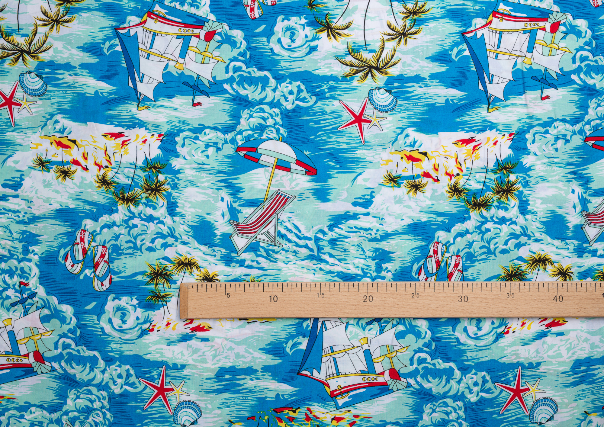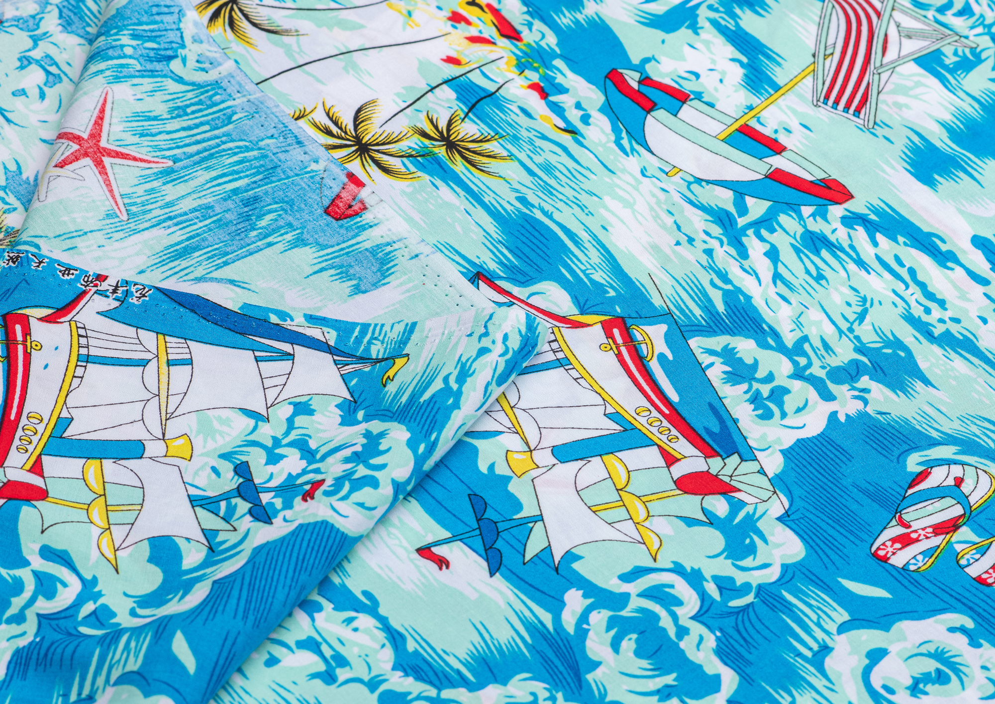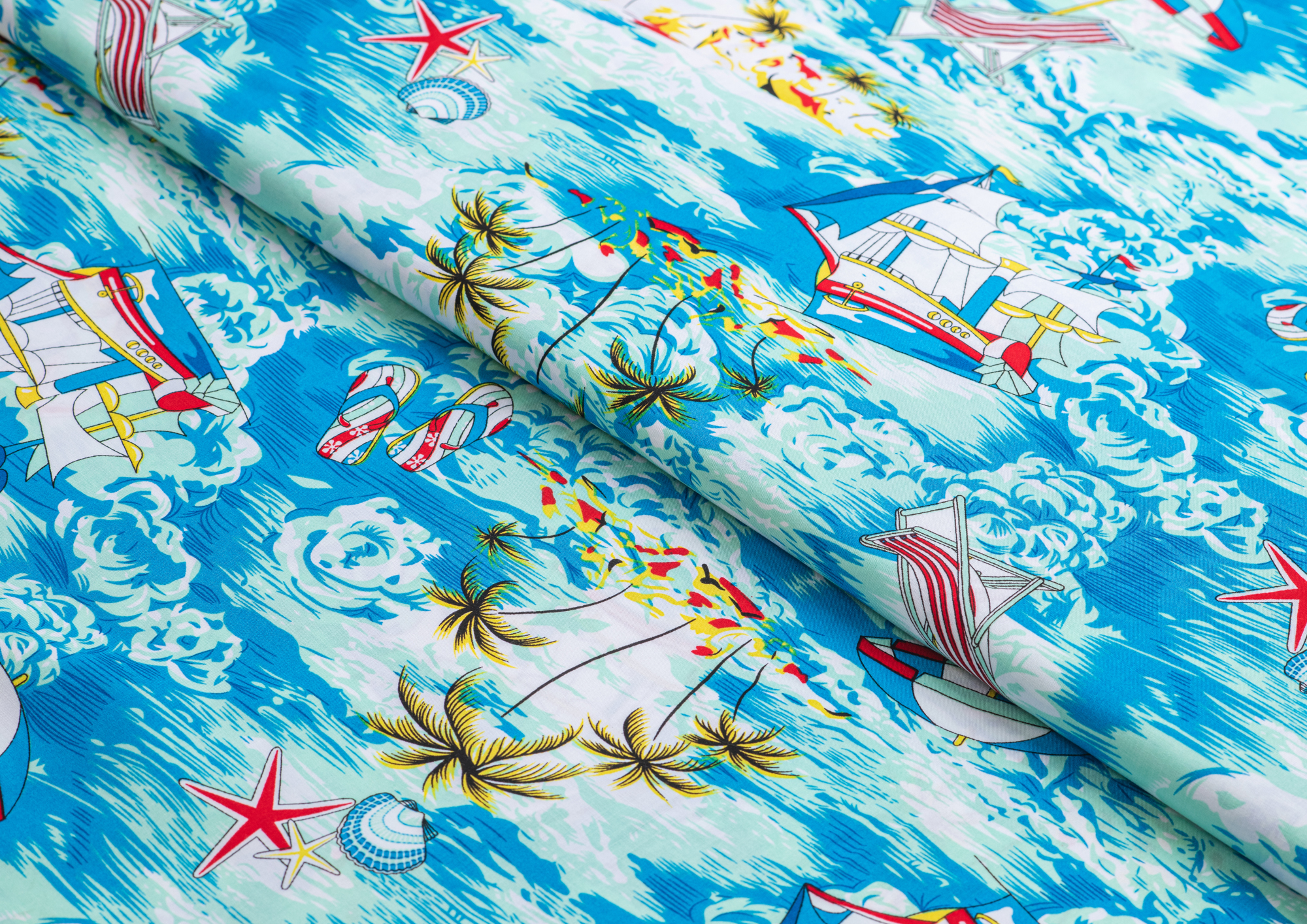 Легкая , мягкая , приятная на ощупь ткань . Поверхность шелковистая . По всему полотну расположен морской мотив . Ткань воздухопроницаемая, хорошо подходит для жаркой погоды. Отлично драпируется , образовывая мягкие складки. Подходит для пошива платьев, сарафанов, халатов, юбок, мужских и женских рубашек