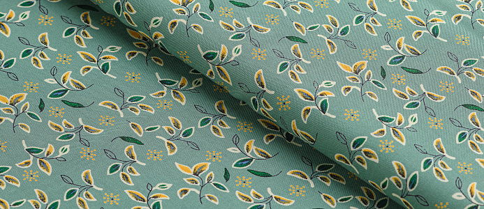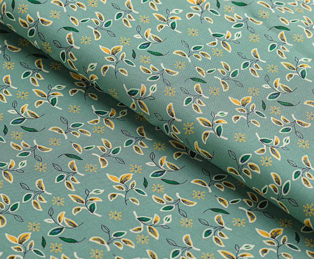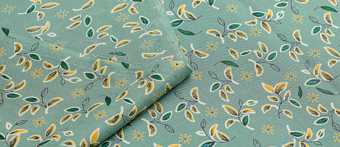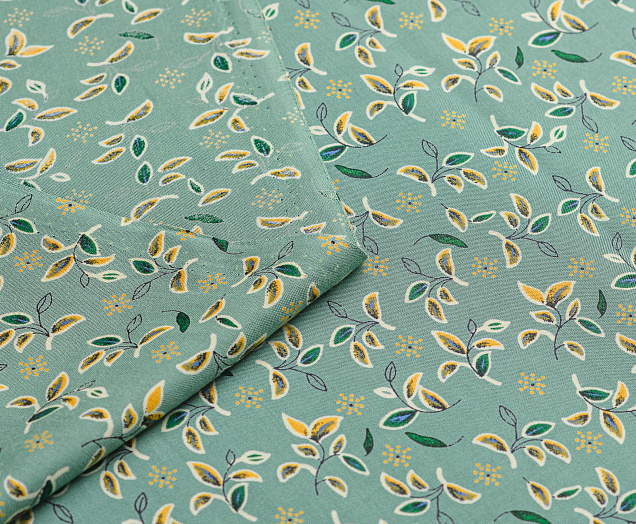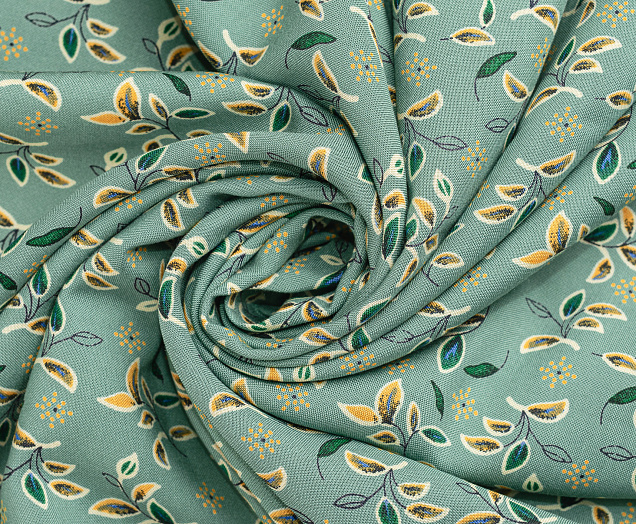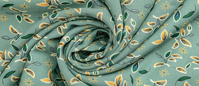 Легкая тонкая ткань с матовой шелковистой поверхностью. По всей длине полотна расположен принт листочки . Материал мягкий, приятный на ощупь, воздухопроницаемый, при драпировке образует мягкие складки. Применяется для пошива платьев, блузок, юбок и сарафанов.