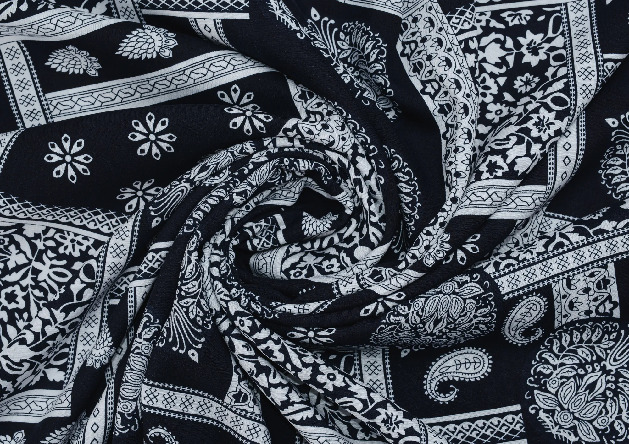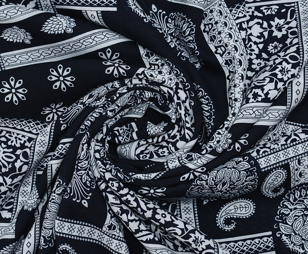 Легкая, мягкая, приятная на ощупь ткань. Поверхность шелковистая. По всей поверхности расположен равномерно принт. Ткань воздухопроницаемая, хорошо подходит для жаркой погоды. Отлично драпируется, образовывая мягкие складки. Подходит для пошива платьев, сарафанов, халатов, юбок,