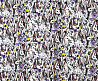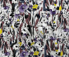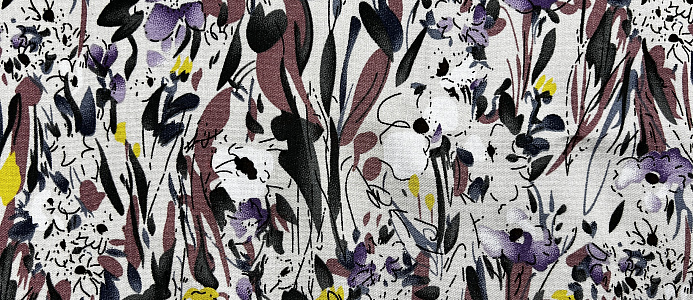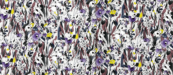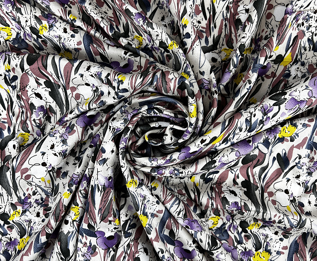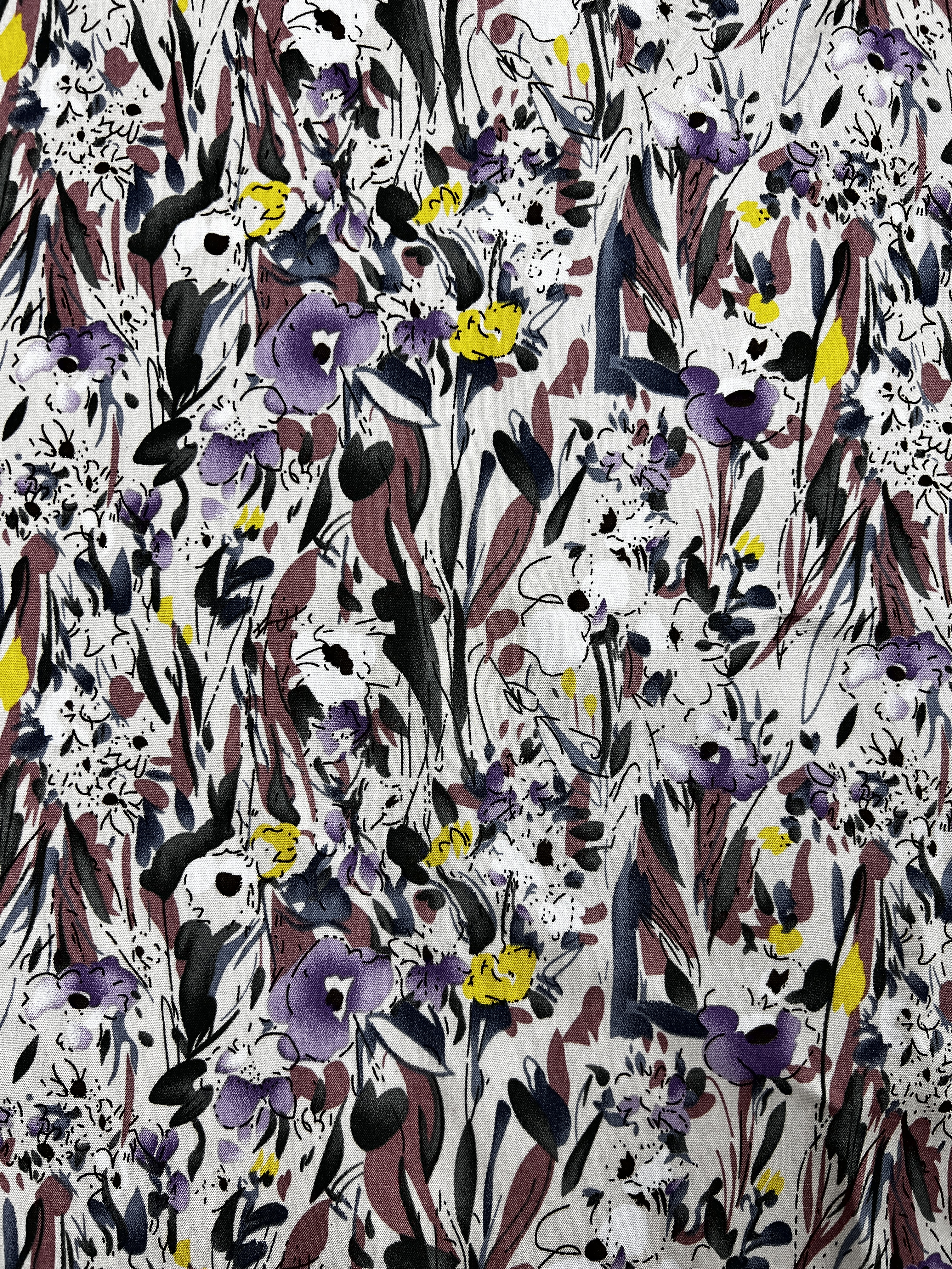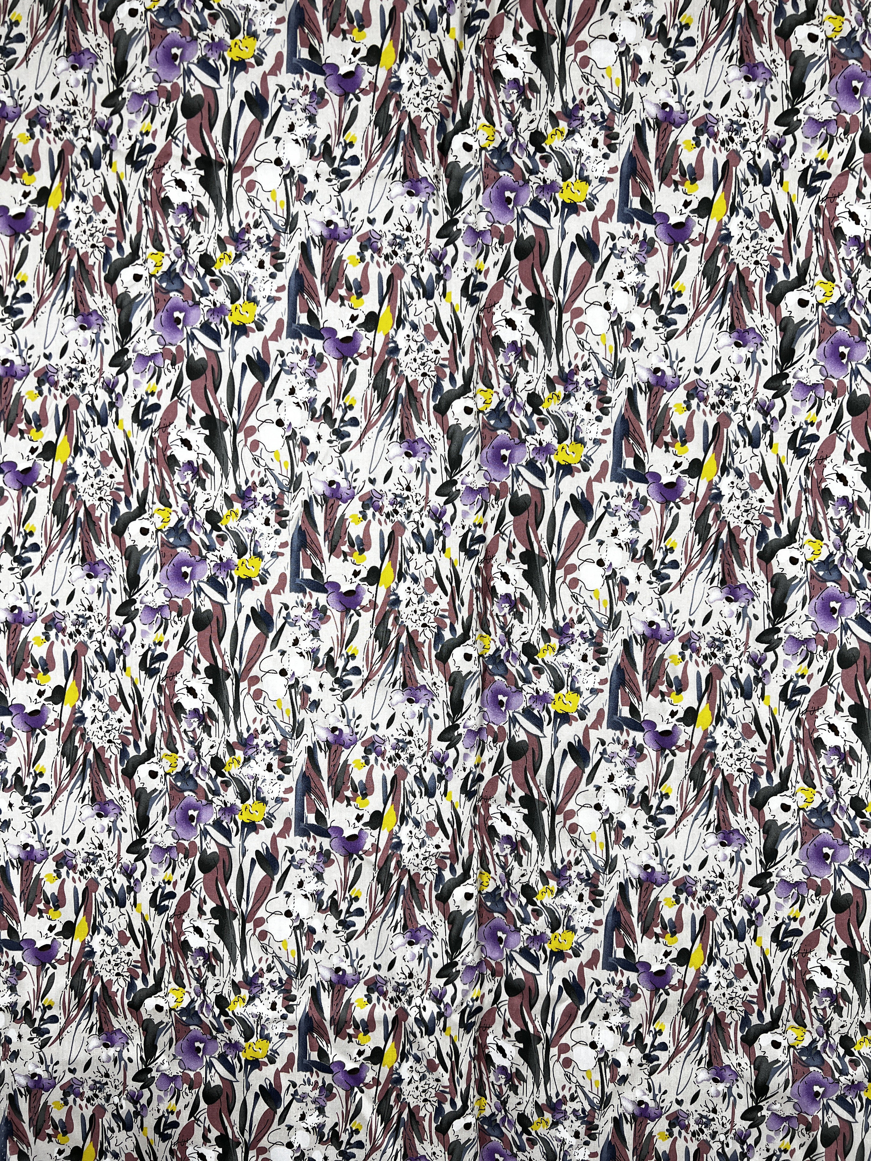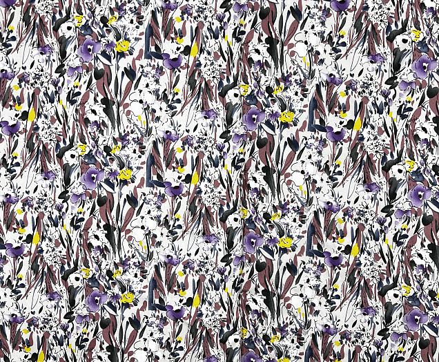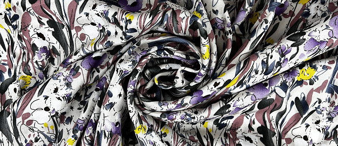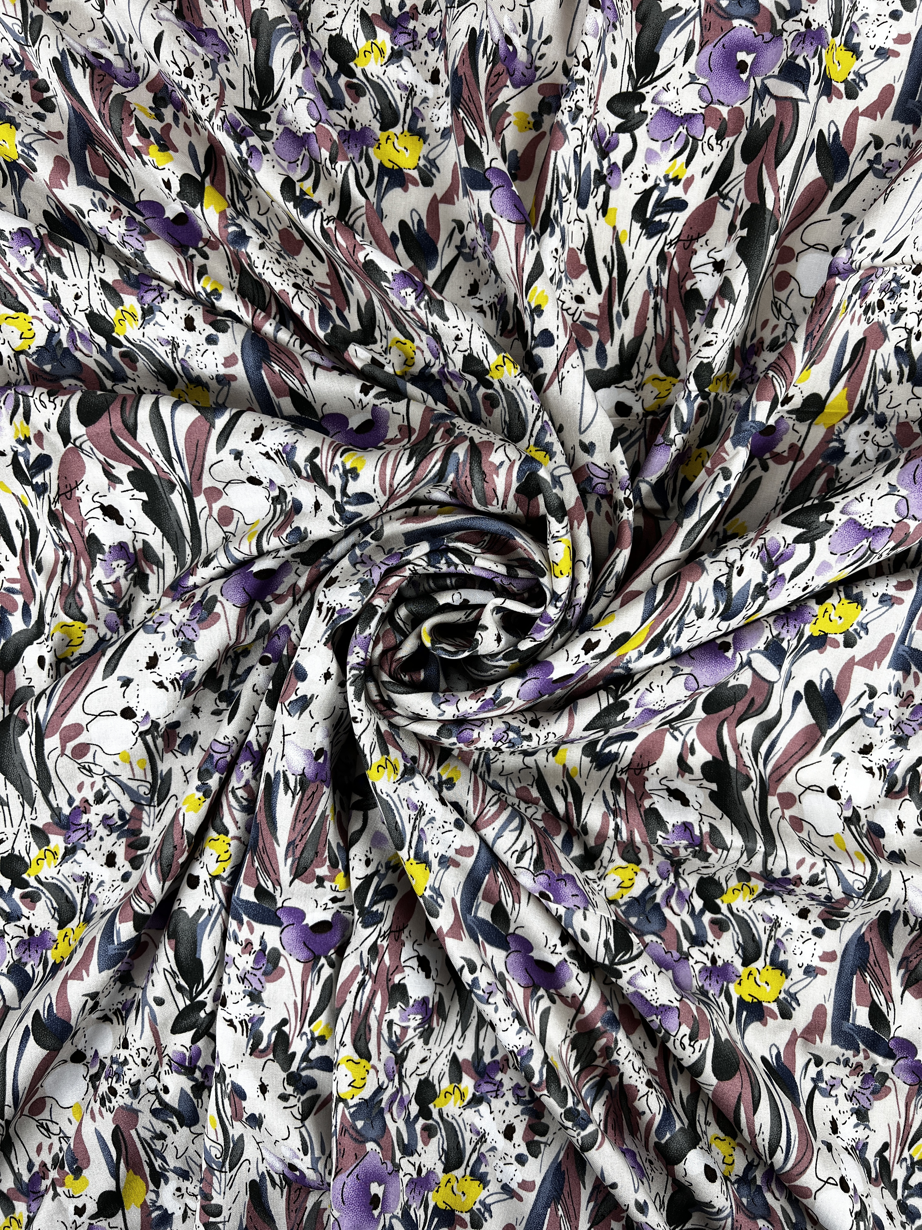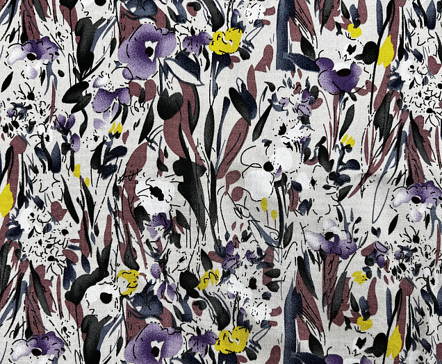 Ткань Штапель принт желто-сиреневые цветы на белом