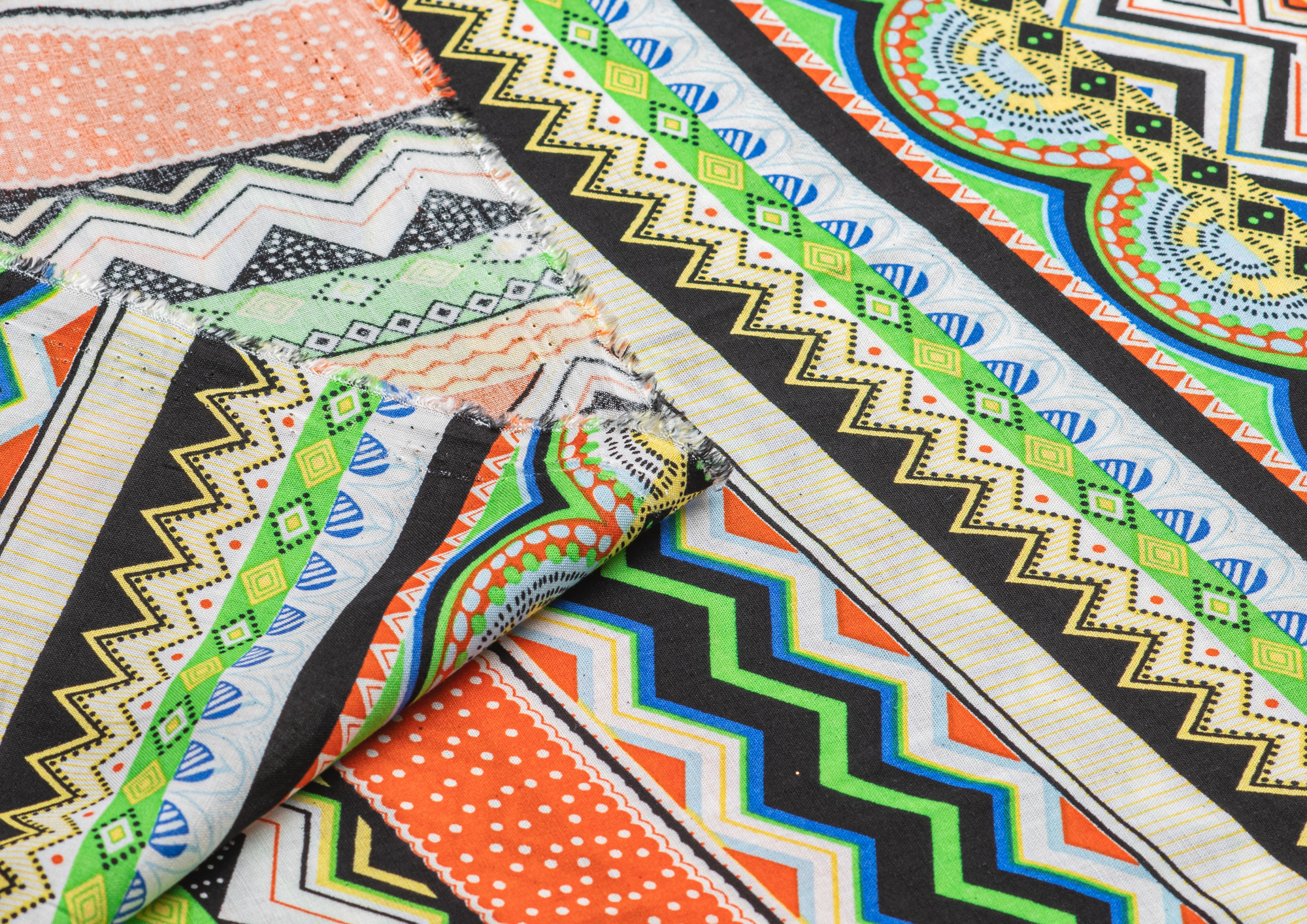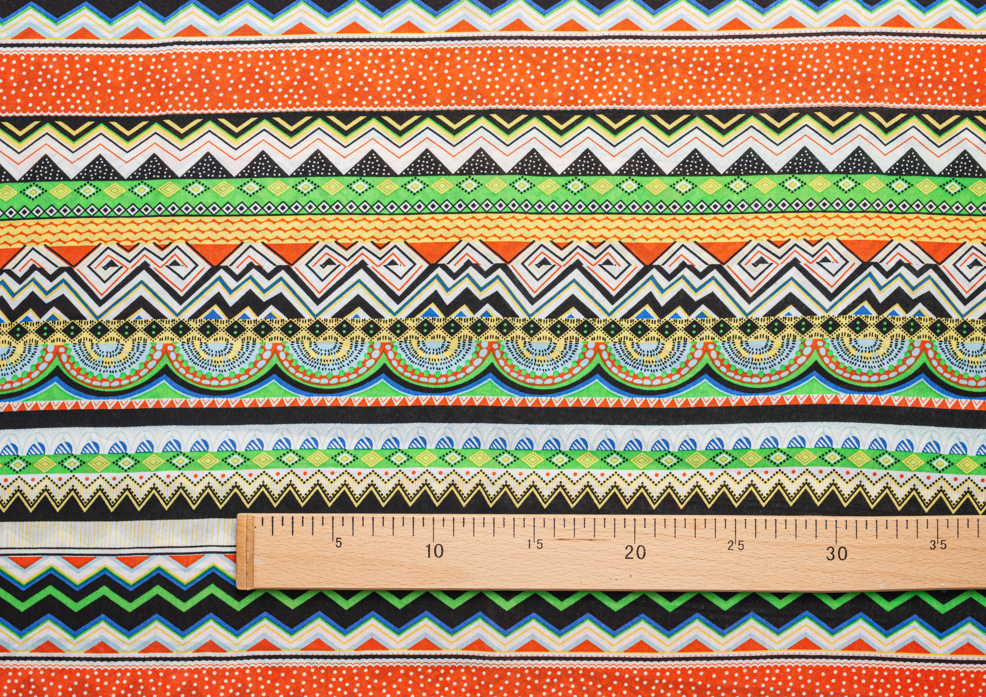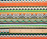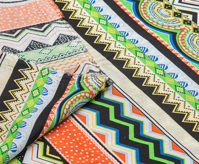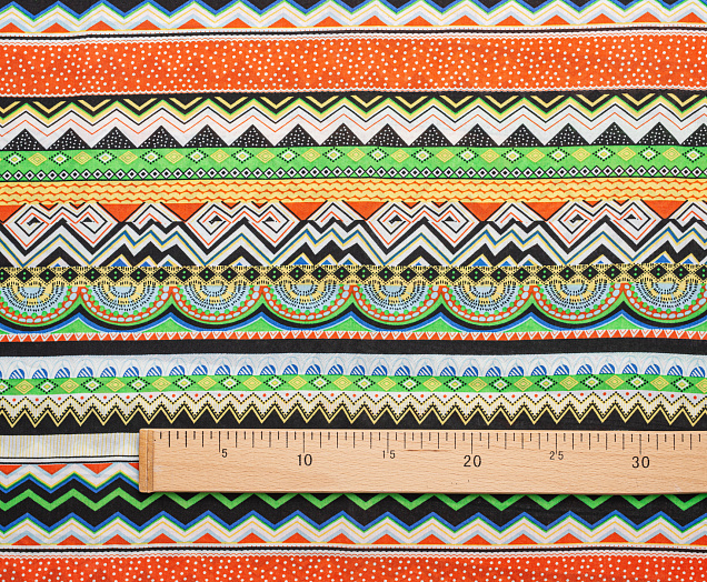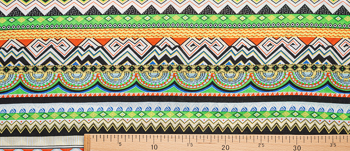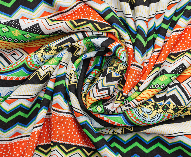 Легкая , мягкая , приятная на ощупь ткань . Поверхность шелковистая . Поперек полотна расположены разные полоски с яркими геометрическими фигурами .  Ткань воздухопроницаемая, хорошо подходит для жаркой погоды. Отлично драпируется , образовывая мягкие складки. Подходит для пошива платьев, сарафанов, халатов, юбок.