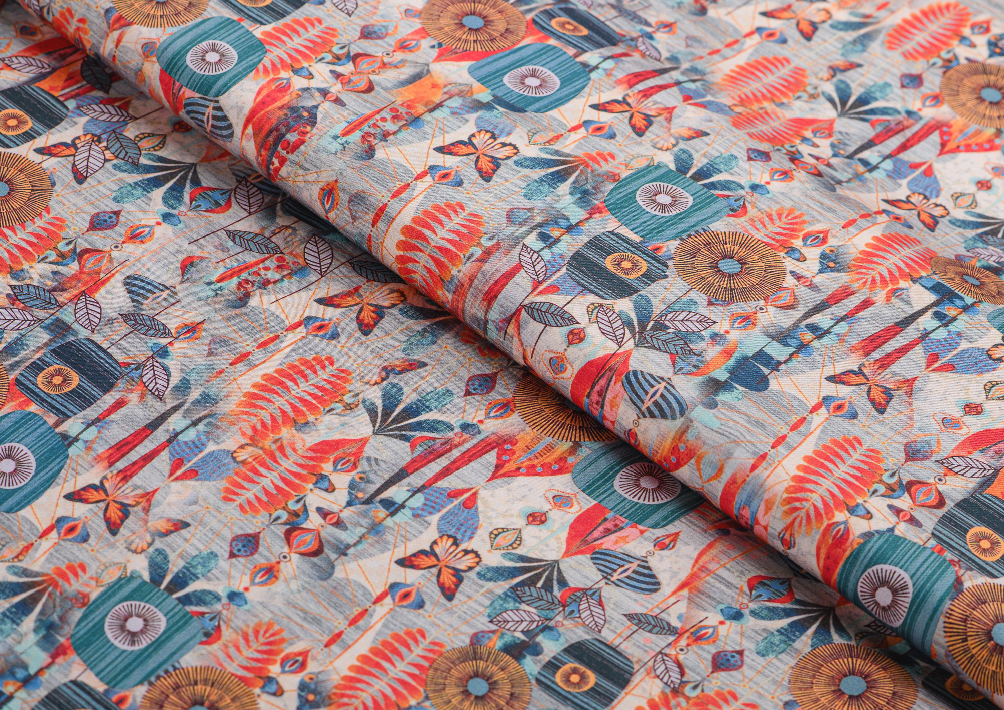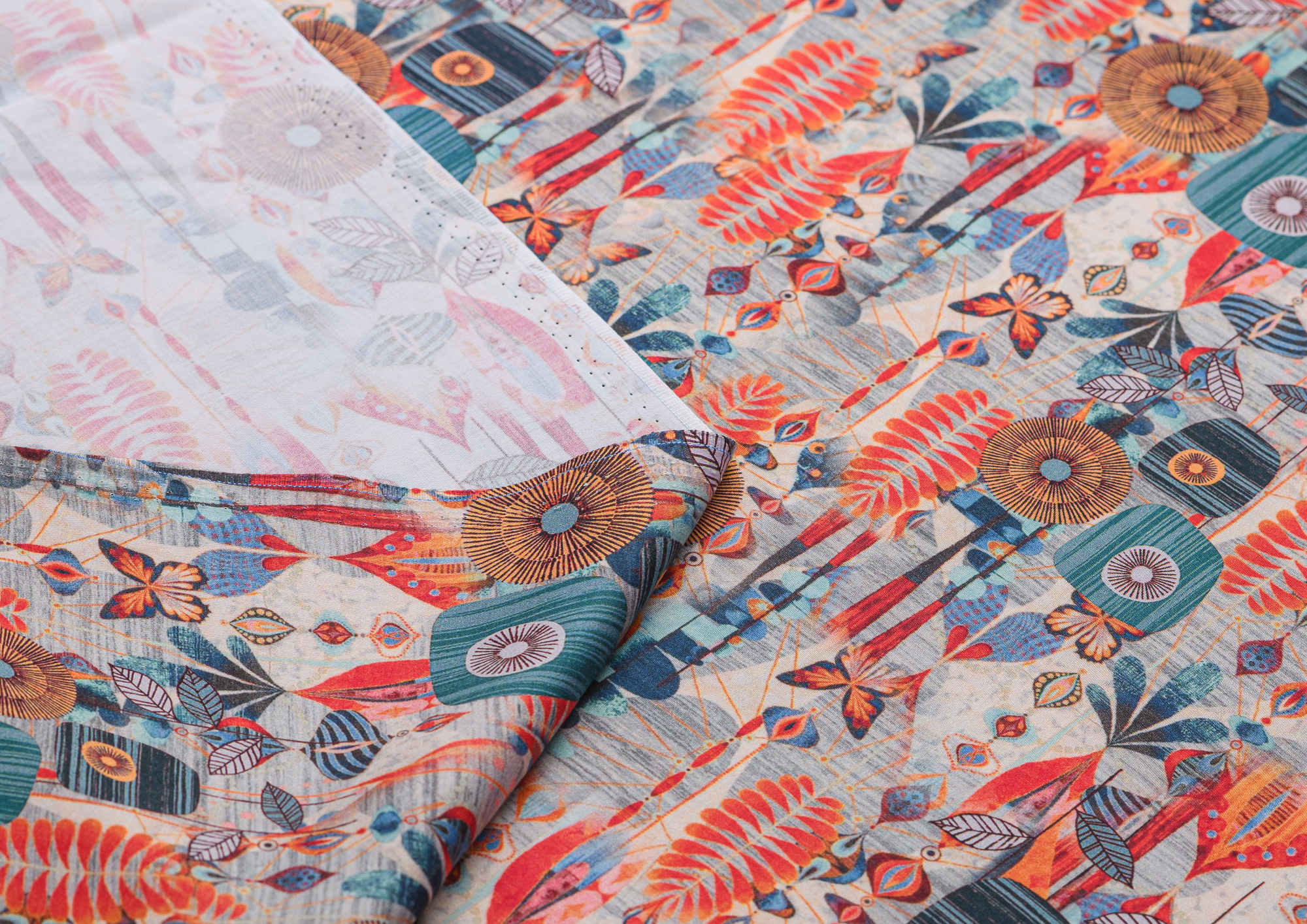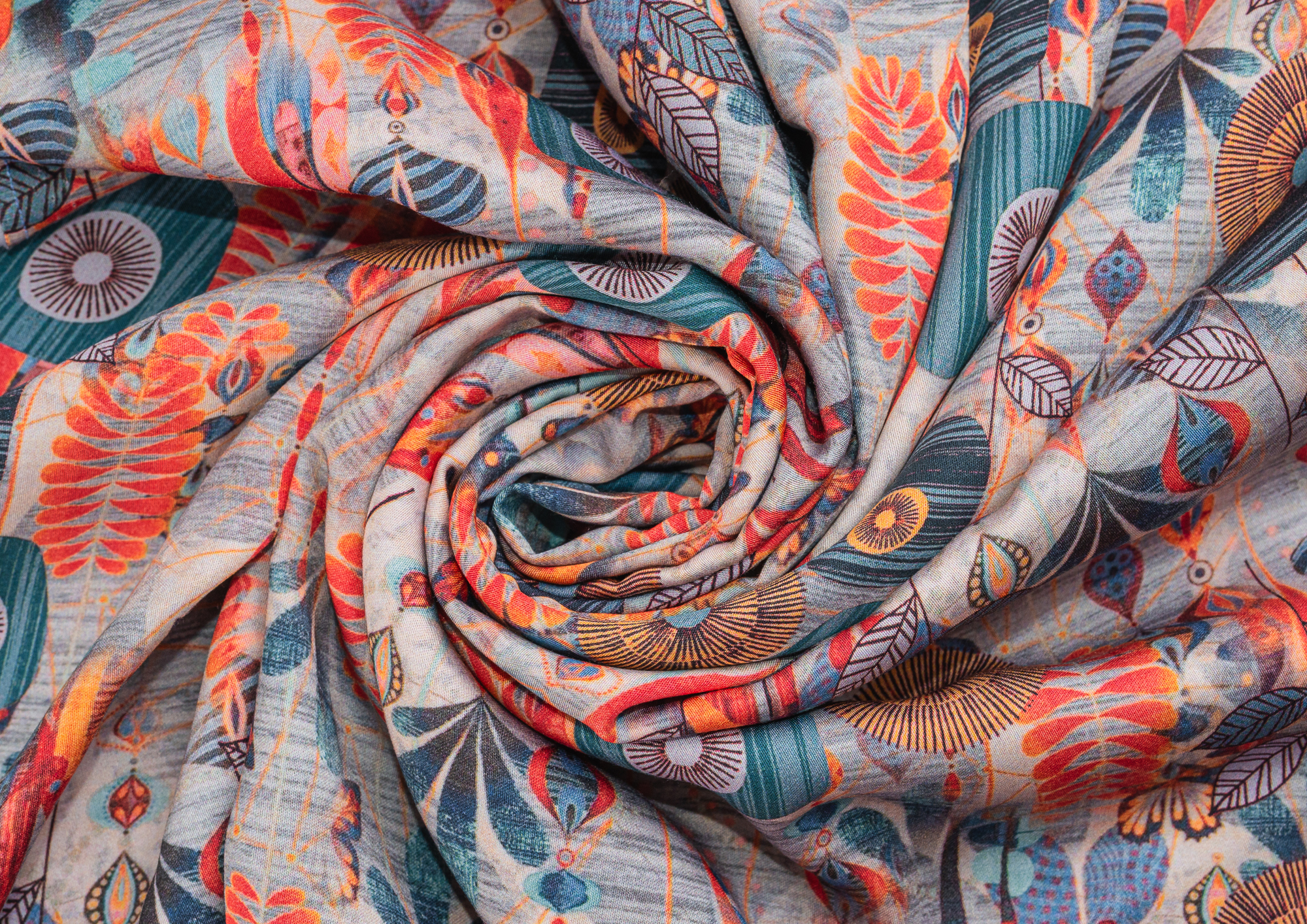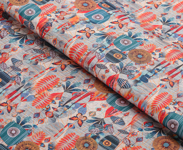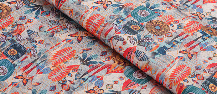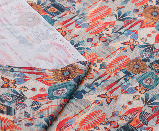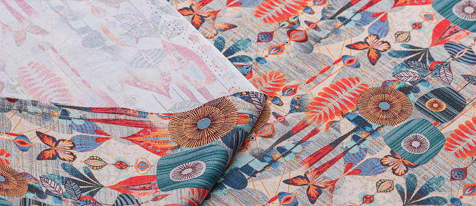 Легкая, мягкая, приятная на ощупь ткань. Поверхность шелковистая. По всей поверхности ткани расположен принт. Ткань воздухопроницаемая, хорошо подходит для жаркой погоды. Отлично драпируется, образовывая мягкие складки. Подходит для пошива платьев, сарафанов, халатов, юбок.