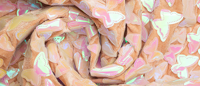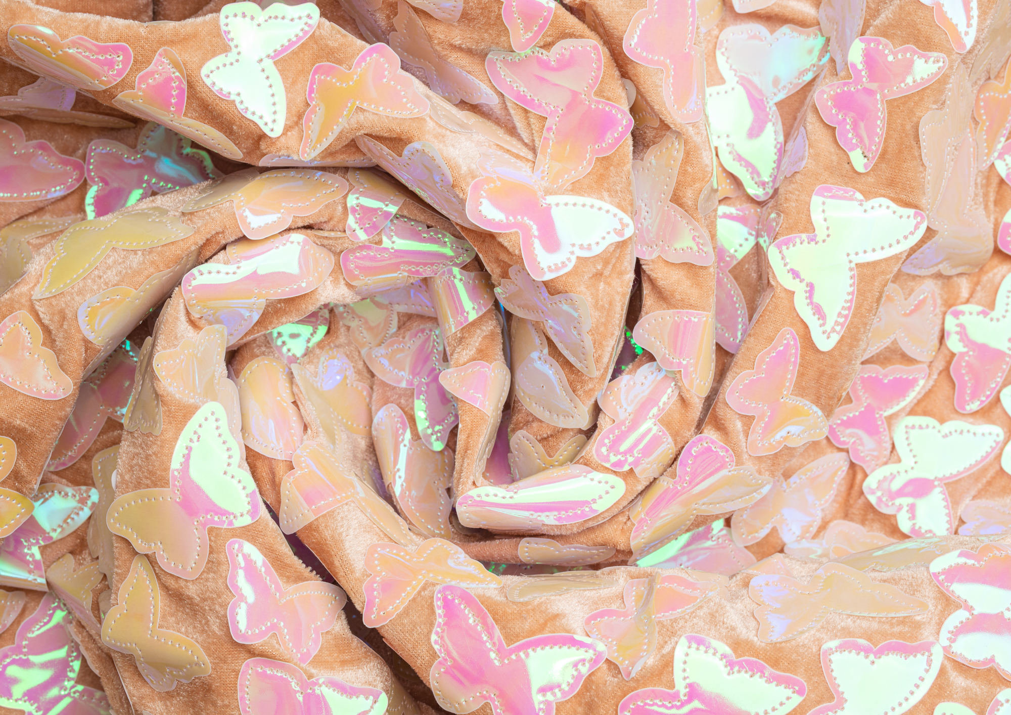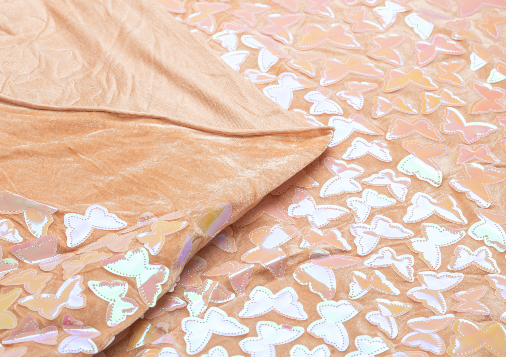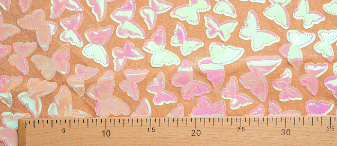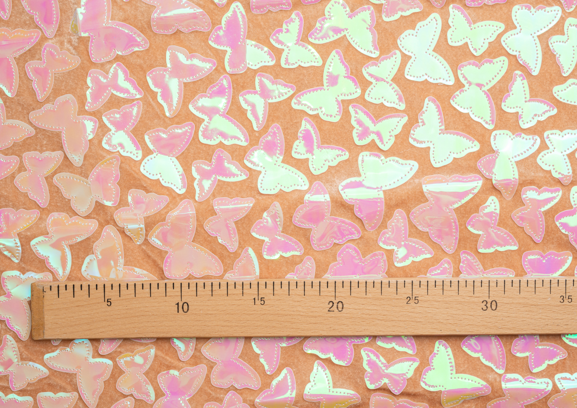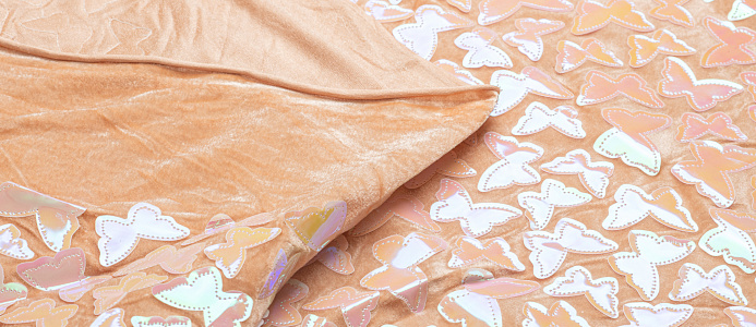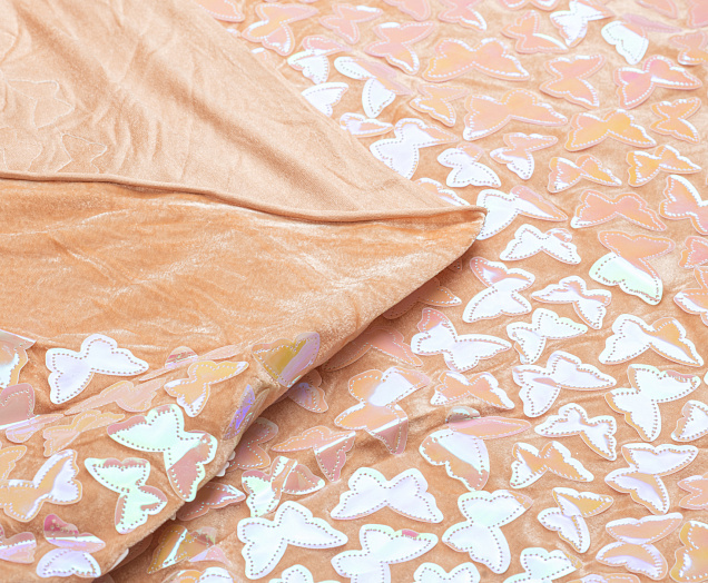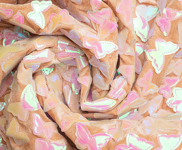 Коротковорсный бархат стрейч расшит галографическими бабочками . Ткань подходит для пошива вечерних и новогодних костюмов , а так же для изготовления стильных аксессуаров.Ширина 160 см  Ширина расшитая бабочками 135 см