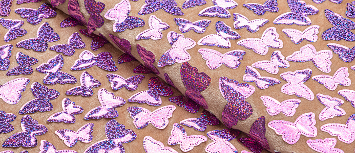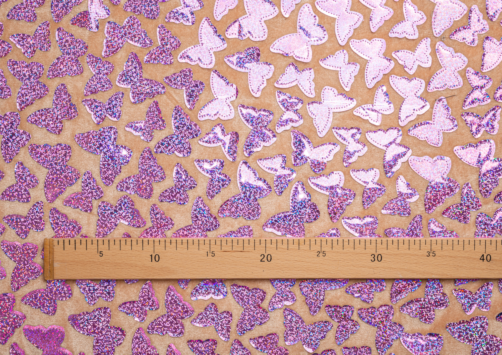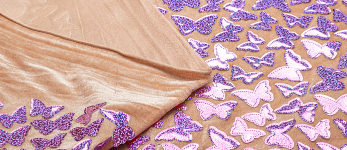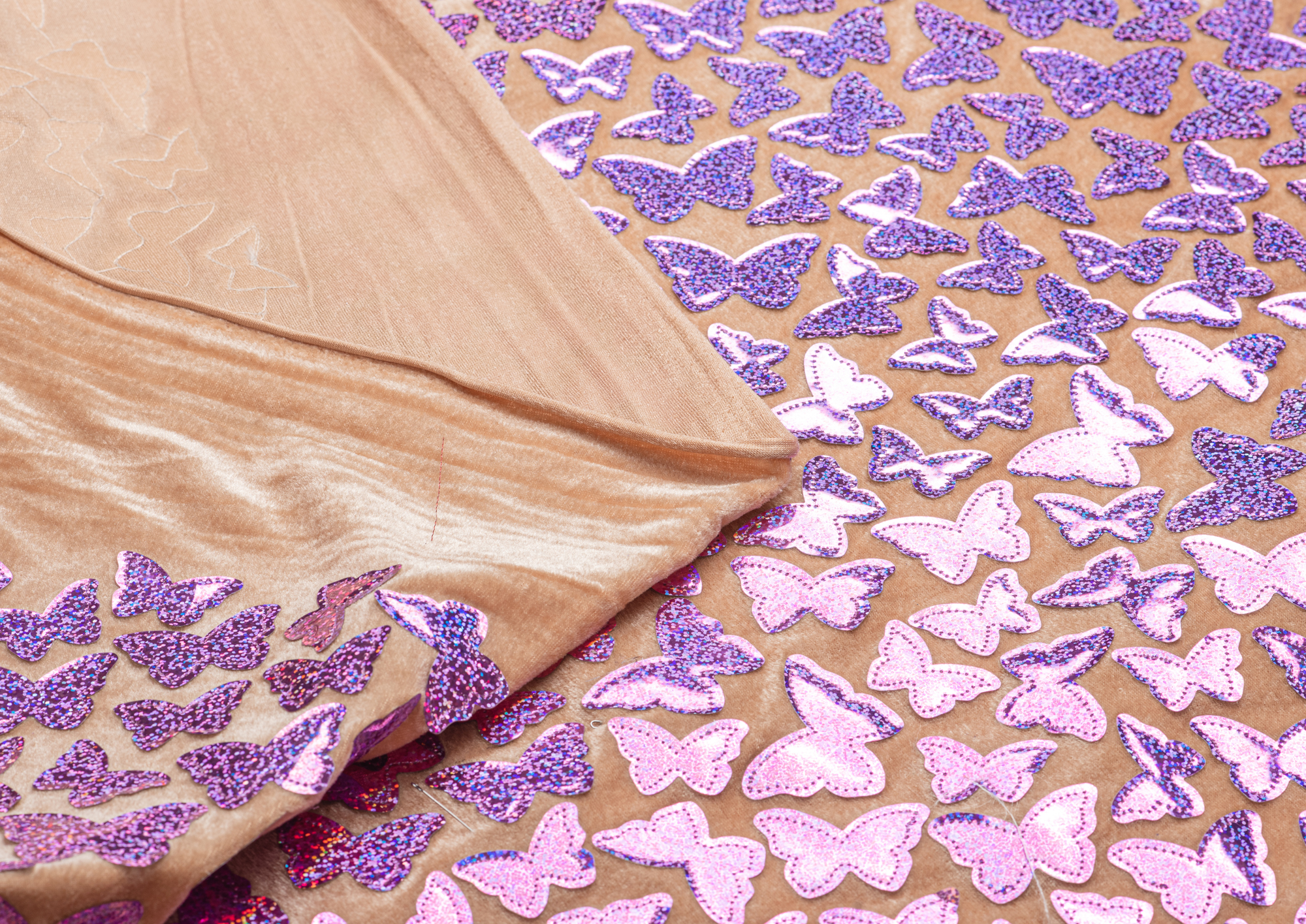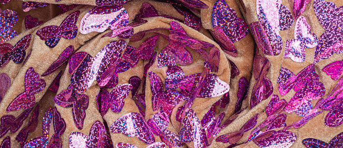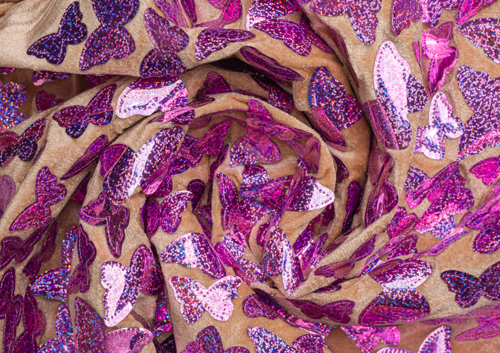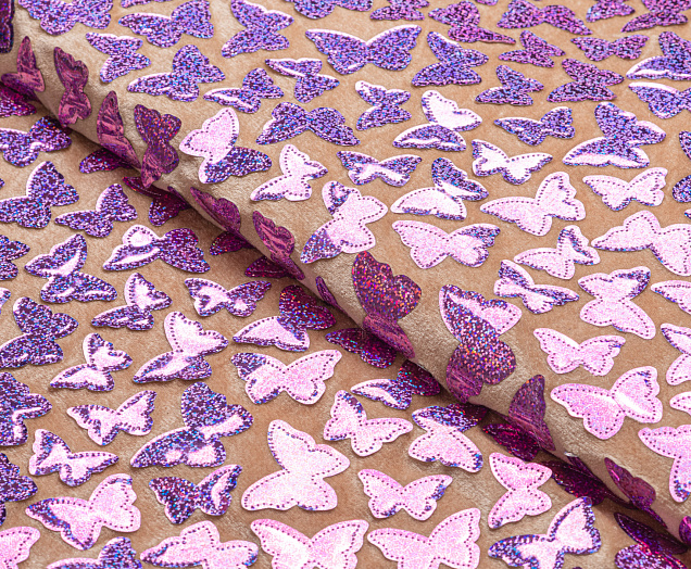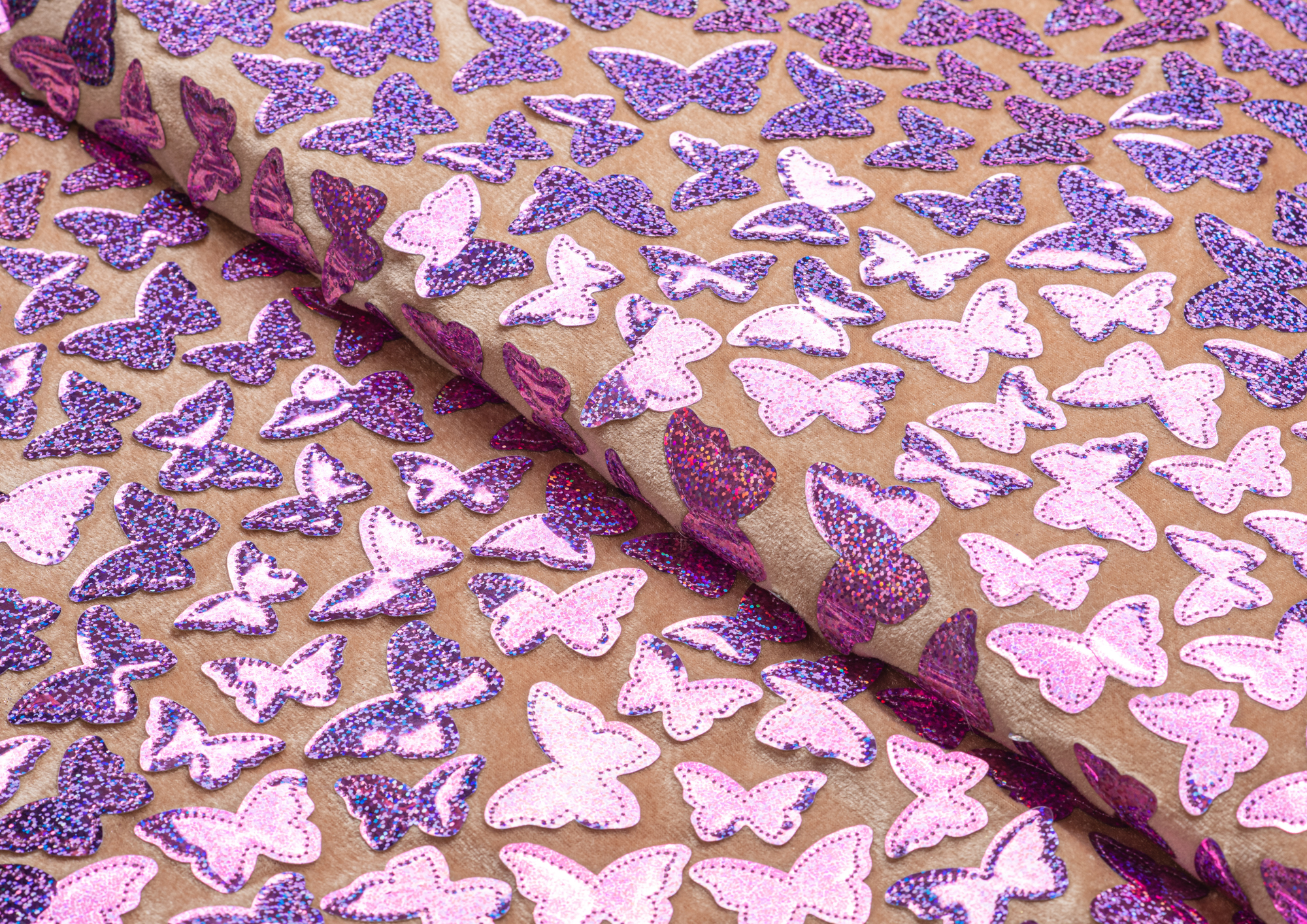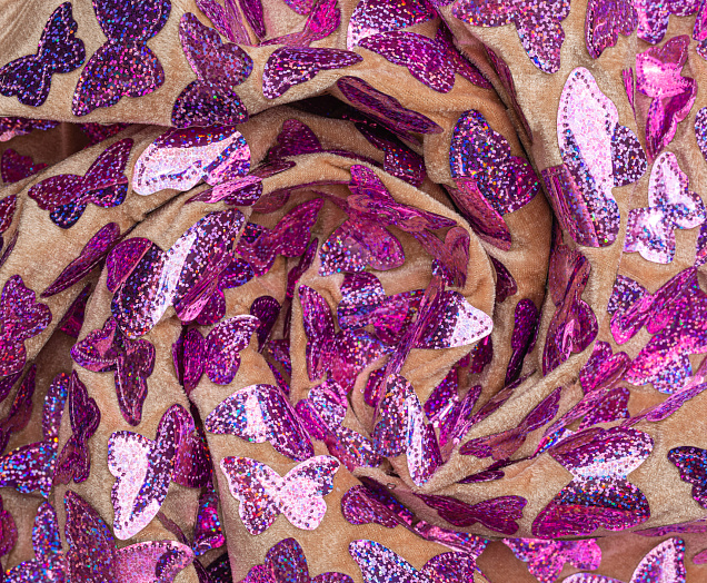 Коротковорсный бархат стрейч расшит галографическими бабочками . Ткань подходит для пошива вечерних и новогодних костюмов , а так же для изготовления стильных аксессуаров.Ширина 160 см  Ширина расшитая бабочками 135 см