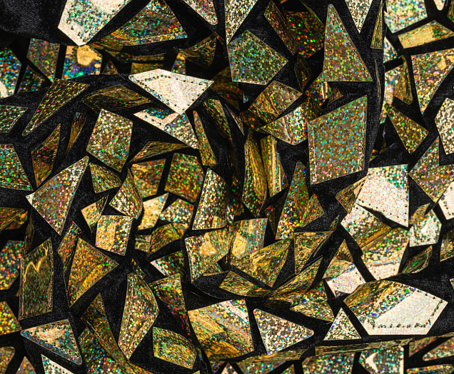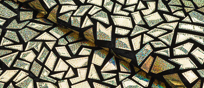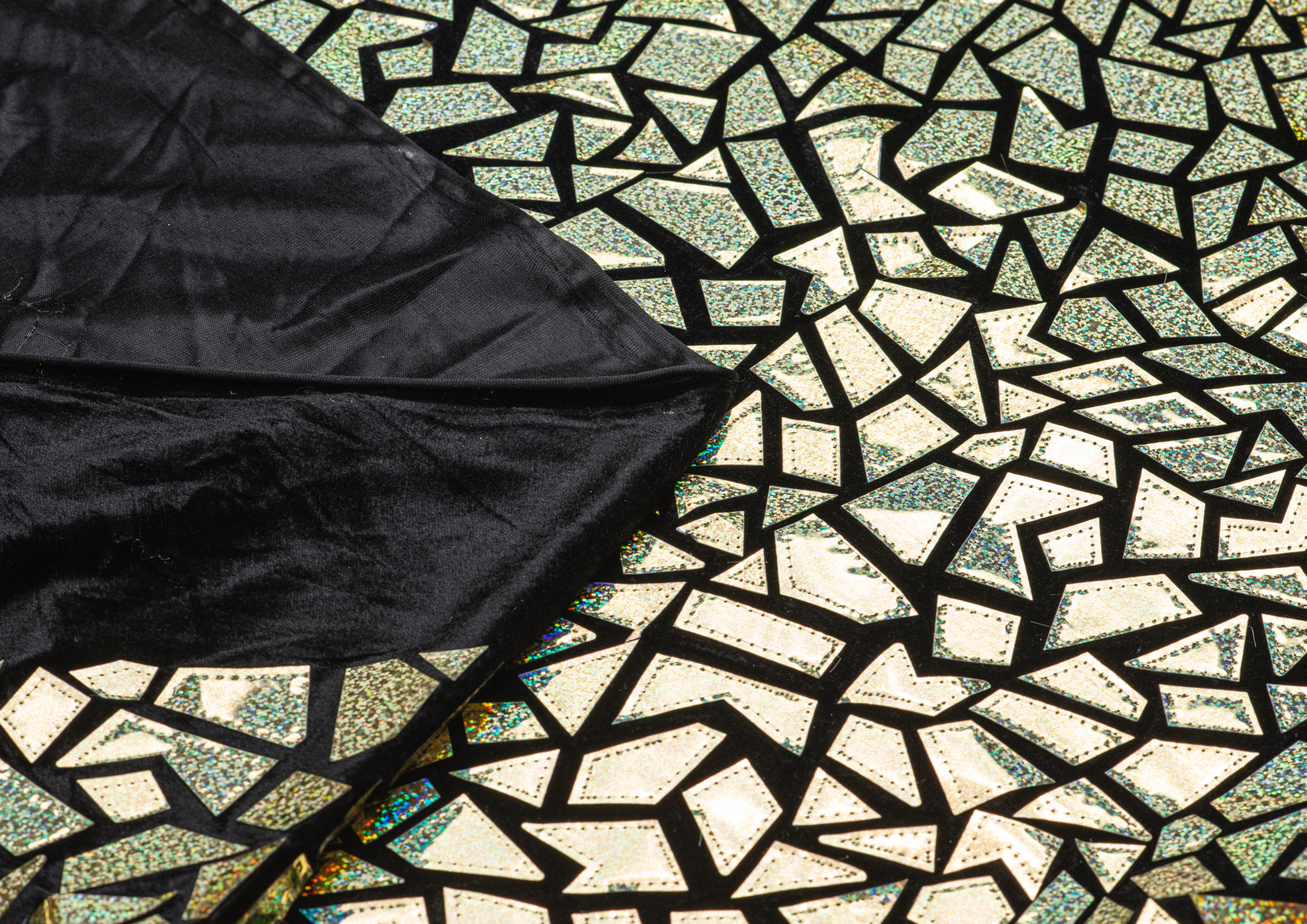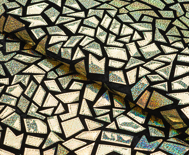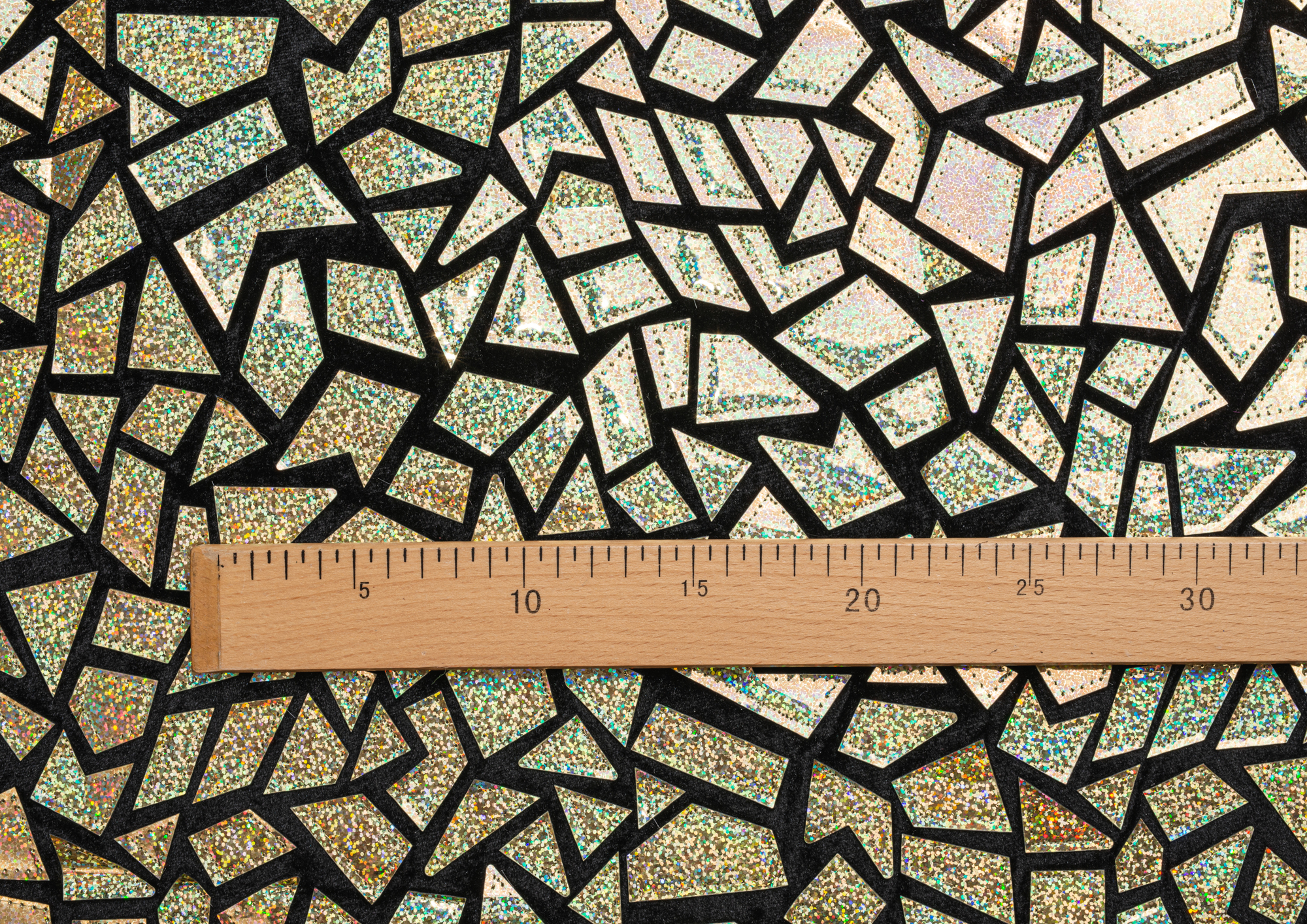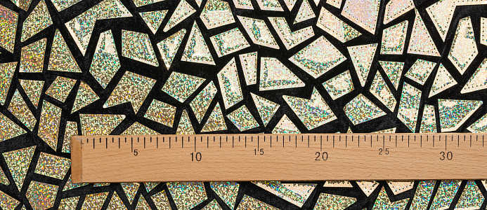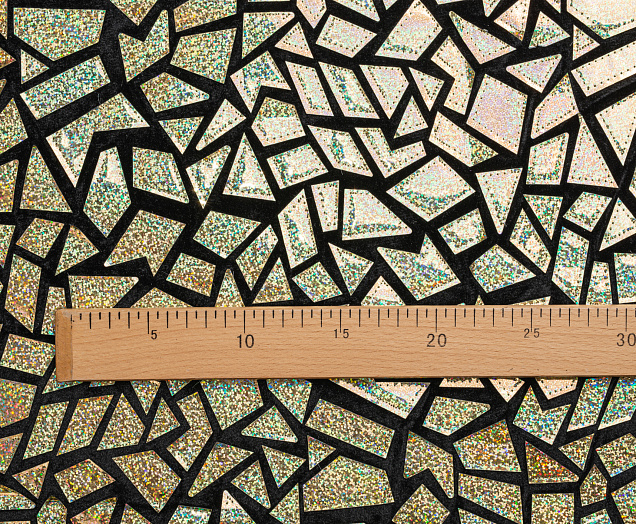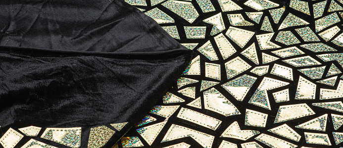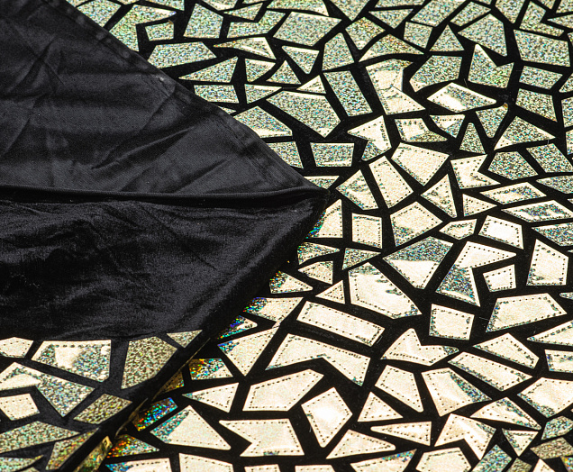 Коротковорсный бархат стрейч расшит галографическими фигурами . Ткань подходит для пошива вечерних и новогодних костюмов , а так же для изготовления стильных аксессуаров.Ширина 160 см  Ширина расшитая фигурами 130 см