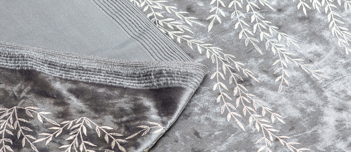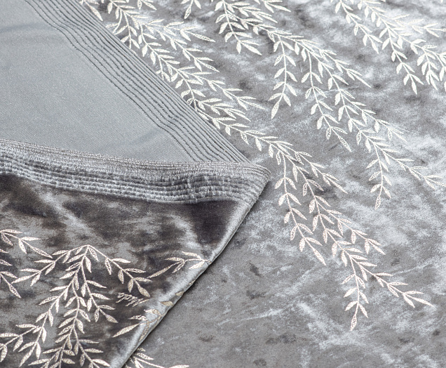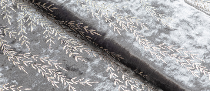 Мягкая ткань , лицевая сторона с ворсом, вдоль обоих кромок нанесен рисунок в виде веточек , изнанка гладкая трикотажная. Поверхность немного с блеском . При крое обязательно нужно учитывать направление ворса! Платье из бархата всегда выглядит нарядно , отлично подходит для пошива вечернего наряда а так же для концертных выступлений .