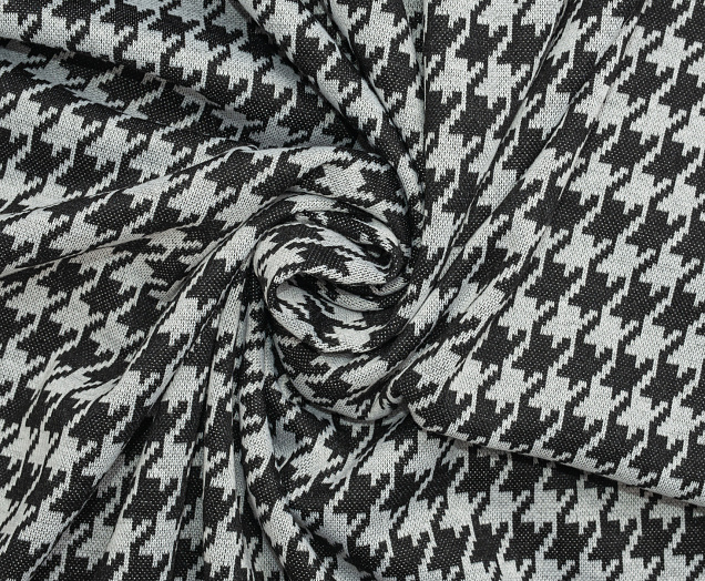 Тонкое, эластичное трикотажное полотно. По всей поверхности полотна расположен рисунок Гусиная лапка. Подходит для пошива домашних изделий , а так же платьев, блузок .