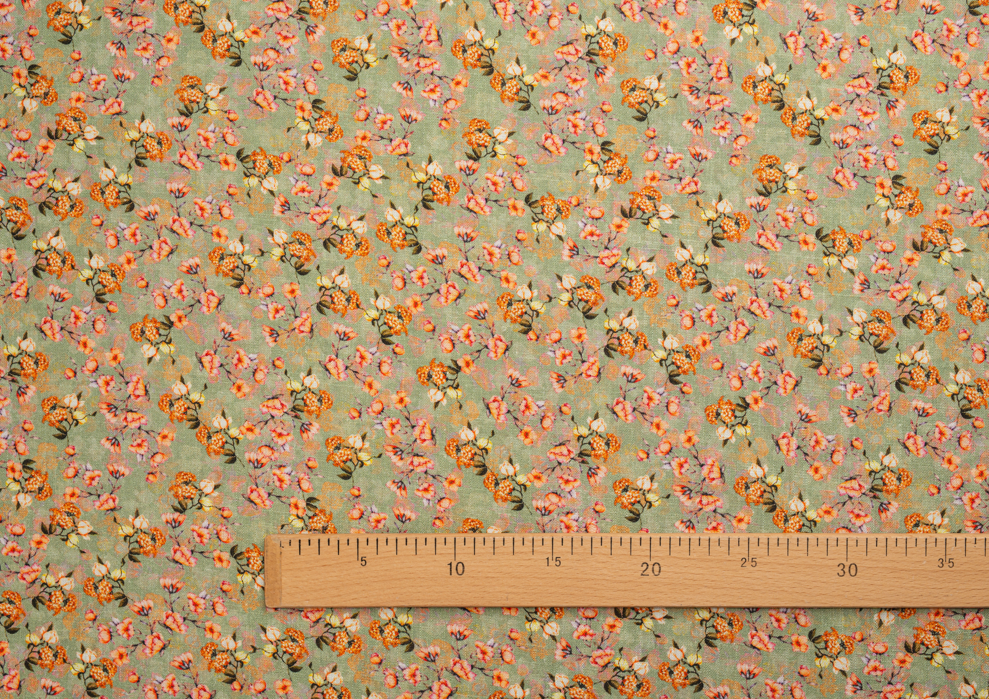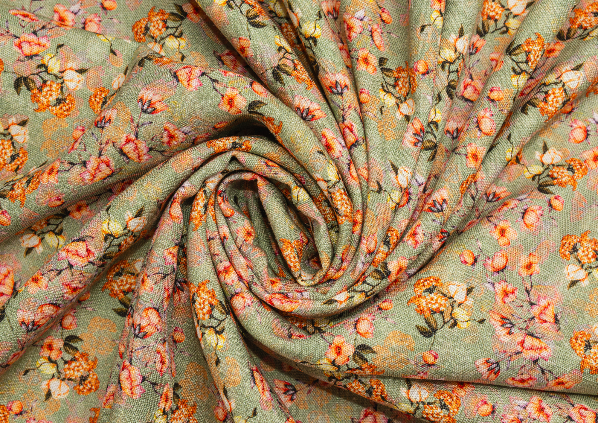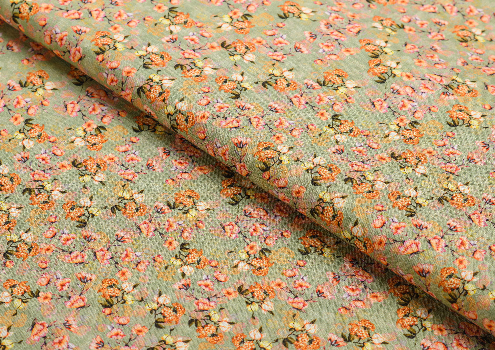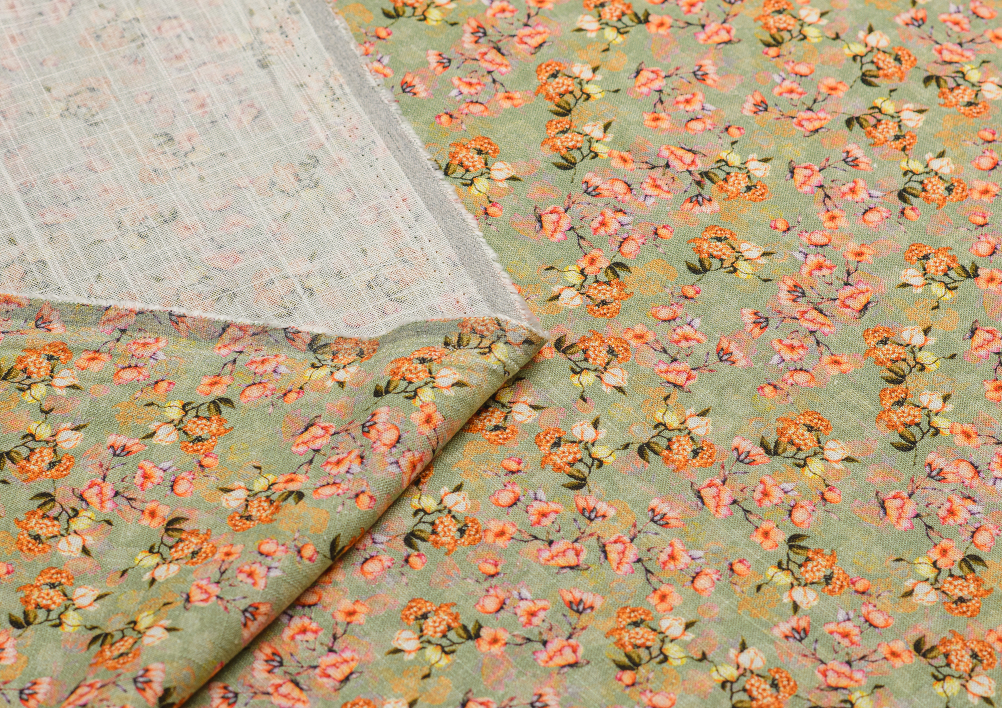 Ткань Лён Цветочки оранжевые на оливковом