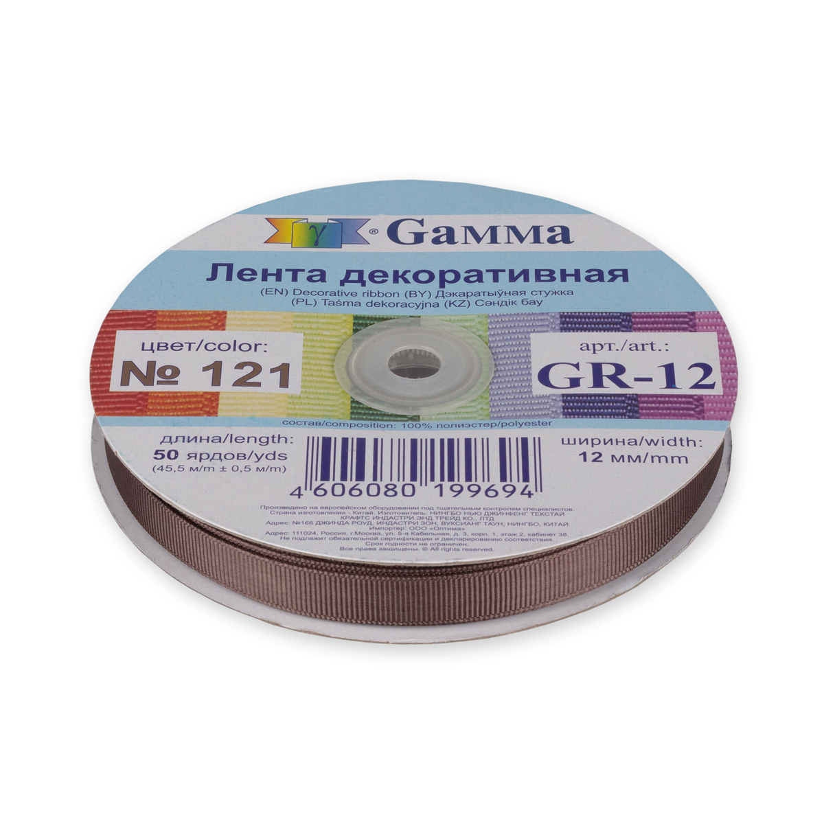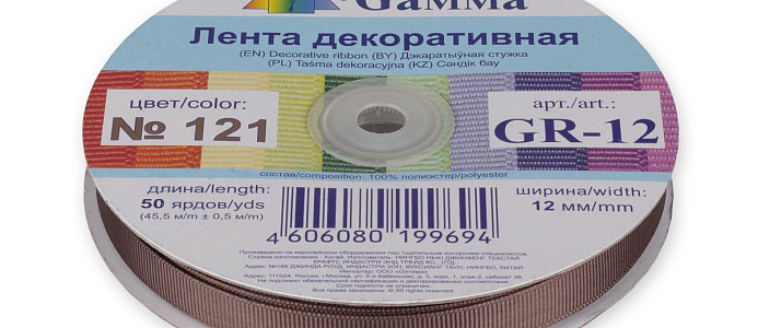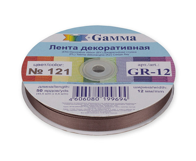 Лента репсовая шир.12 мм № 121 цв. серо-коричневый