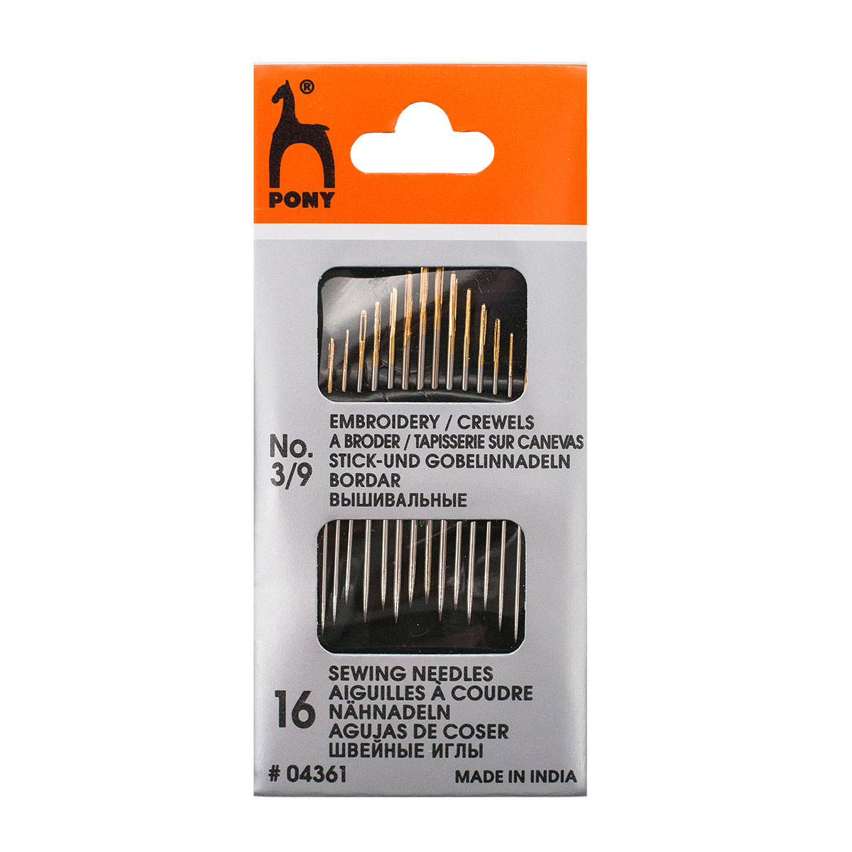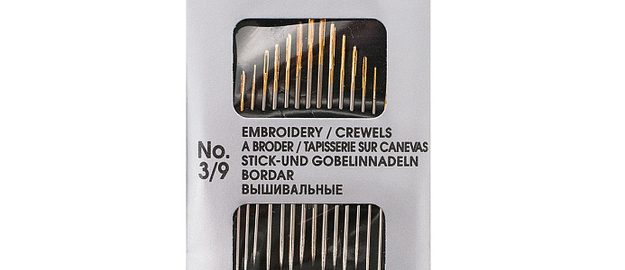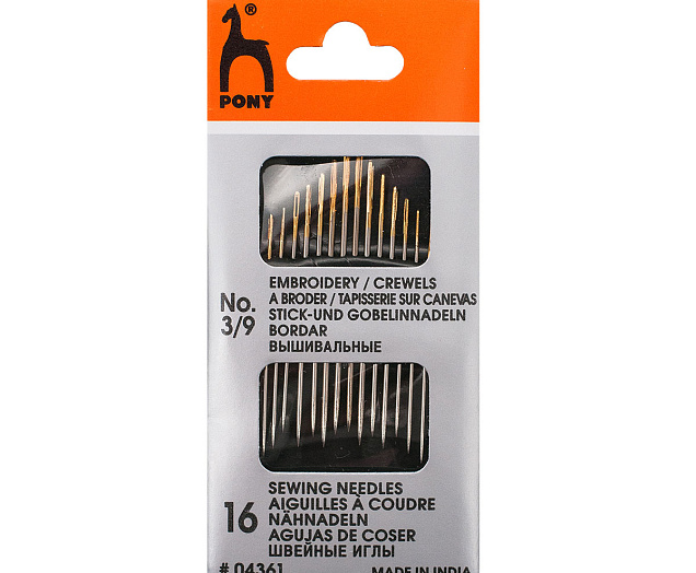 Набор Pony 'Embroidery/Crewels' включает в себя 16 стальных острых игл разных размеров. Набор предназначен для шитья, мелкого ремонта и вышивания в различных техниках. Благодаря гладкой поверхности, равномерной толщине и вытянутому ушку иглы идеально подходят для вышивания крестом или гобеленовым стежком. Ушко иглы позолочено, поэтому вдевать в него нить удобно даже при ослабленном зрении.