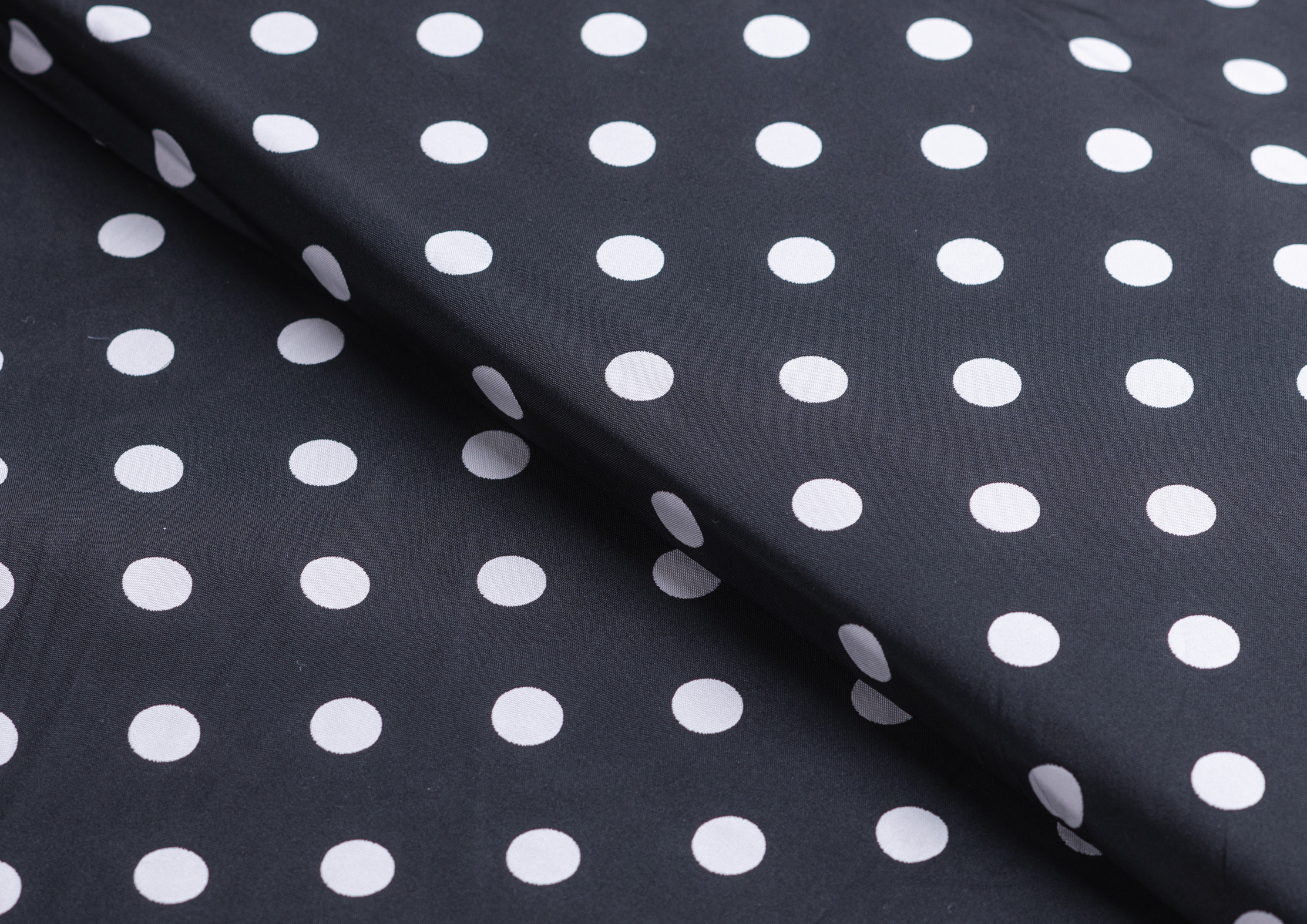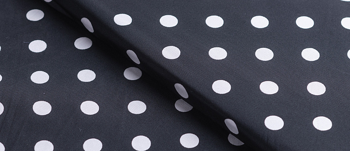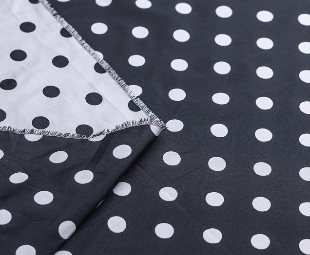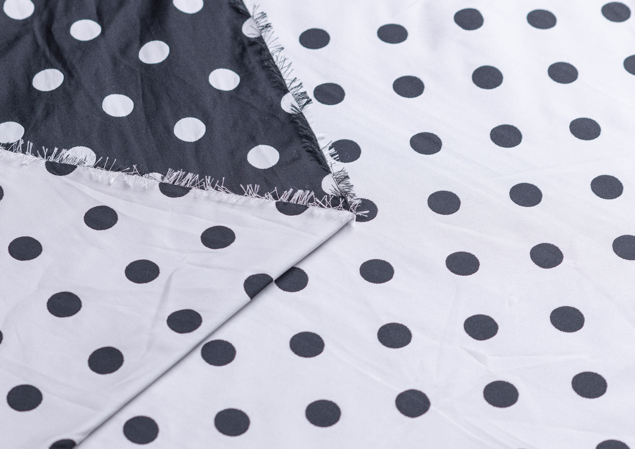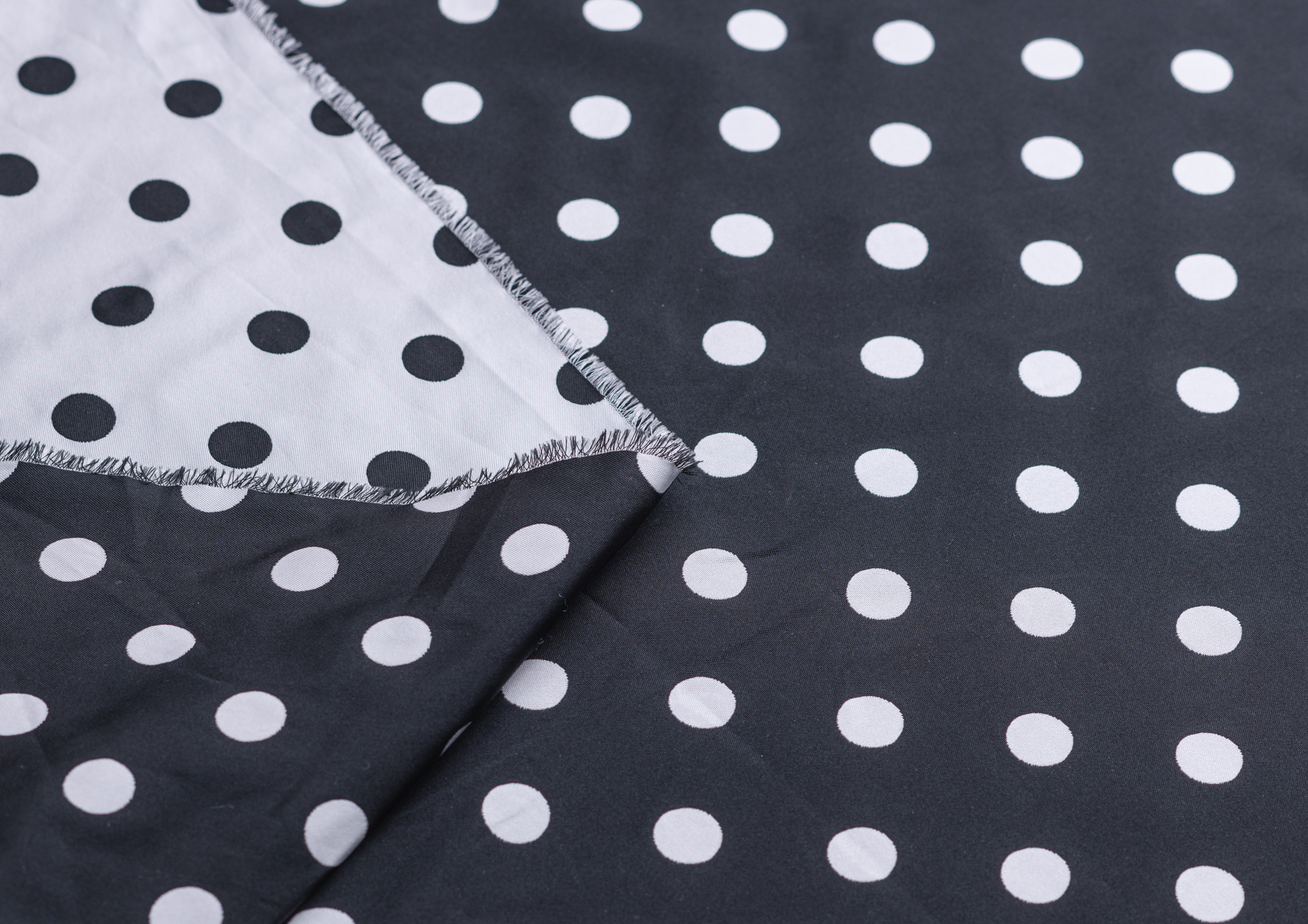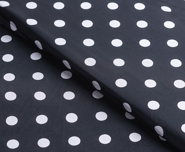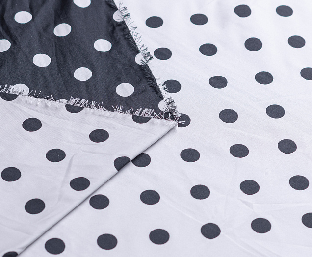 Двусторонняя ткань . Одна сторона черная в белый горошек . вторая белая в черный горошек . Подойдет для пошива легкой курточки , плаща , пышной юбки