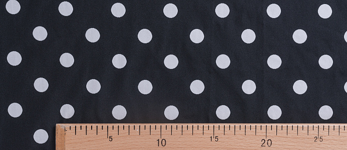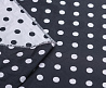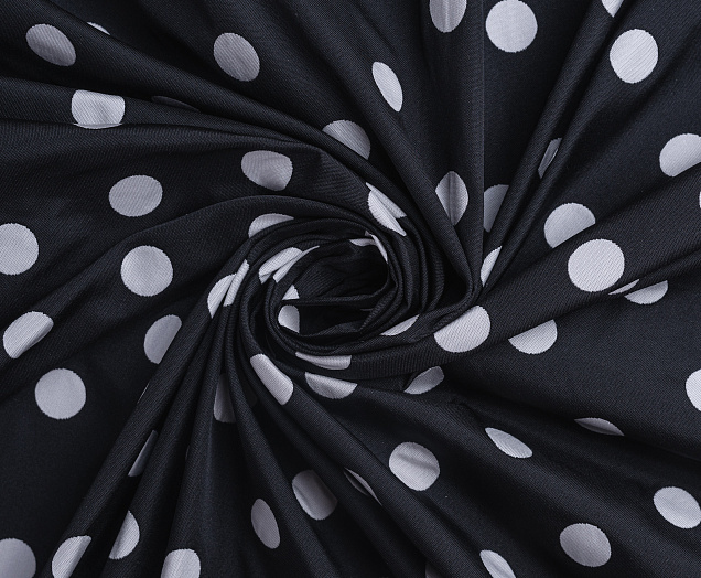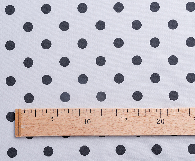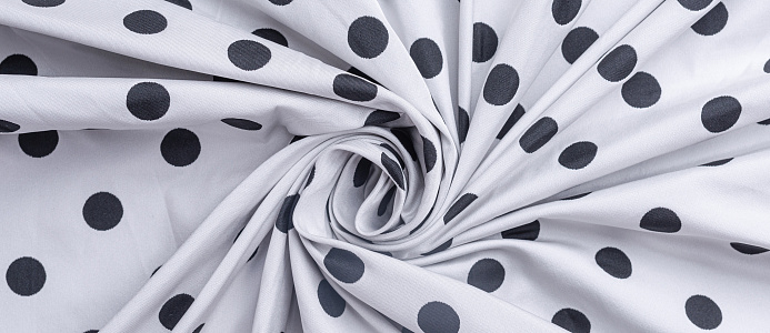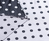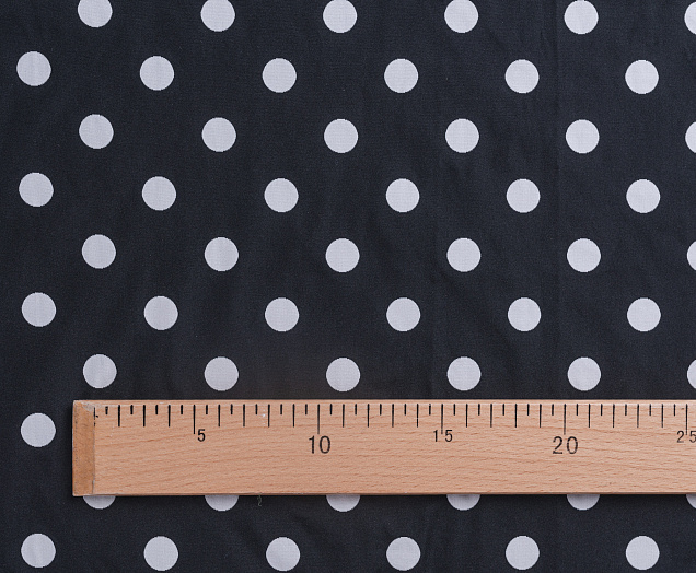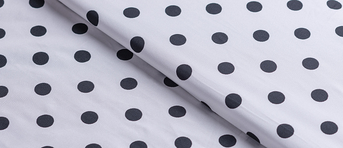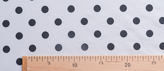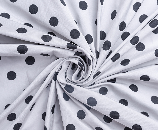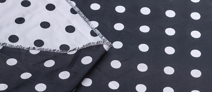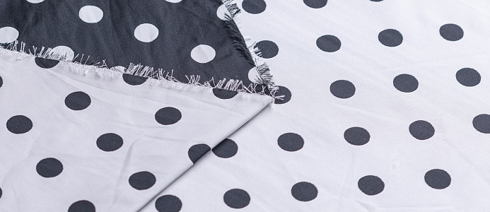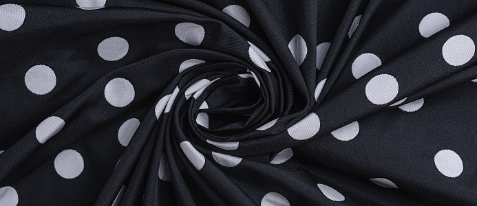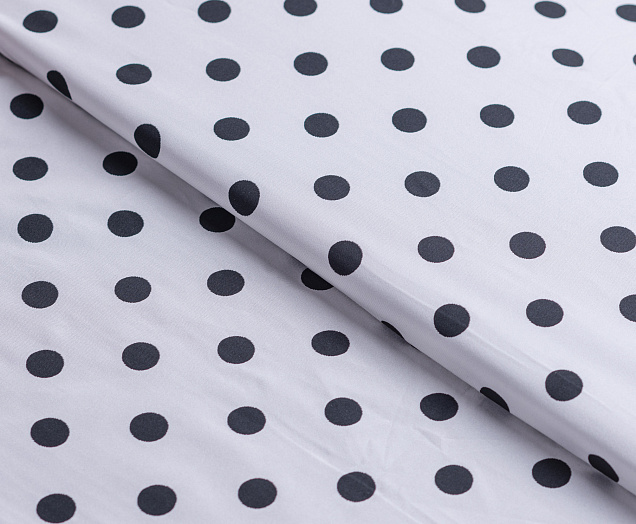 Двусторонняя ткань . Одна сторона черная в белый горошек . вторая белая в черный горошек . Подойдет для пошива легкой курточки , плаща , пышной юбки