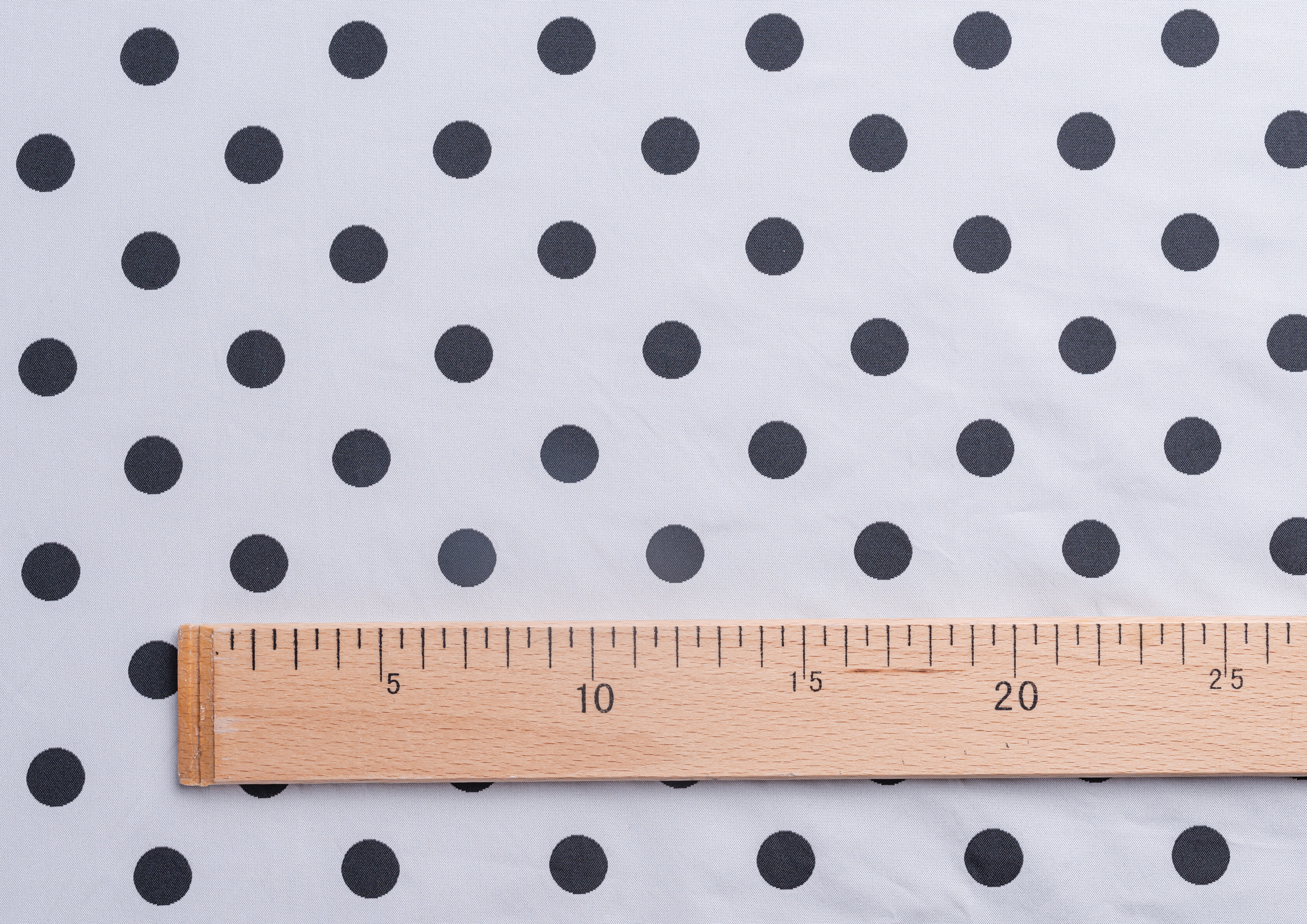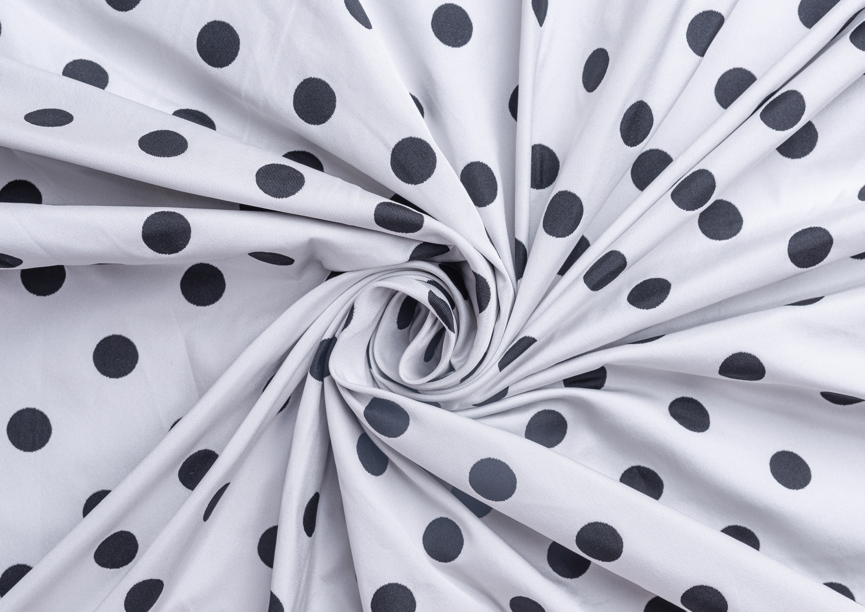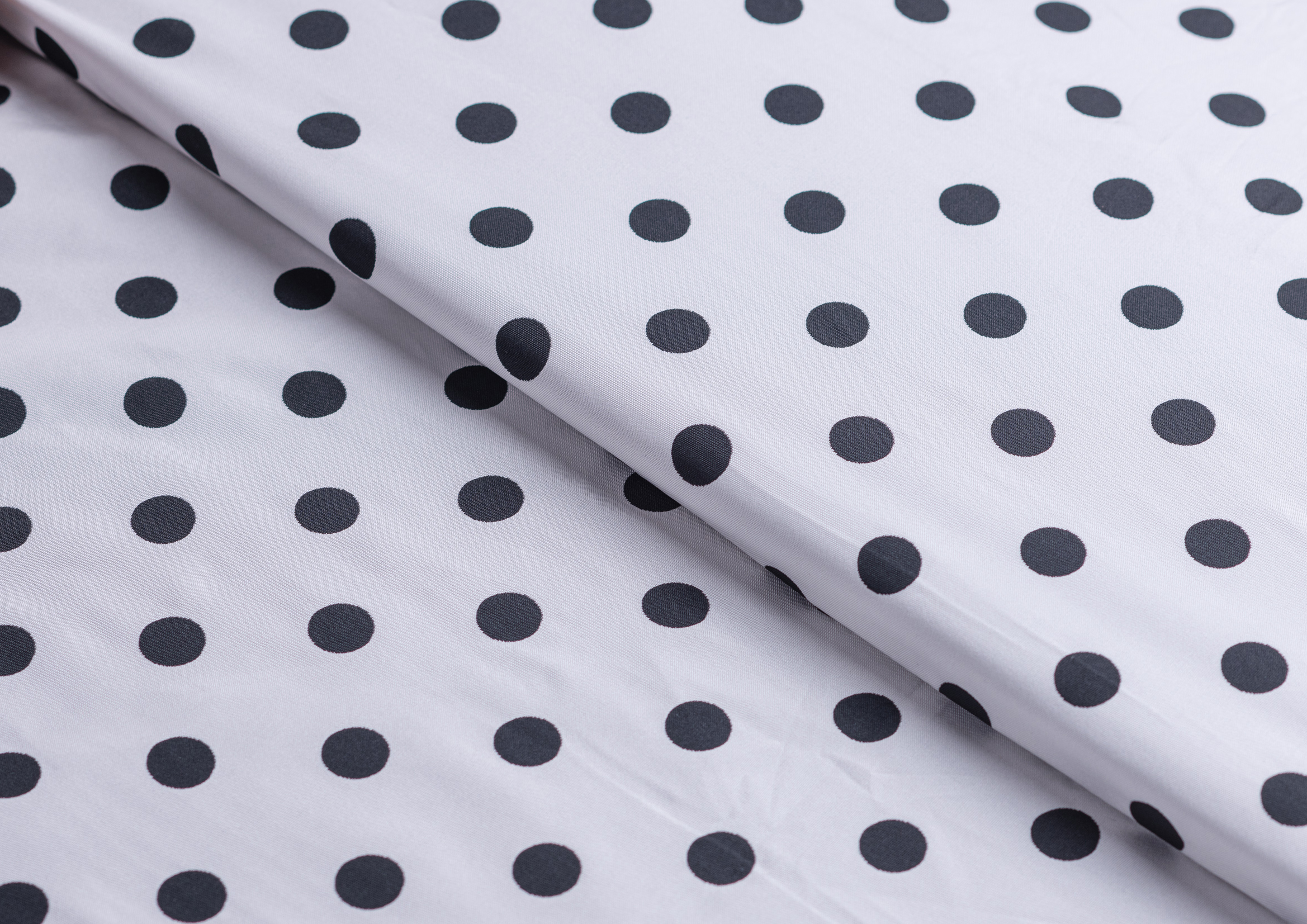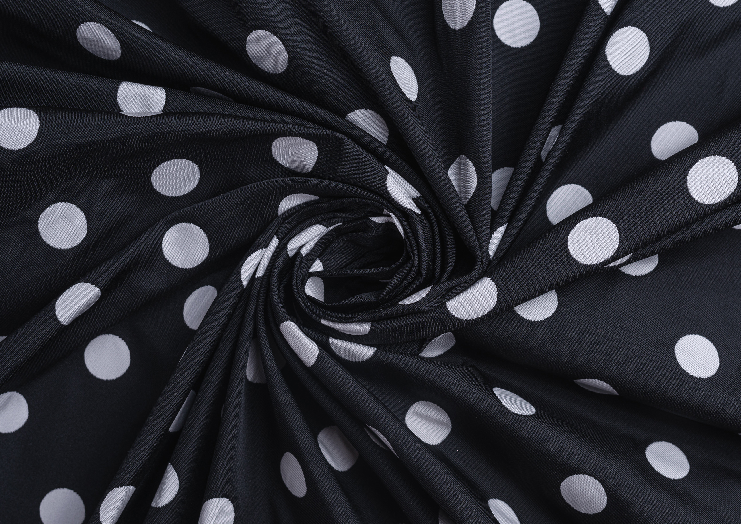 Двусторонняя ткань . Одна сторона черная в белый горошек . вторая белая в черный горошек . Подойдет для пошива легкой курточки , плаща , пышной юбки