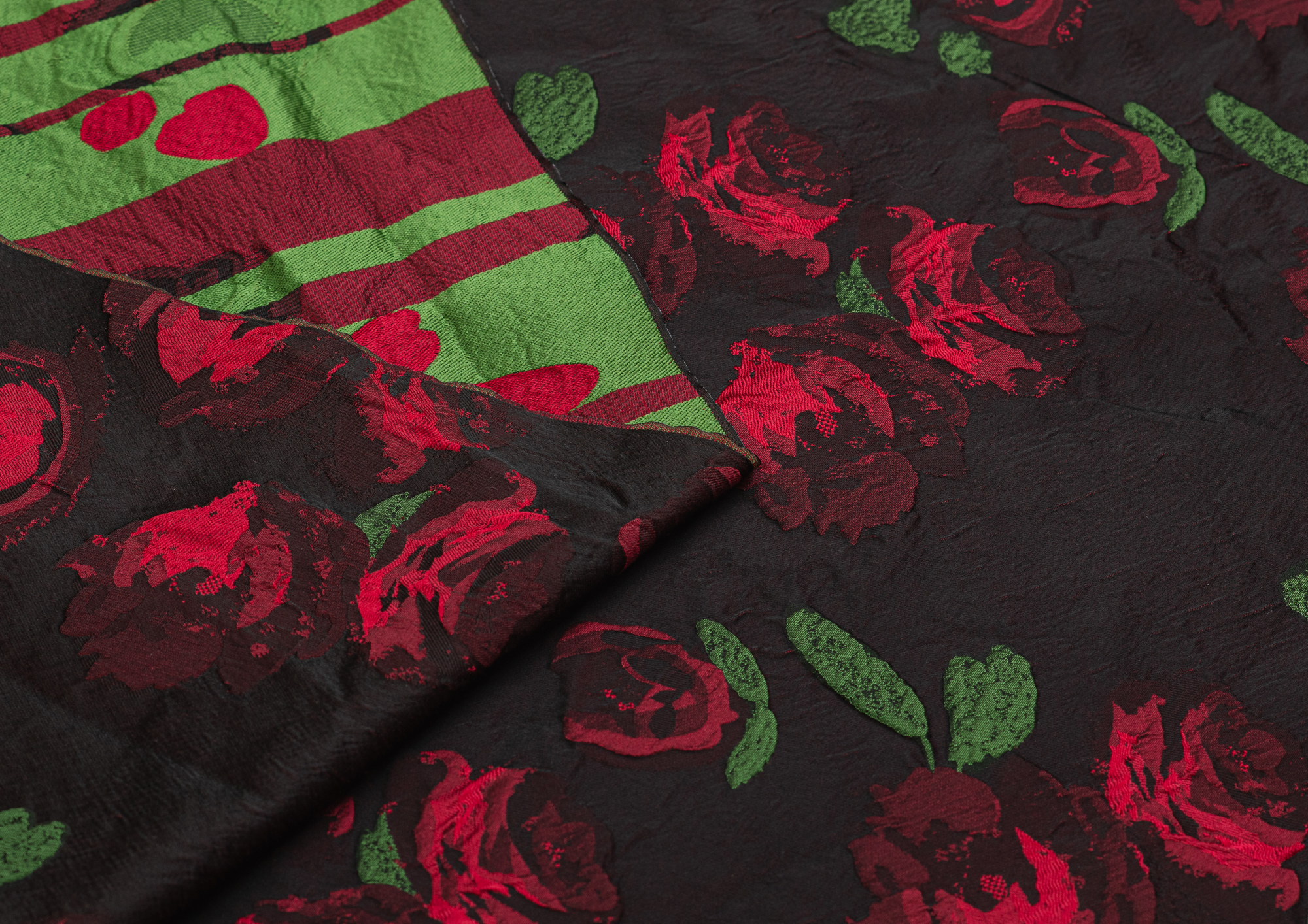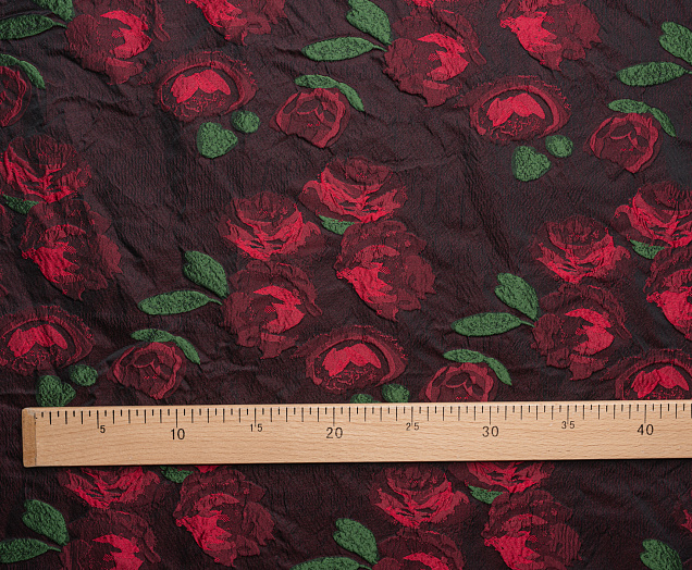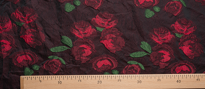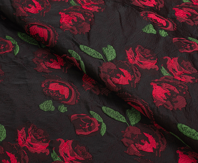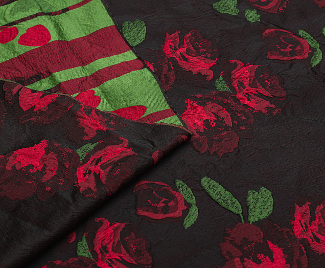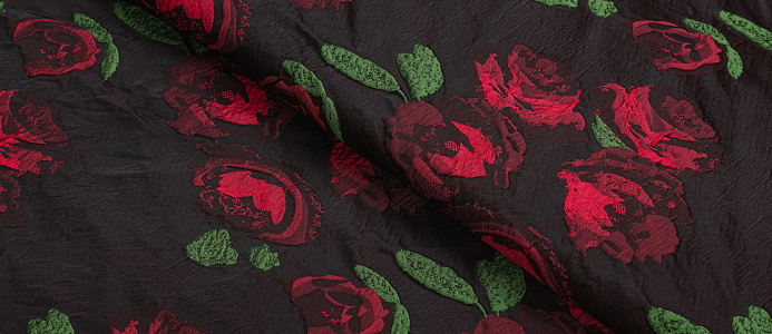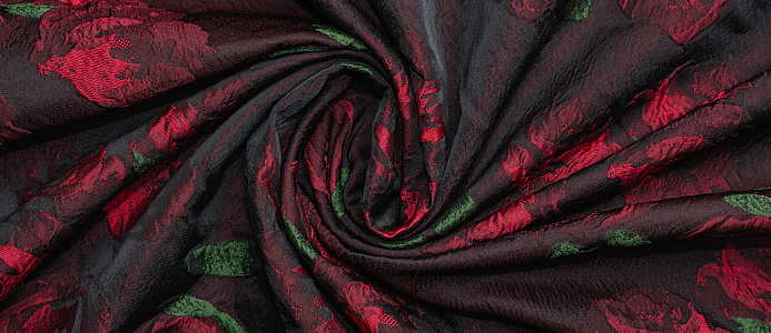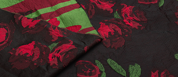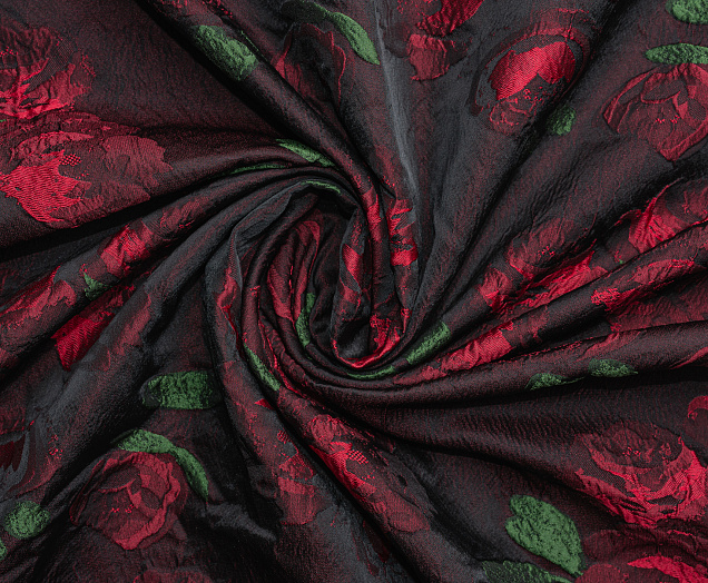 Гладкая ткань с рельефным рисунком . Полотно средней плотности , хорошо держит форму, отлично драпируется . Используется в пошиве праздничных нарядов, театральных костюмов , выпускных платьев .  Ткань в изделии выглядит очень эффектно .