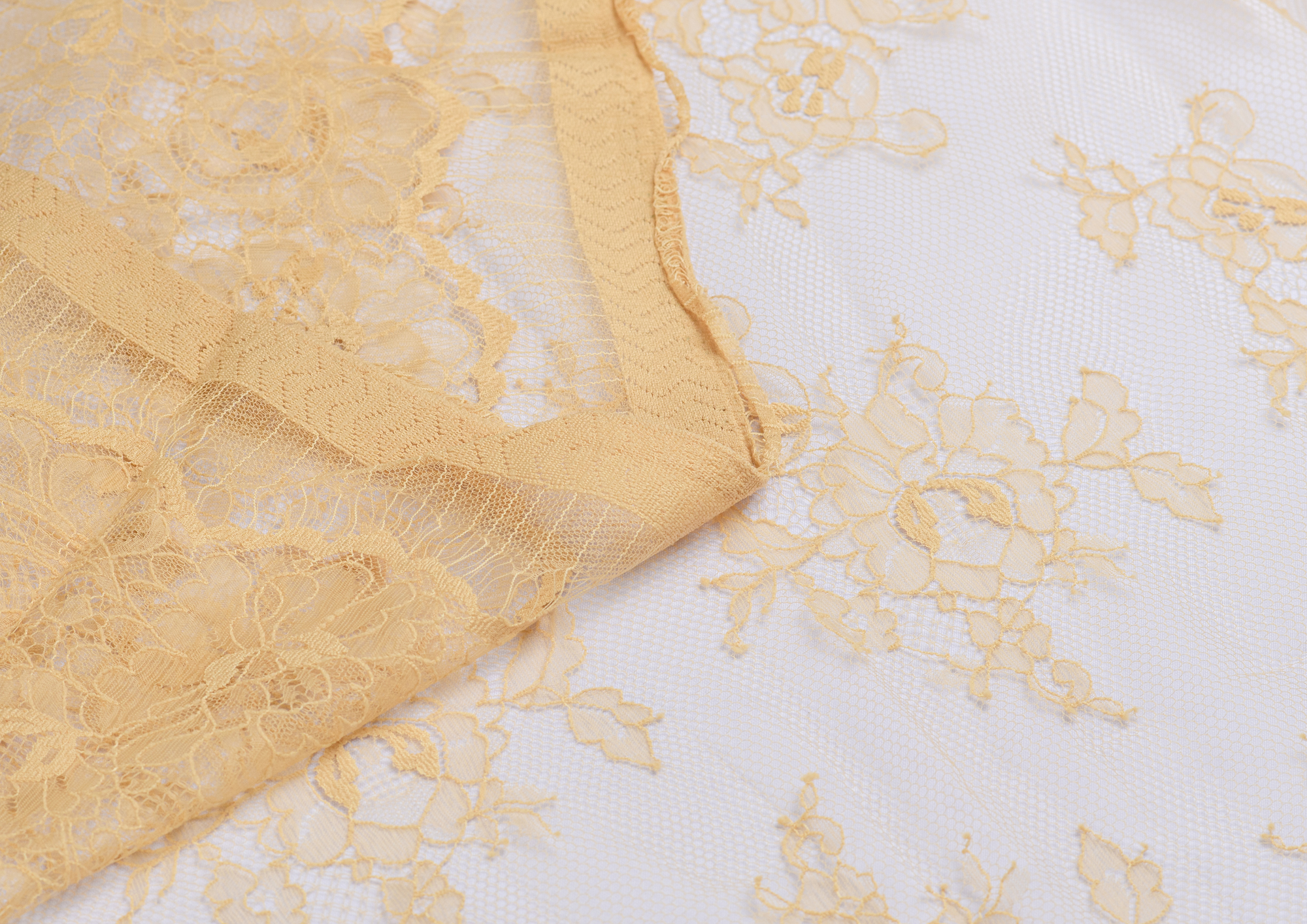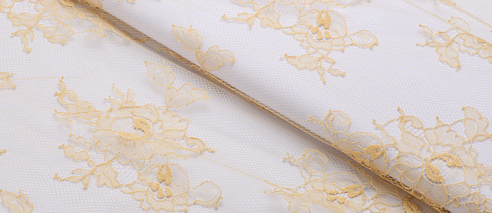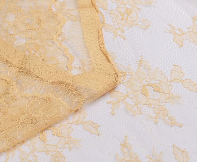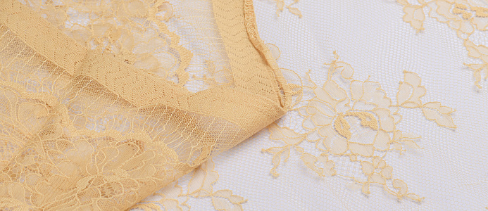 Кружево эластичное, по всем полотну равномерно расположен в тон орнамент. При пошиве требует подклада. Из кружево шьют нарядные, вечерние, торжественные платья, костюмы, так же пойдет для пошива нижнего женского белья.