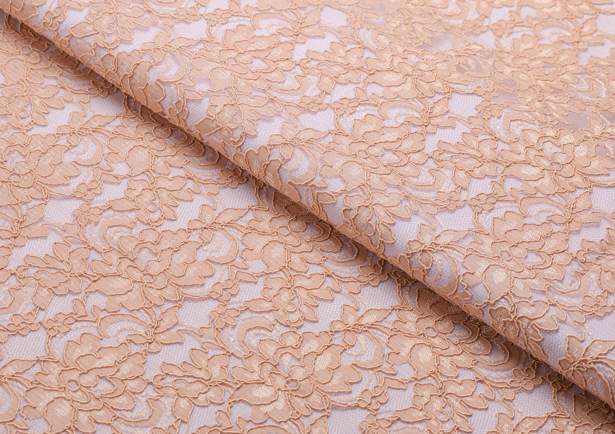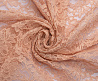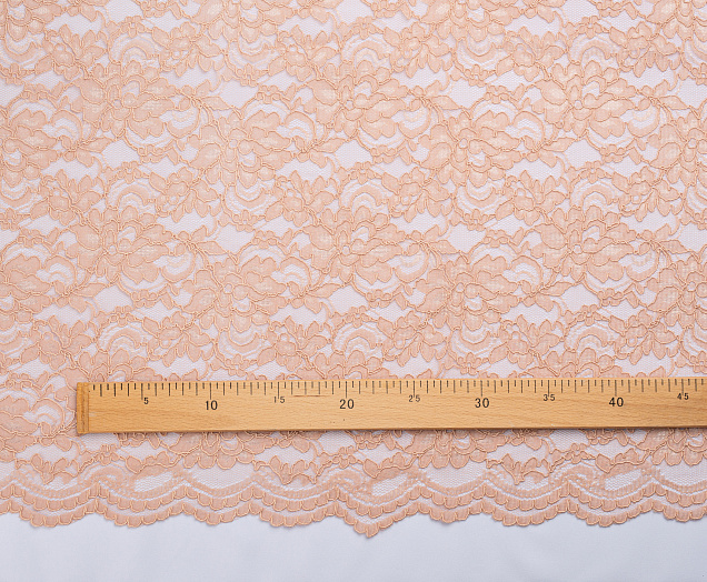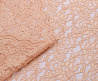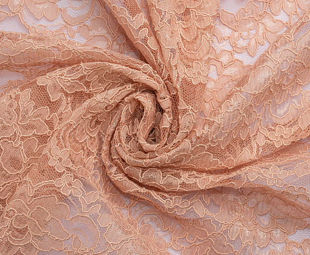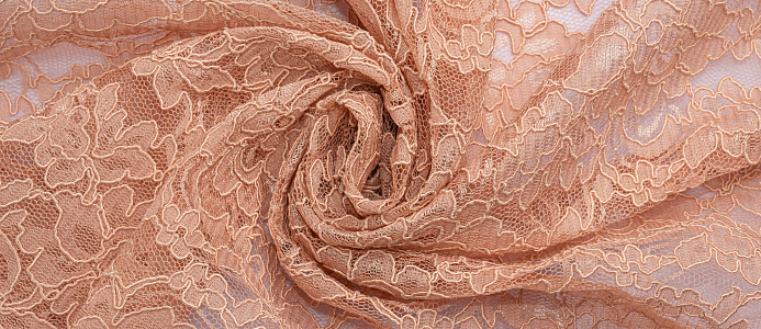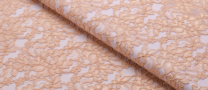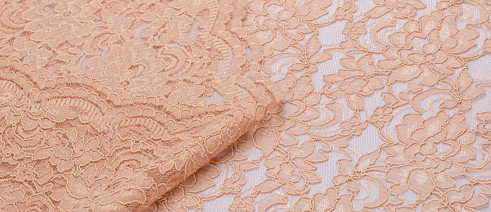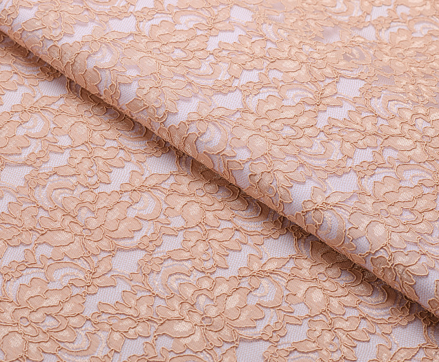 Кружево выполнена на эластичной, тонкой сеточке. По всем полотну равномерно расположен орнамент 3d. При пошиве требует подклада. Из кружево шьют нарядные, вечерние, торжественные платья, костюмы.