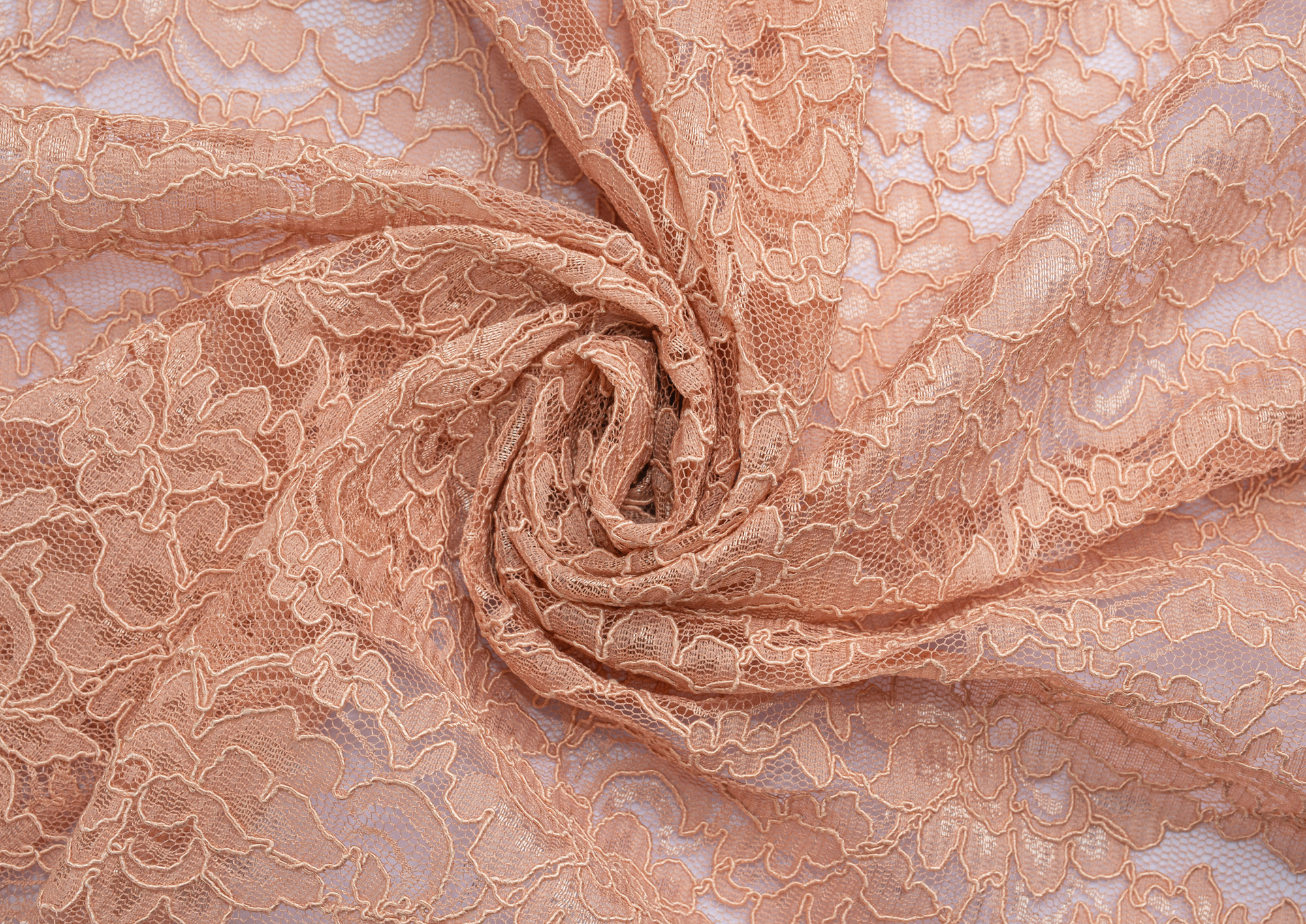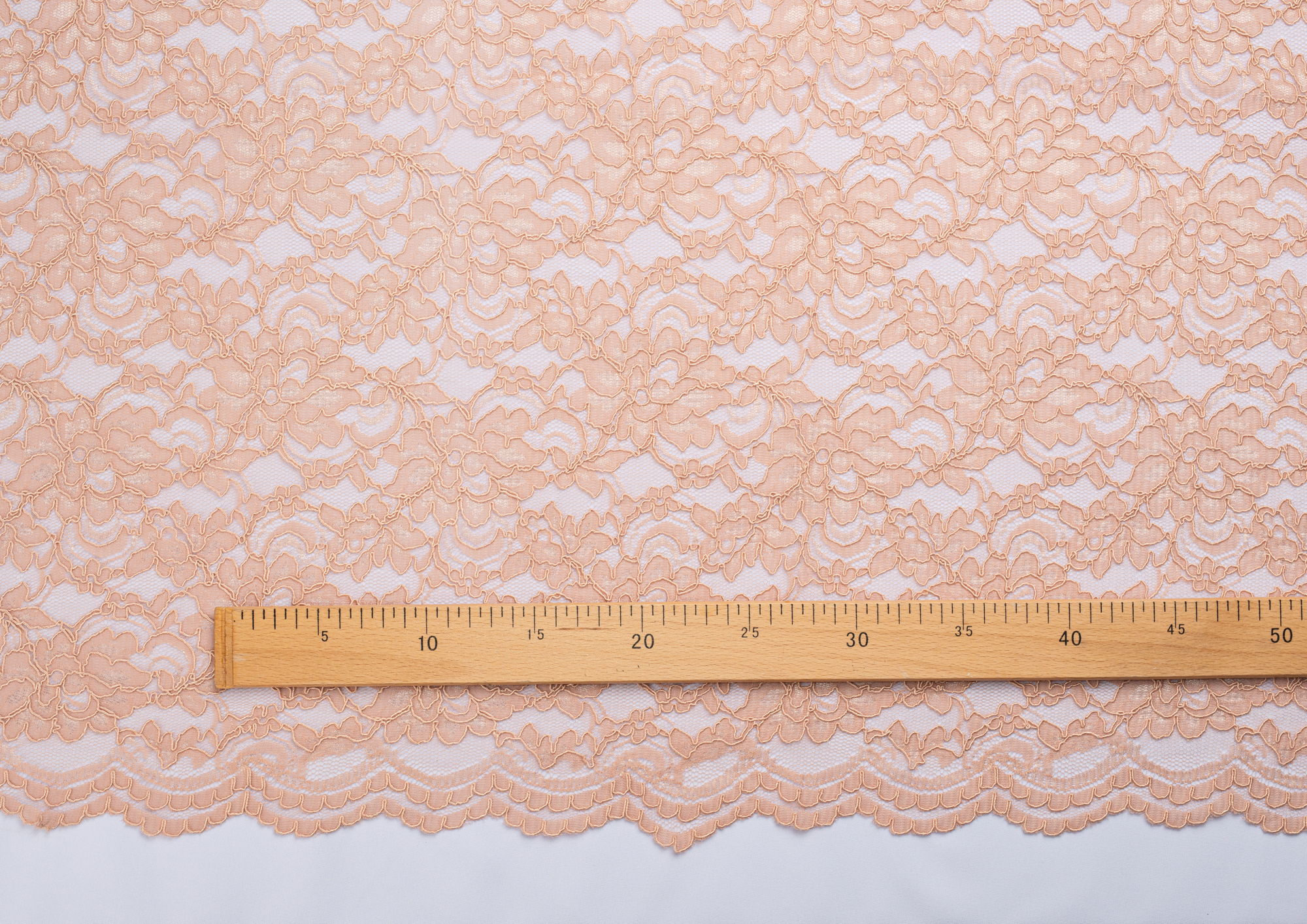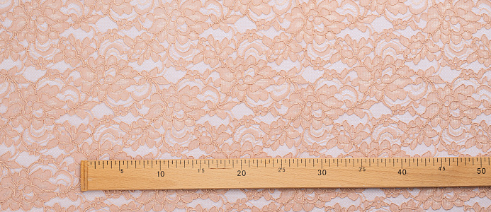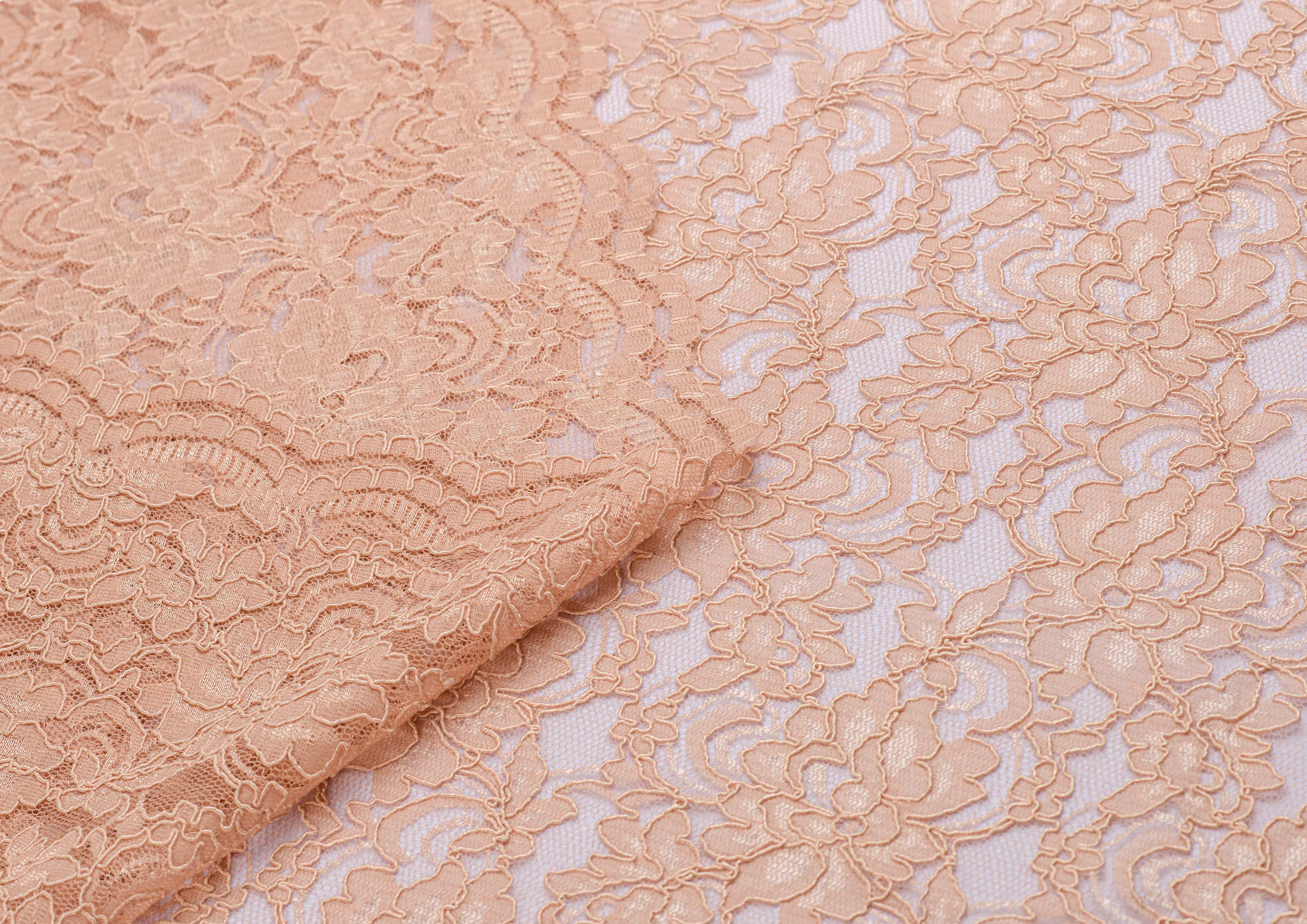 Кружево выполнена на эластичной, тонкой сеточке. По всем полотну равномерно расположен орнамент 3d. При пошиве требует подклада. Из кружево шьют нарядные, вечерние, торжественные платья, костюмы.