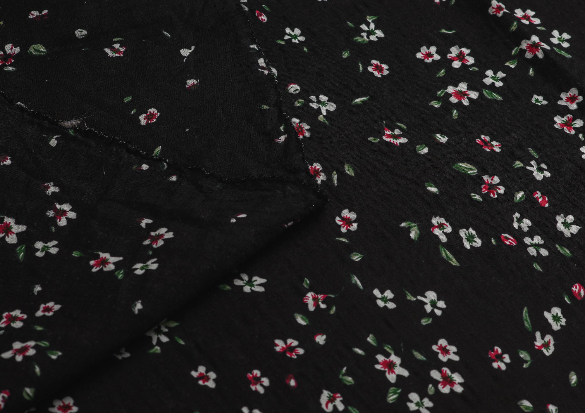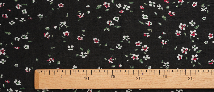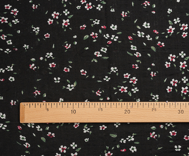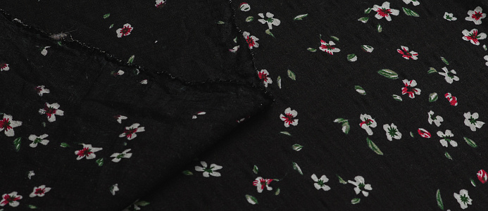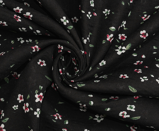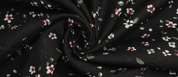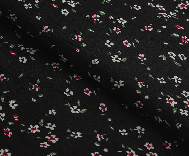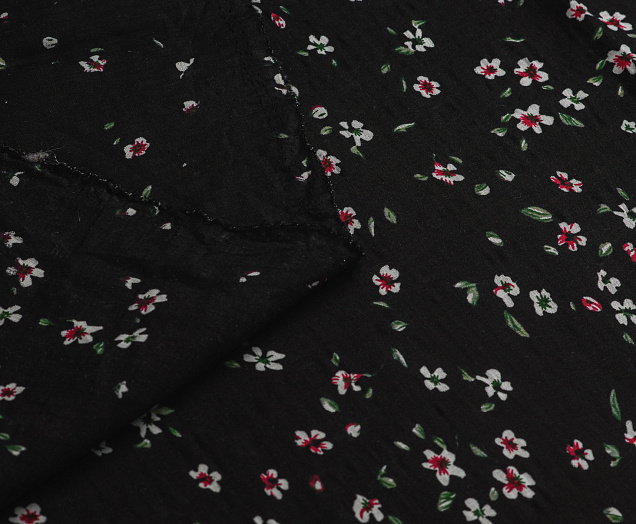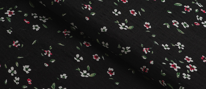 Ткань Штапель жатка принт Белые цветочки на черном